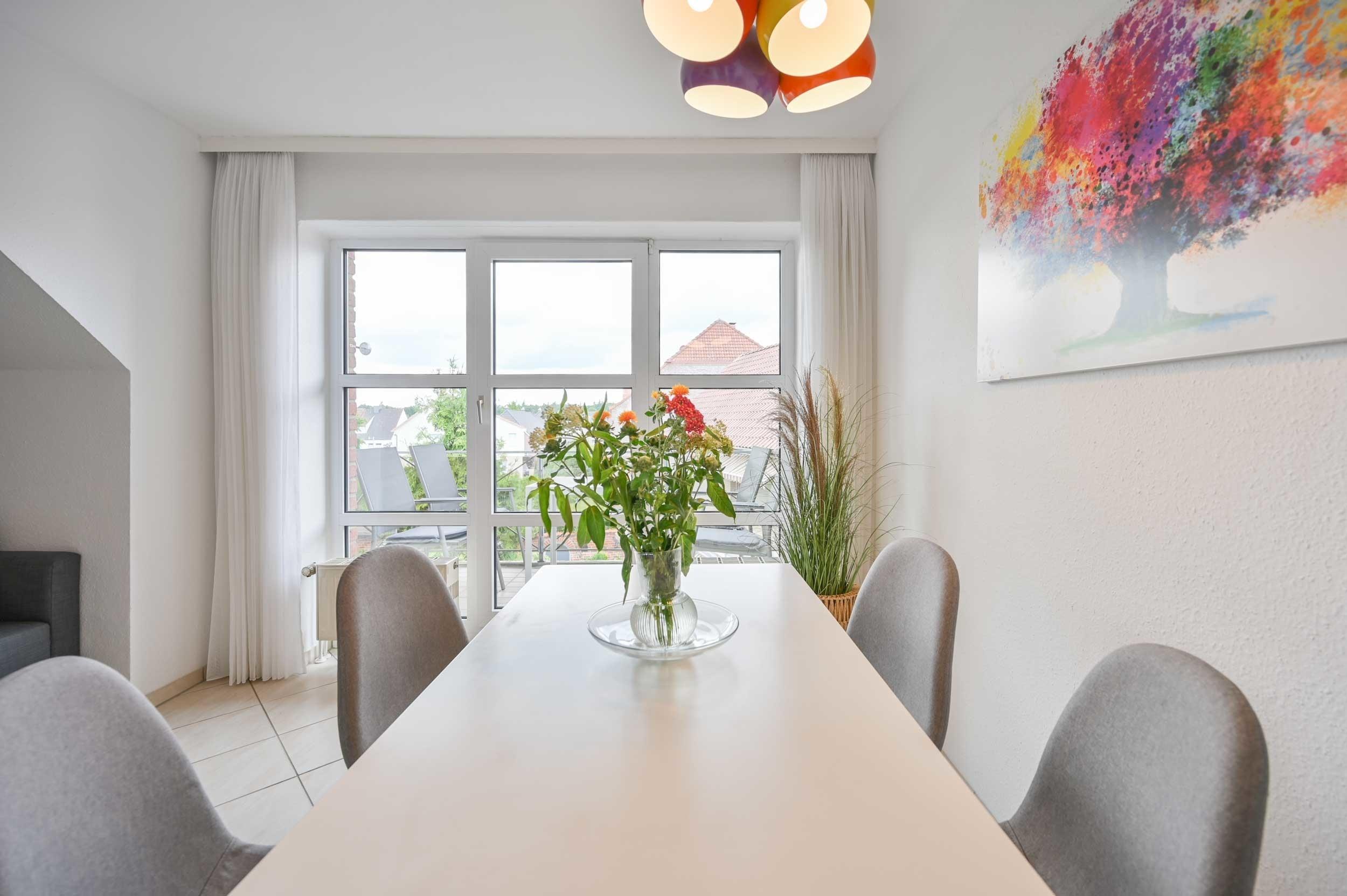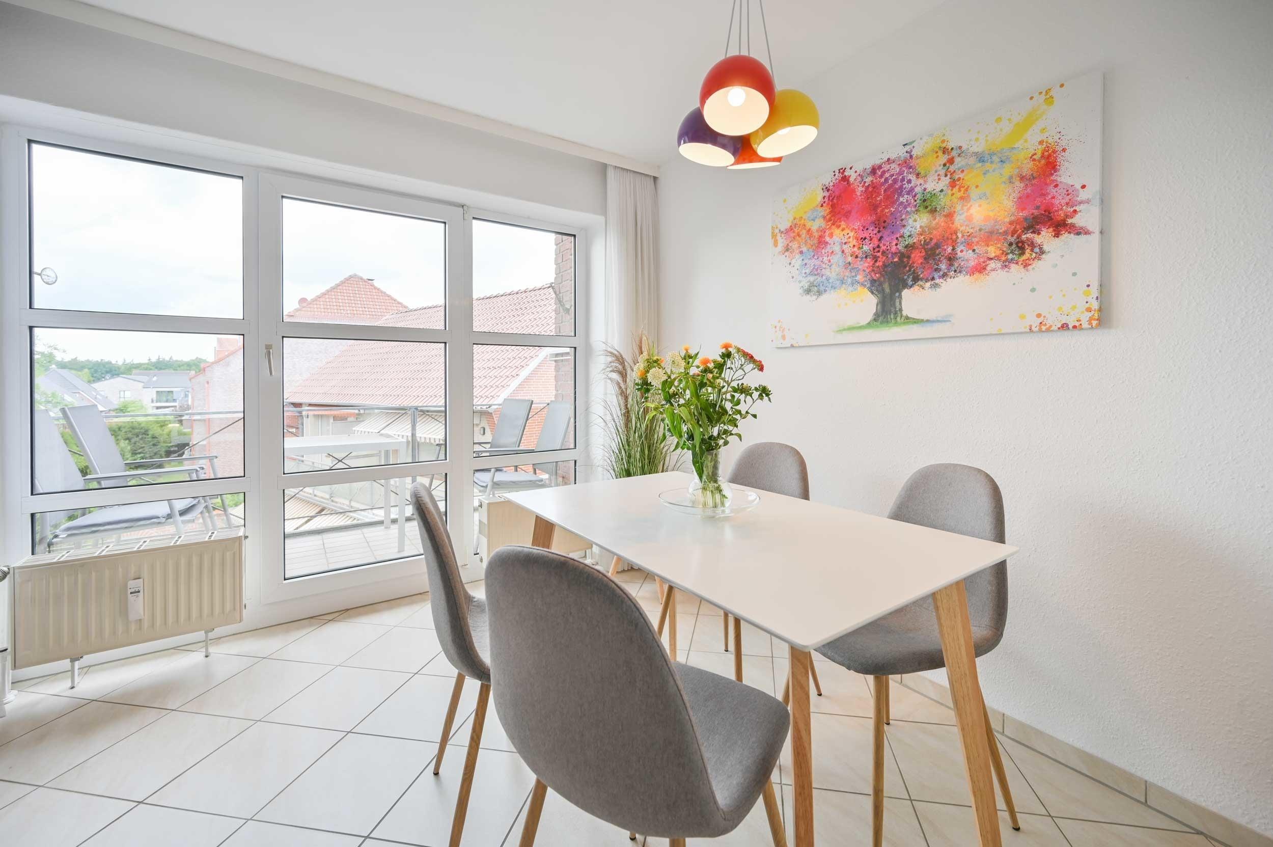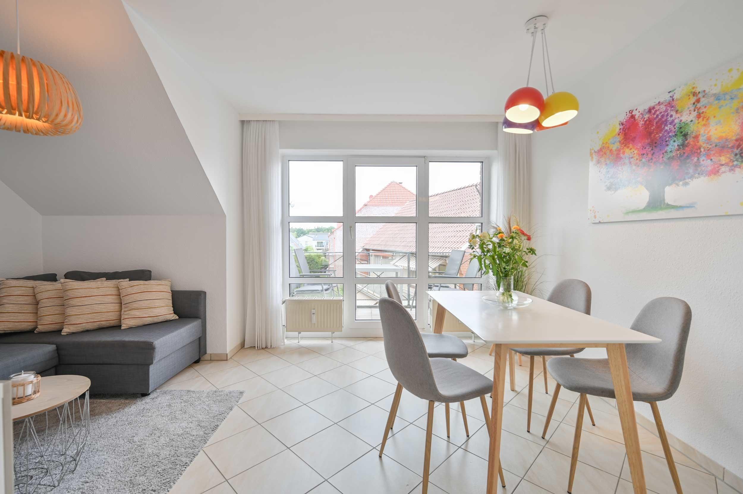 Das Wohnzimmer ist mit einem gemütlichen Ecksofa mit Schlaffunktion und einem internetfähigem Fernseher ausgestattet. Ebenso befindet sich im Wohnzimmer ein separater Essbereich. Von hier aus haben Sie Zugang zum möblierten, westlich ausgerichteten Balkon. Hier können Sie gemütlich beim Sonnenuntergang den Tag ausklingen lassen.