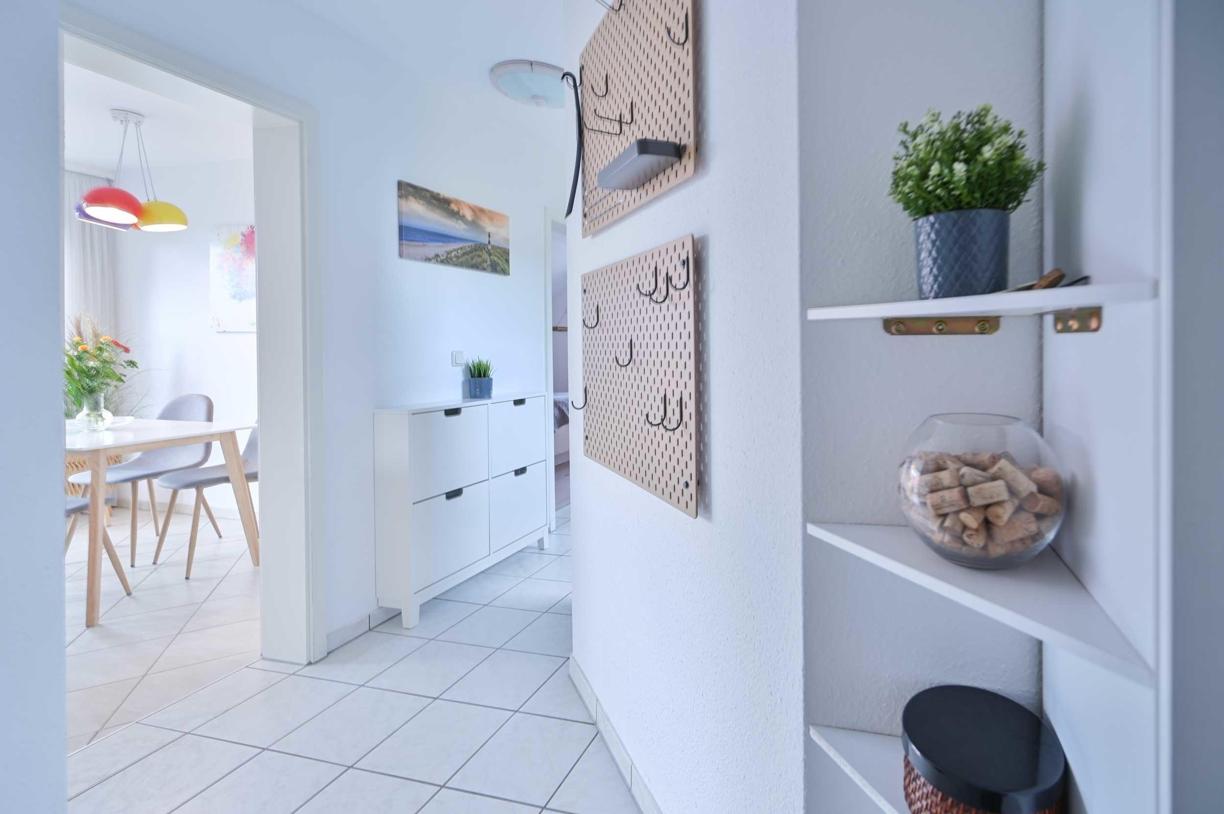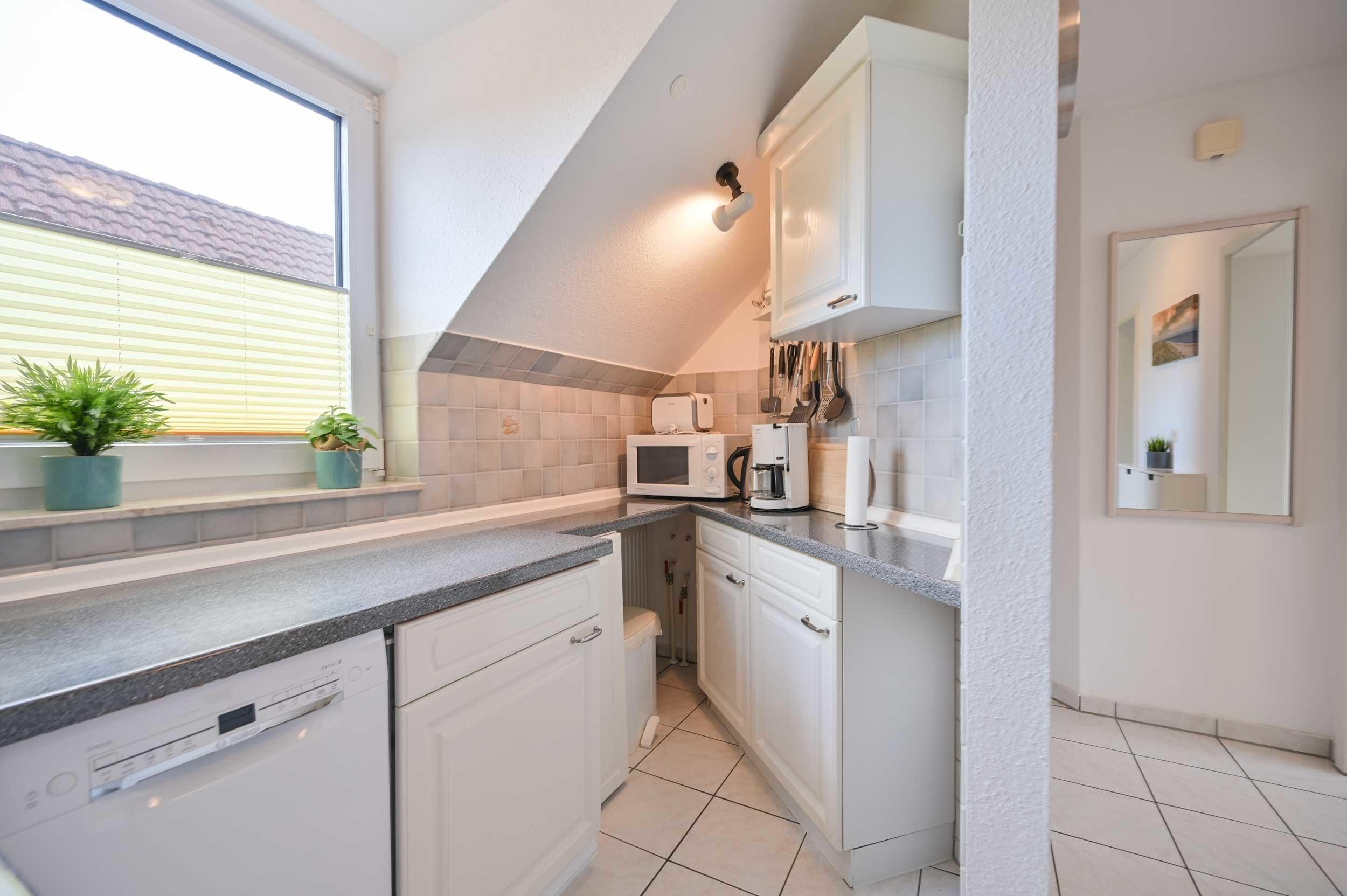 Die Küche ist dem Flurbereich angeschlossen und für den Ostseeurlaub gut ausgestattet. Hier finden Sie einen Herd mit Backofen, Geschirrspüler, Kaffeemaschine, Mikrowelle und vieles mehr. So können Sie sich ganz wie zu Hause fühlen.