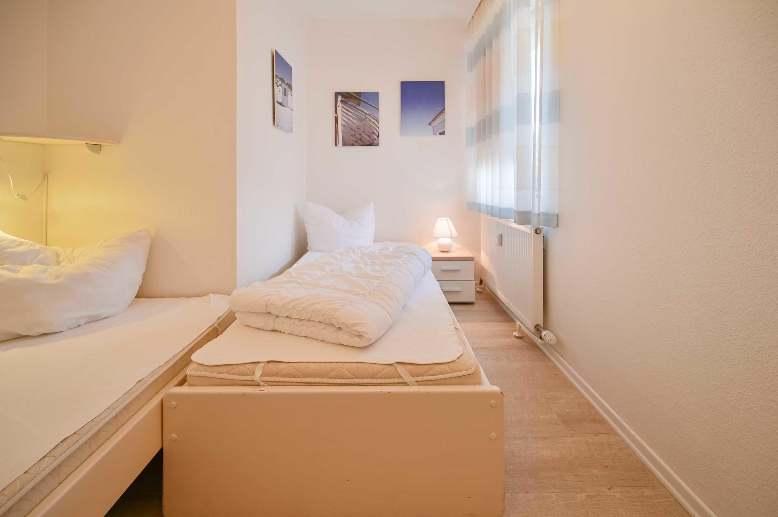 Ebenfalls bietet Ihnen die Wohnung ein separates Schlafzimmer. Dieses ist mit zwei getrennt stehenden Betten (2,00 x 1,00) möbeliert.