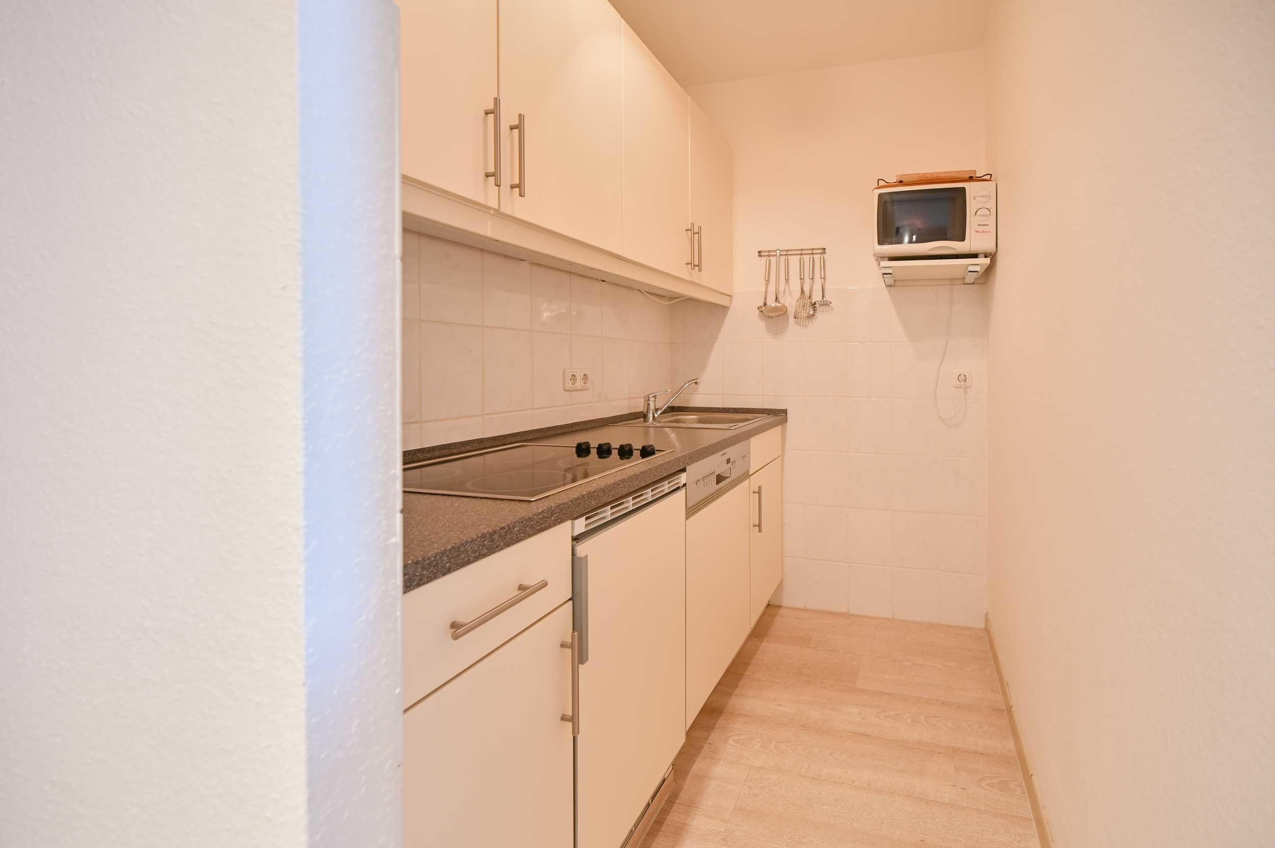 Die Einbauküche befindet sich separat vom Wohnbereich und verfügt über einen 4-Platten-Herd, eine Spülmaschine, eine Mikrowelle, eine Kaffeemaschine, einen Wasserkocher, einen Toaster und viele weitere Extras.