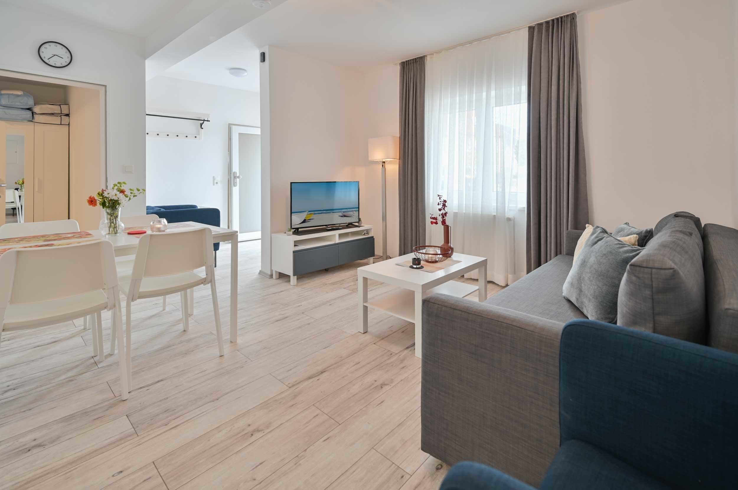Wohnraum mit gemütlichem Schlafsofa, Couchtisch, TV-Möbel mit Flat-TV und Esstisch mit 4 Stühlen.