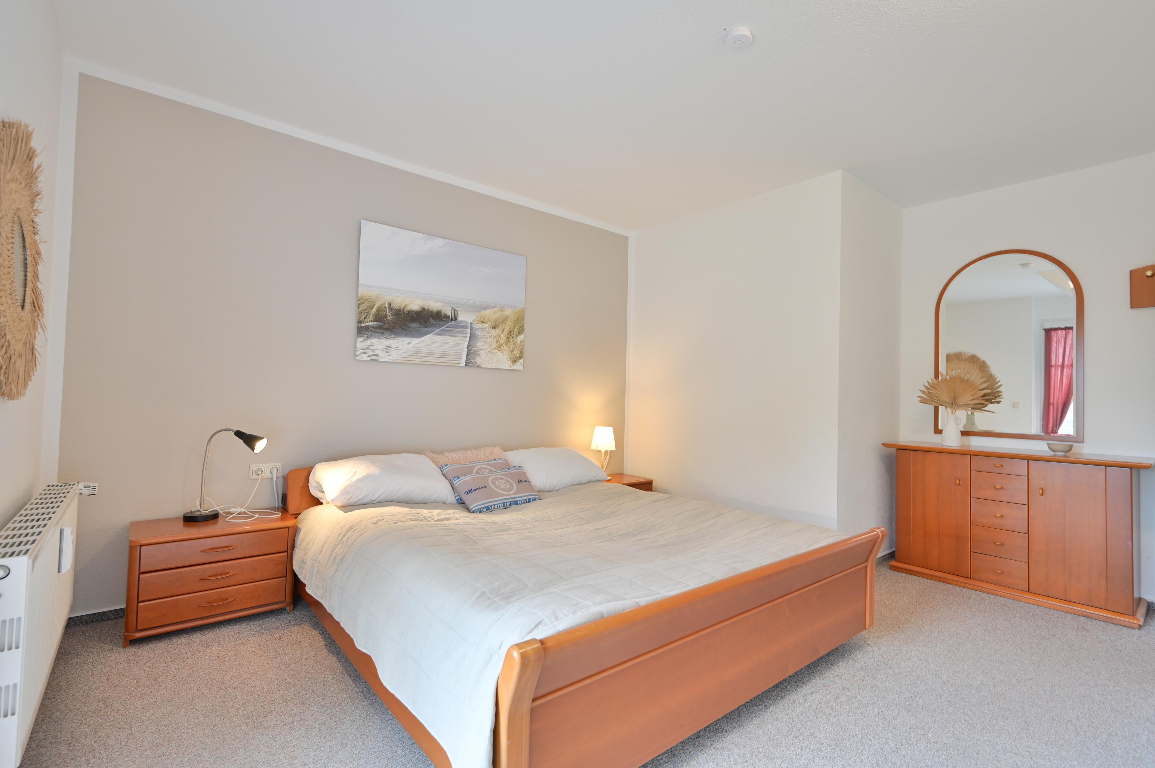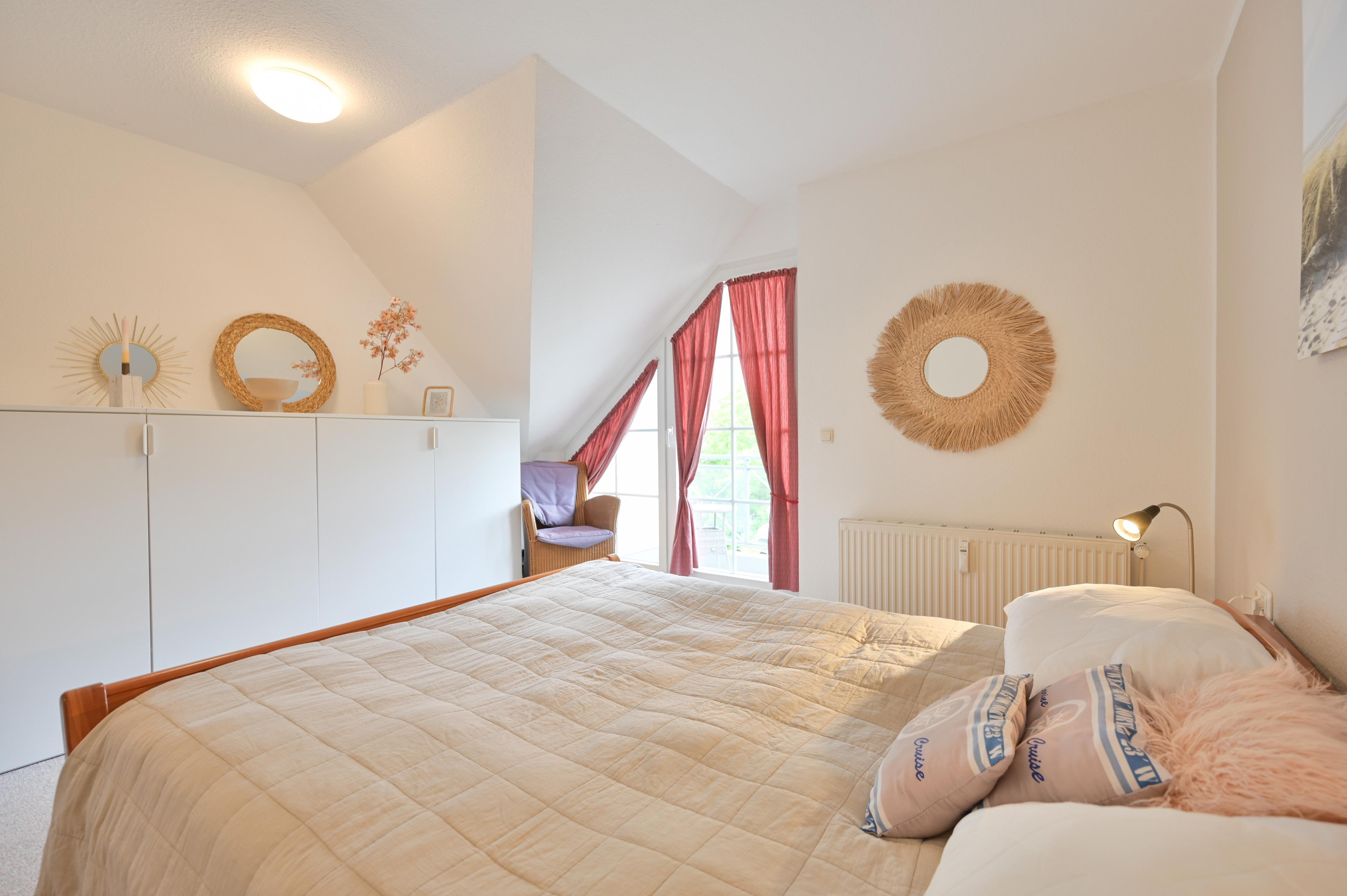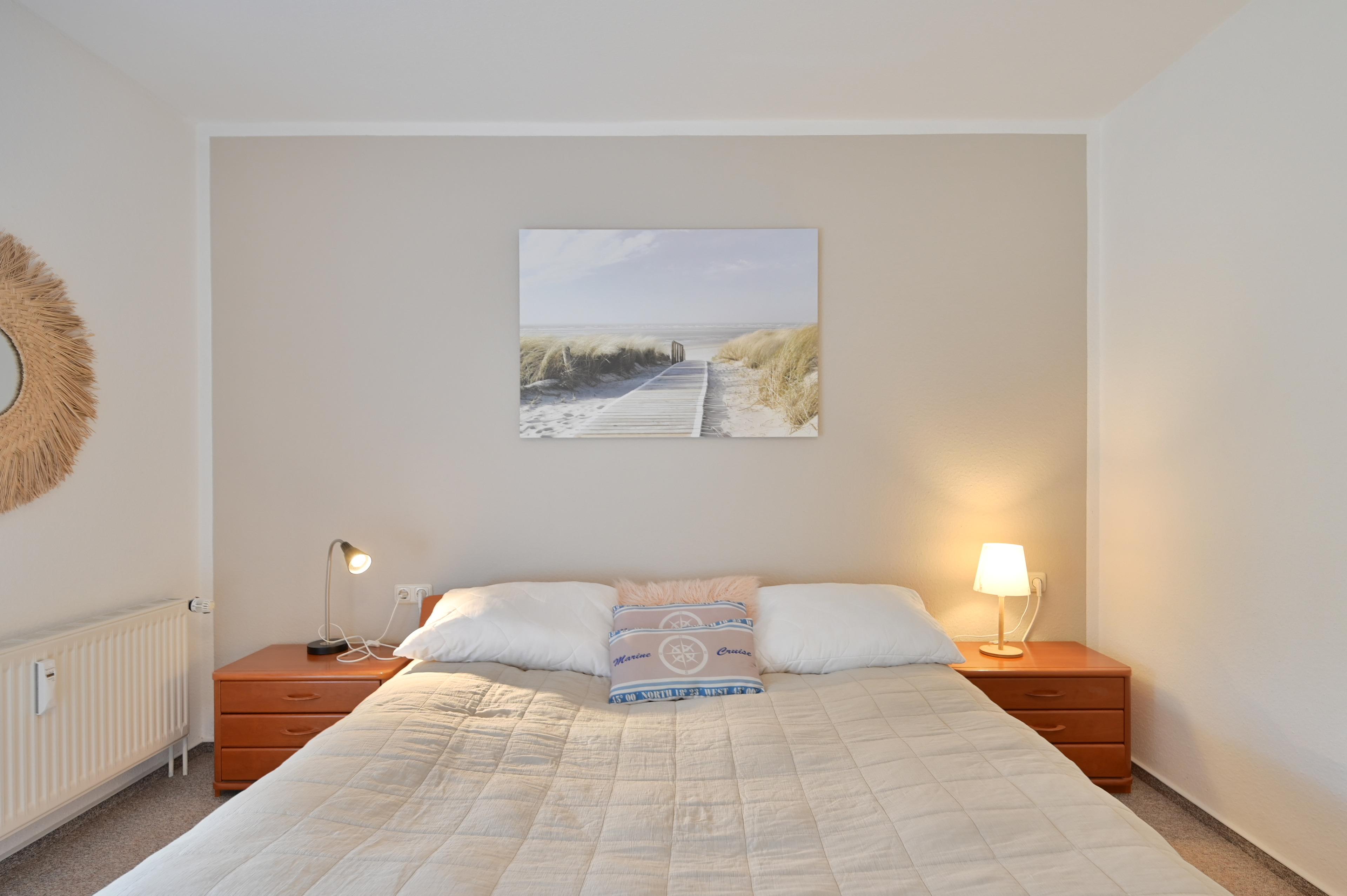 Im Schlafzimmer auf der ersten Etage befindet sich ein gemütliches Doppelbett.