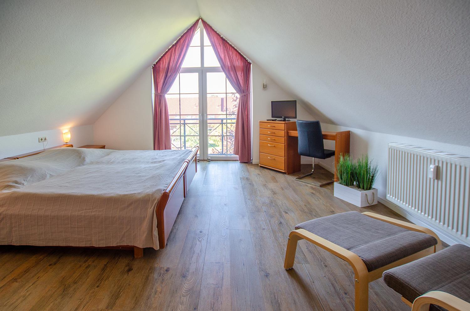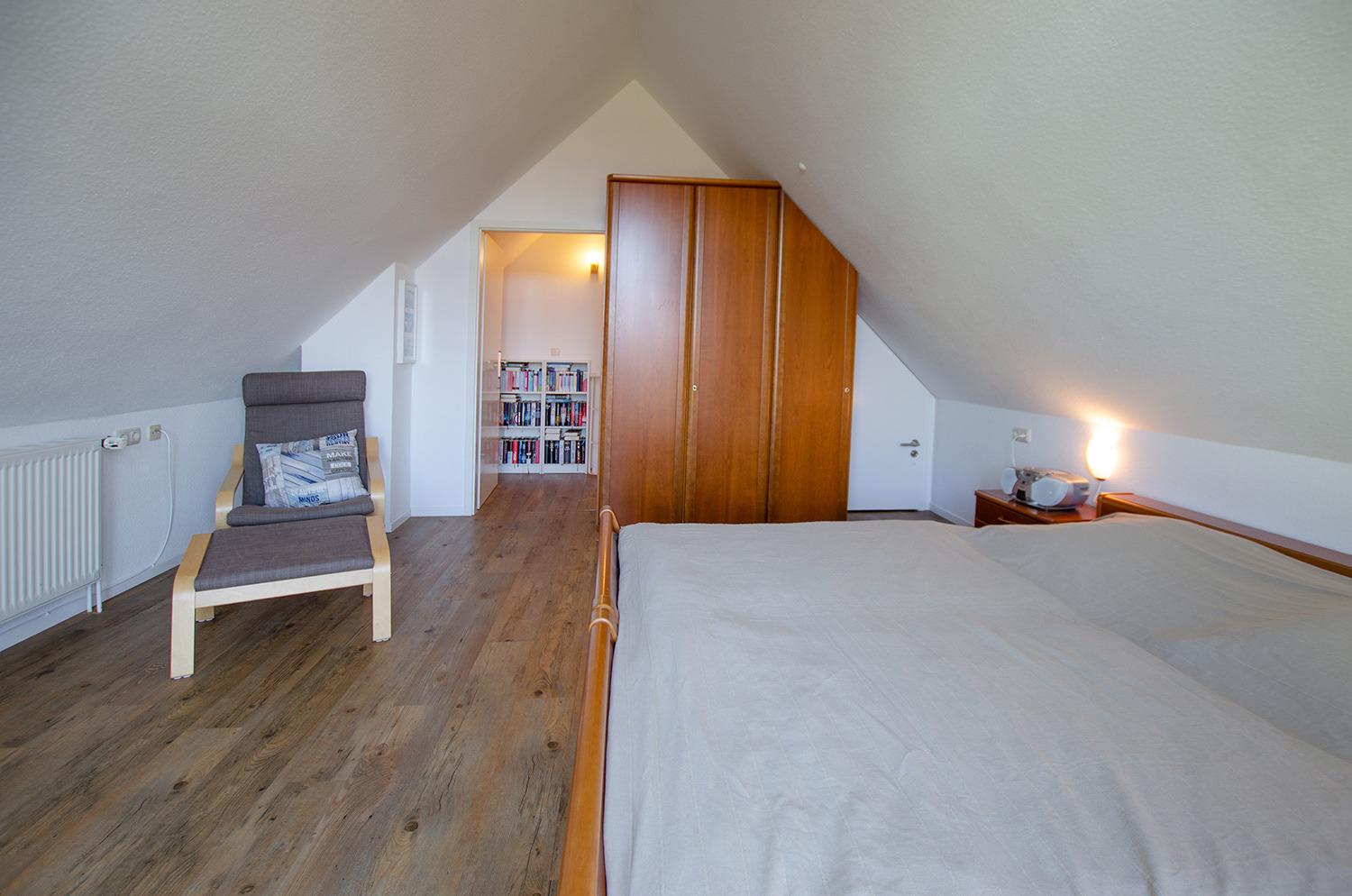 Im Galeriegeschoss gibt es ein weiteres separates Schlafzimmer mit einem französischen Balkon, zwei zusammenstehenden Einzelbetten, Nachttischen, Kleiderschrank, Lesesessel und einem 2. Fernseher. Dieses ca. 18 qm große Zimmer mit bodentiefen Fenstern kann durch Thermo-Sonnenschutz-Plissees abgedunkelt werden.