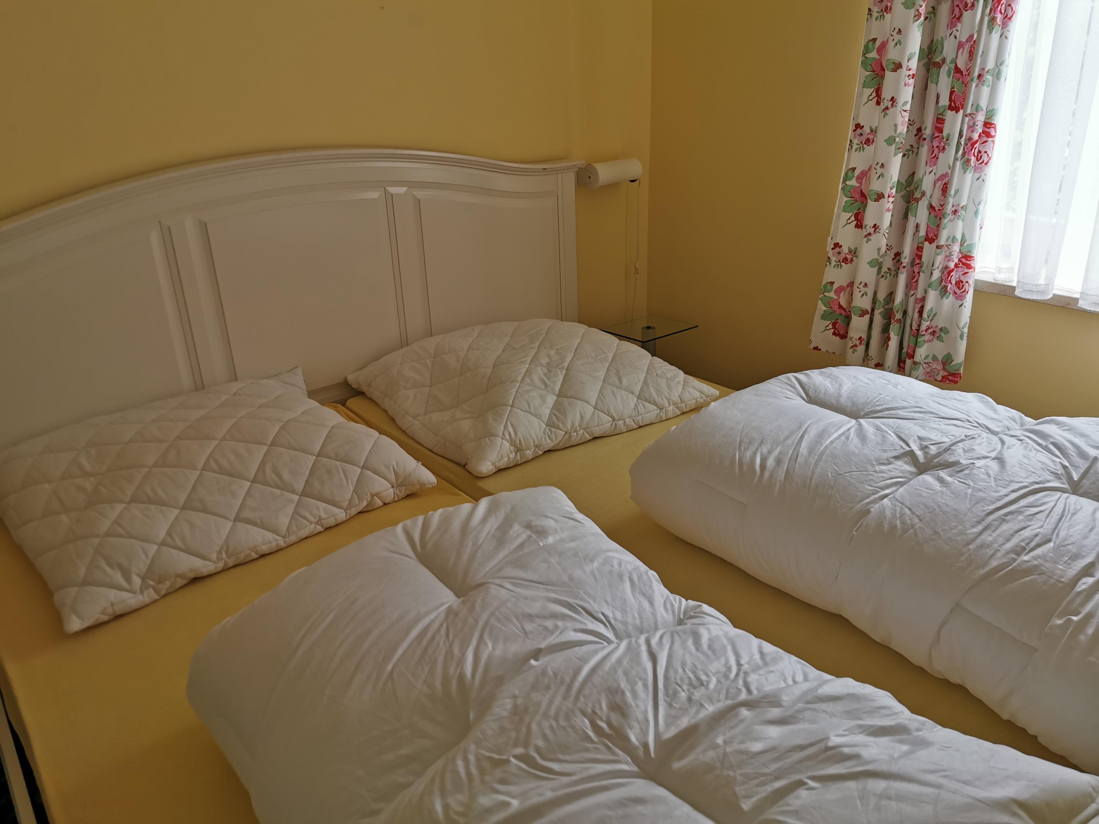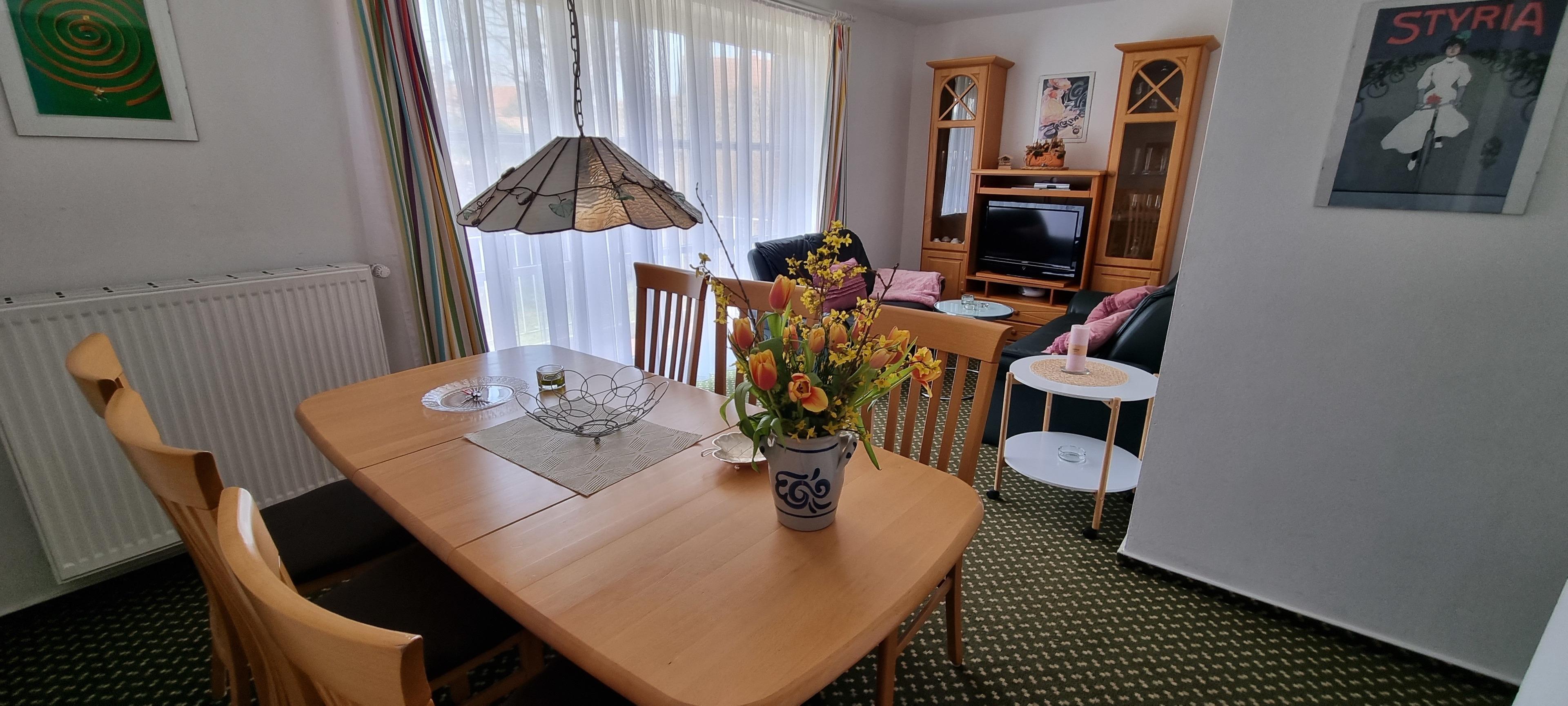 Das Erdgeschoss liegt um ca. 1 m über der Erdoberfläche und eine Souterrain-Wohnung befindet sich darunter, daher der Balkon. Ein Schlafzimmer ist mit einem 1,80 m breiten Doppelbett ausgestattet, das andere mit einem Etagenbett und einem Einzelbett. Ein kleines Kinderbett kann zusätzlich gestellt werden. In der Küche befinden sich eine Mikrowelle, Kühlschrank mit Gefrierfach, E-Herd mit Ceranfeld und Backofen, ebenso ein Geschirrspüler. Das Wohnzimmer hat einen großzügigen Essplatz für bis zu 6 Personen. Über WLAN haben Sie kostenlosen Internetzugang. Waschmaschine und Trockner im Waschraum werden über einen Münzautomaten abgerechnet. Der Südwestgarten lädt zum Spielen, Grillen und Entspannen ein. Ein Haustier (Hund) ist in der Nebensaison erlaubt.