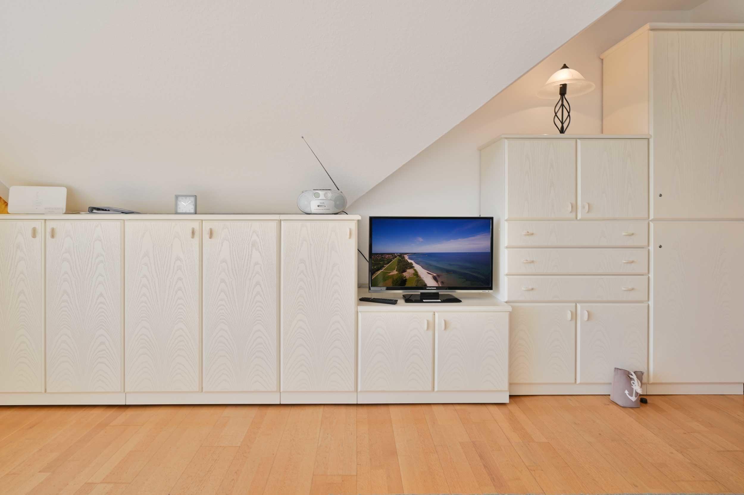 Der kombinierte Wohn-Schlafraum ist in eine Ess- und eine Couchecke aufgeteilt. Hier befindet sich für eine Person ein Schlafsofa mit Lattenrost (1,40). Des Weiteren beinhaltet der Wohnbereich einen SAT-TV Flachbildschirm-Fernseher und ein DAB+ Radio mit Bluetooth. Vor dem Wohnzimmer befindet sich ein Balkon, der mit Gartenstühlen bestückt ist. Von hier aus haben Sie, je nach Jahreszeit, einen eingeschränkten Seeblick. Ebenfalls haben Sie die Möglichkeit, die Rasenfläche des Grundstückes zu nutzen.