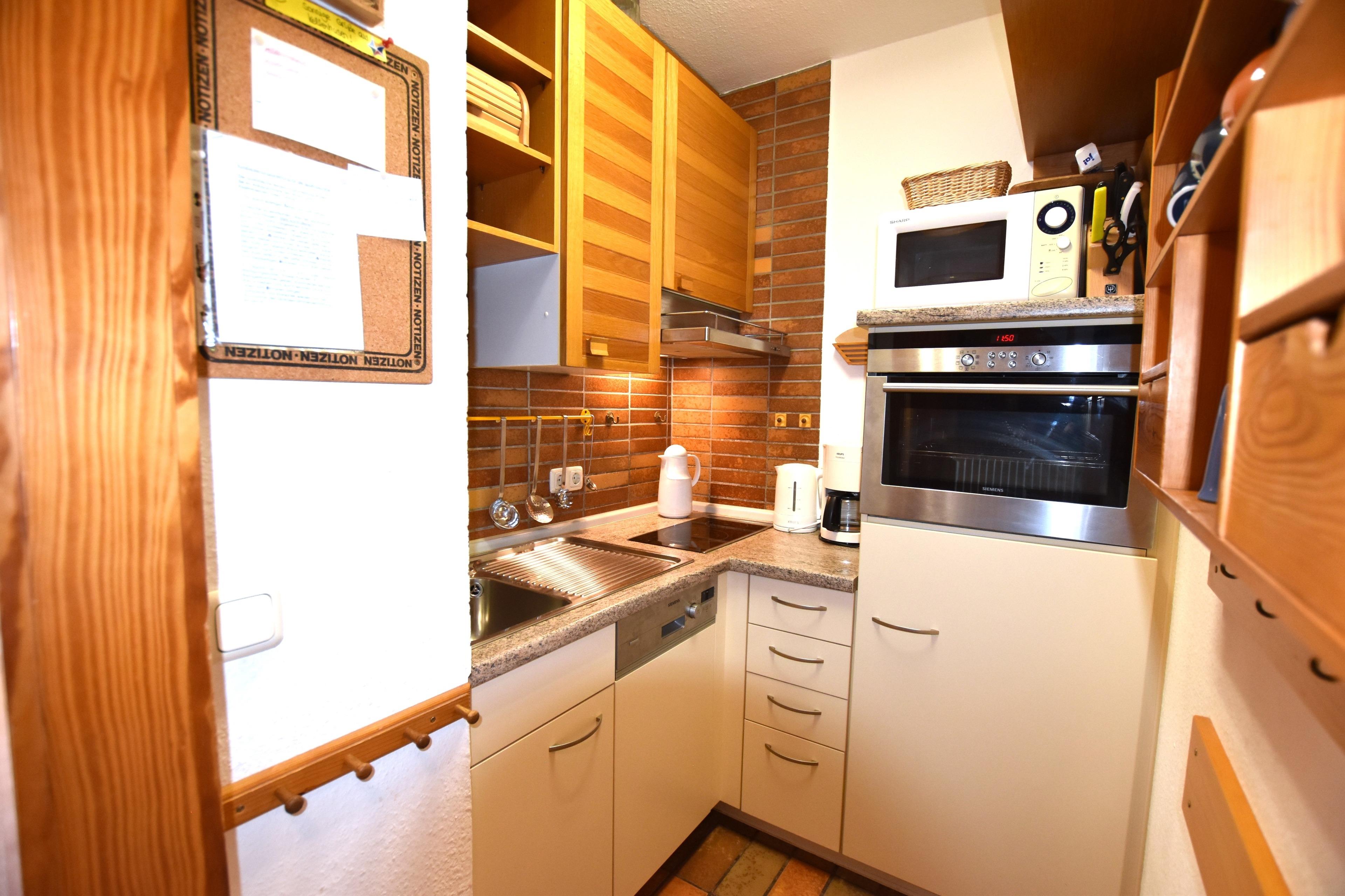 Auf derselben Etage befinden sich die platzsparende Küche mit Induktionsherd und Geschirrspüler sowie das zweckmäßige Duschbad. Zum Schlafen geht es innerhalb der Wohnung mit einer Treppe ins Dachgeschoss. Hier stehen Ihnen zwei separate Schlafzimmer zur Verfügung. Beide verfügen jeweils über 2 getrennt stehenden Betten (je 90x200 cm) und einem TV-Gerät. Hier kann man wunderbar von den Urlaubserlebnissen des Tages träumen.