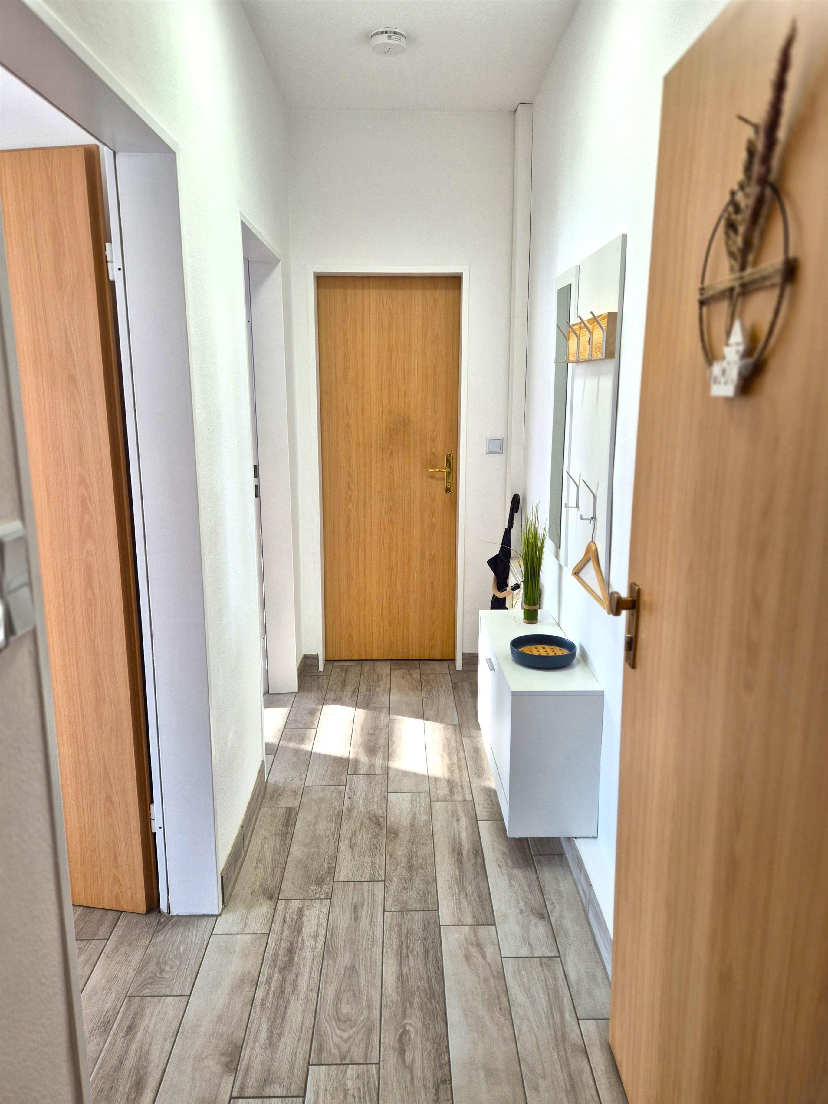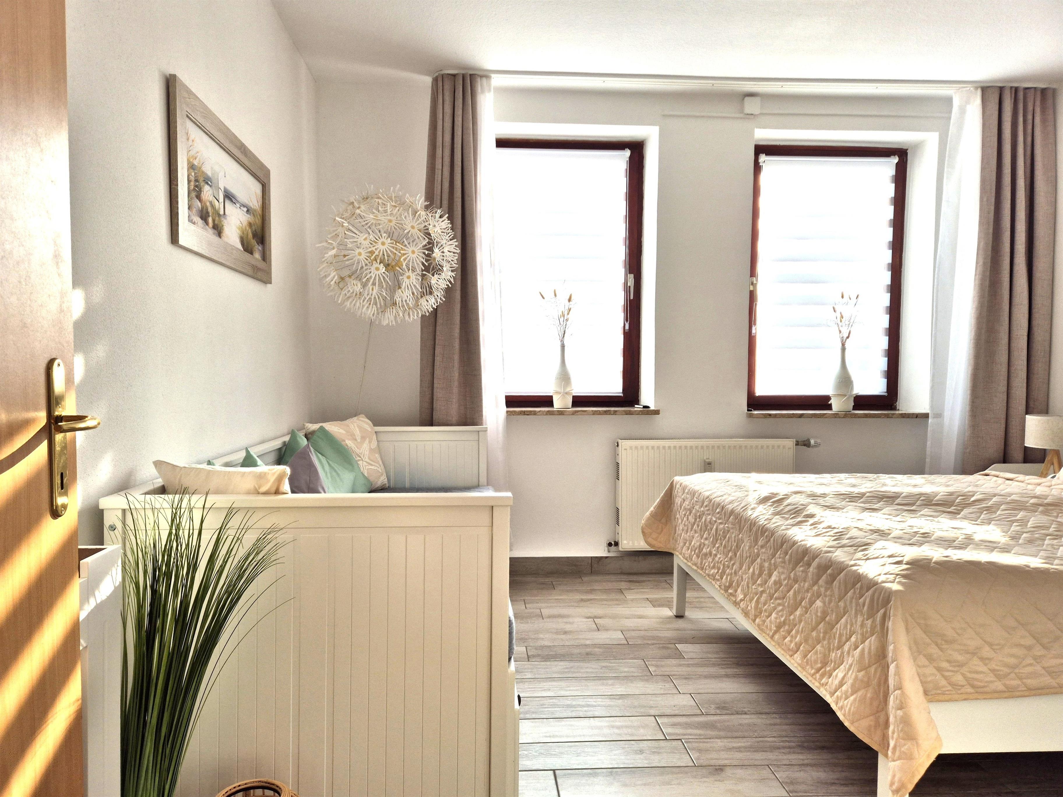 Im Inneren überzeugt die Ferienwohnung, die komplett mit Fliesen ausgelegt ist, durch ihren sonnendurchfluteten Wohnraum mit integrierter Küchenzeile inklusive Geschirrspüler, einem Esstisch mit Platz für bis zu 5 Personen, einer Schlafcouch mit 2 vollwertigen Schlafplätzen, einem TV-Board mit 40 Zoll Smart-TV und einer Regaleinheit mit Utensilien, wie Stiften, Spielen, Malblöcken und Büchern für regnerische Tage. Das großzügige Schlafzimmer bietet unseren Gästen ein Doppelbett (180x200) mit Nachtschränken, sowie ein ausziehbares Einzelbett samt Schubkästen zum Verstauen von Taschen und Koffern. Im geräumigen Kleiderschrank, sowie der Kommode findet sich weiterer Stauraum, bzw. Abstellmöglichkeiten für Utensilien und Bekleidung. Bei Bedarf können die Fenster des Schlaf- und Wohnzimmers mit elektrisch angesteuerten Rollläden verdunkelt werden. Das Bad ist ausgestattet mit einer Dusche, einem WC mit Absenk-Automatik, einer aktiv schaltbaren Belüftung, einem beleuchtetem LED-Spiegel mit Anti-Beschlagfunktion, sowie einem Waschtrockner, der bei Bedarf jederzeit genutzt werden kann. Zur Haushaltausstattung gehören weiterhin ein klappbarer Wäscheständer, ein Akku-Staubsauger und eine Gummifußmatte zum Abstellen nasser Schuhe bei Schietwetter. Alle Räume, auch der Flur können an kalten Tagen beheizt werden, sodass die Wohnung das ganze Jahr genutzt werden kann.