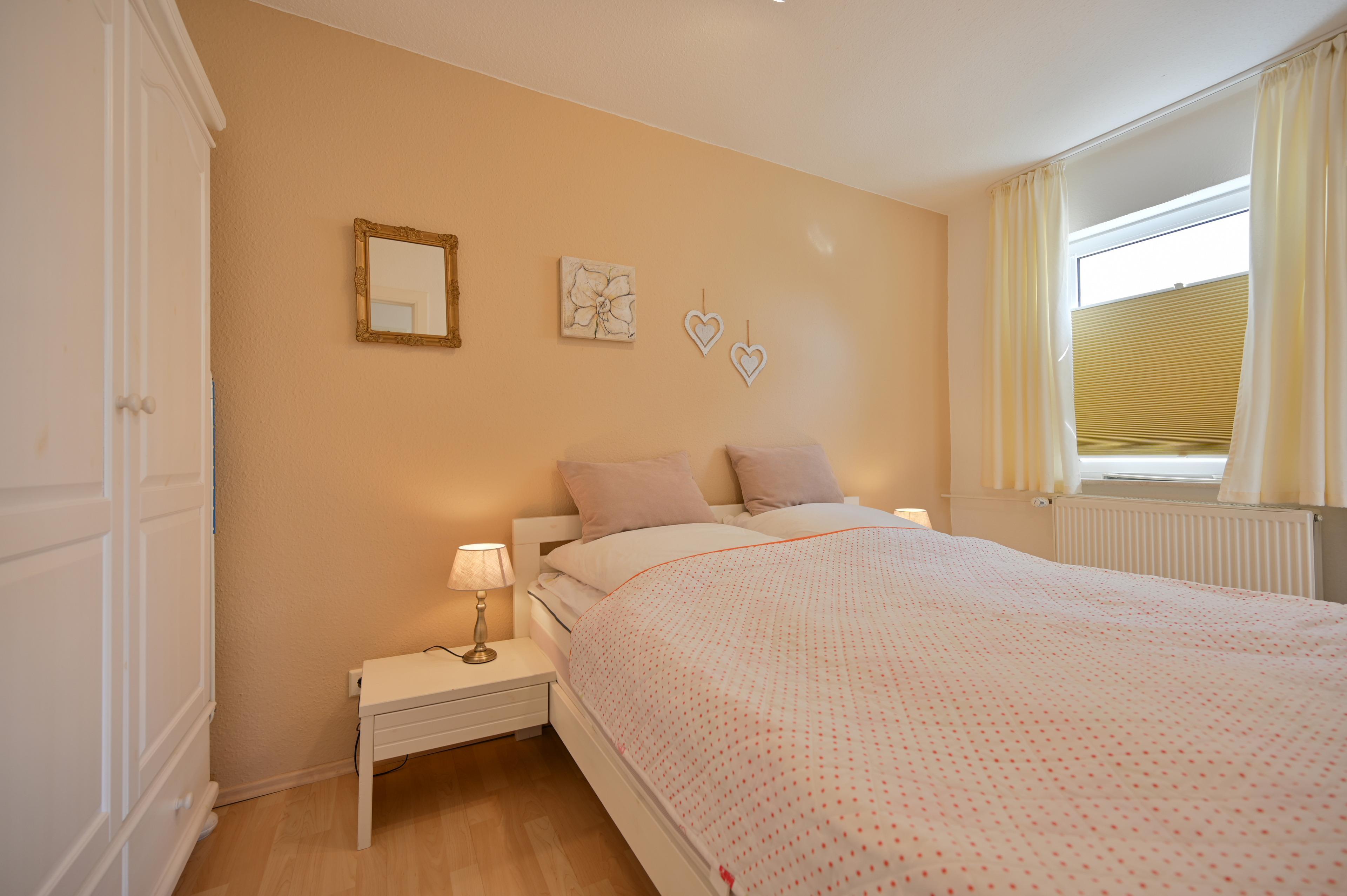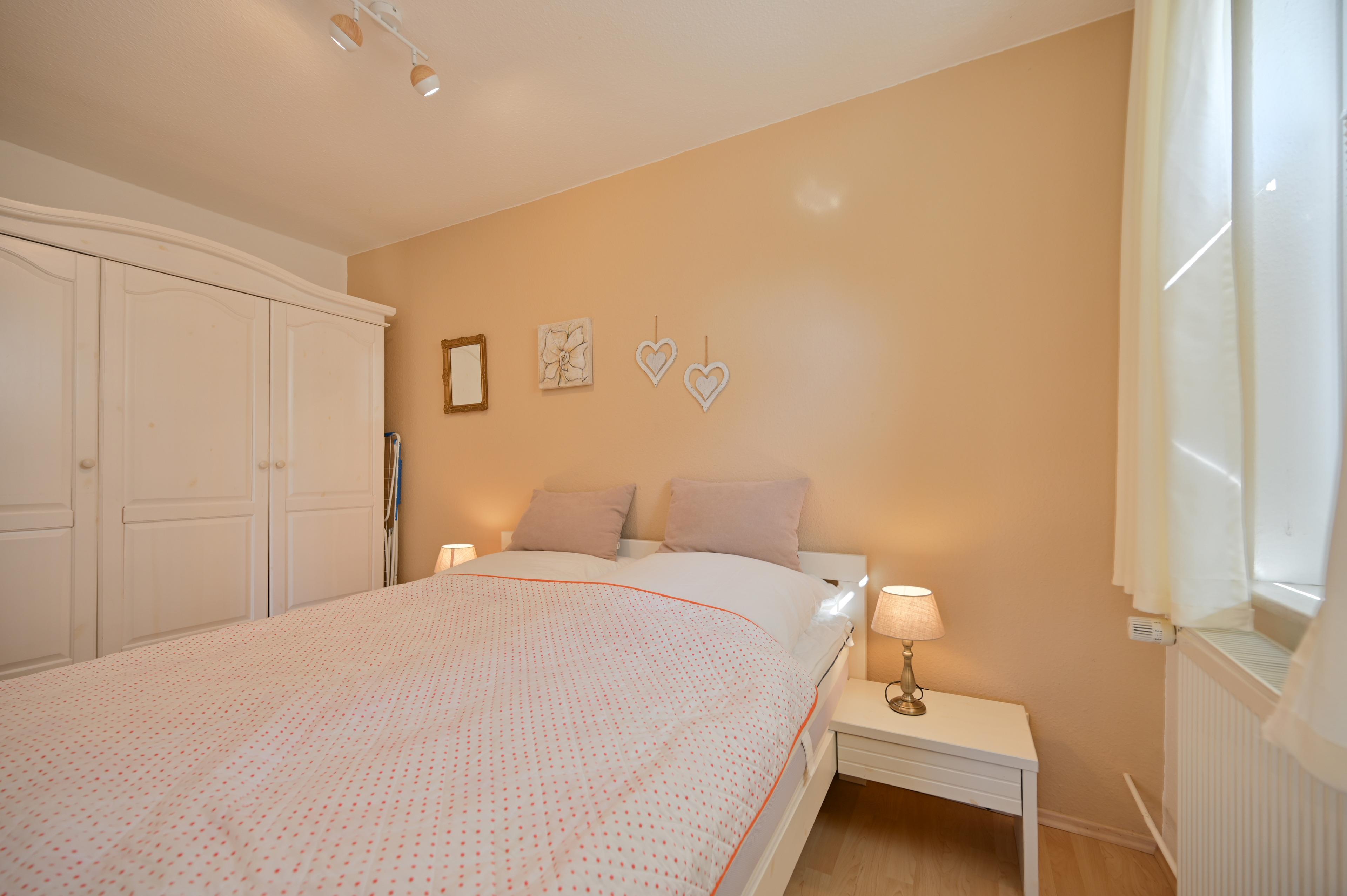 Zur Wohnung gehört ein separates Schlafzimmer mit einem bequemen Doppelbett mit zwei Nachtschränkchen. Hier steht Gästen darüber hinaus ein großer Kleiderschrank zur Verfügung.