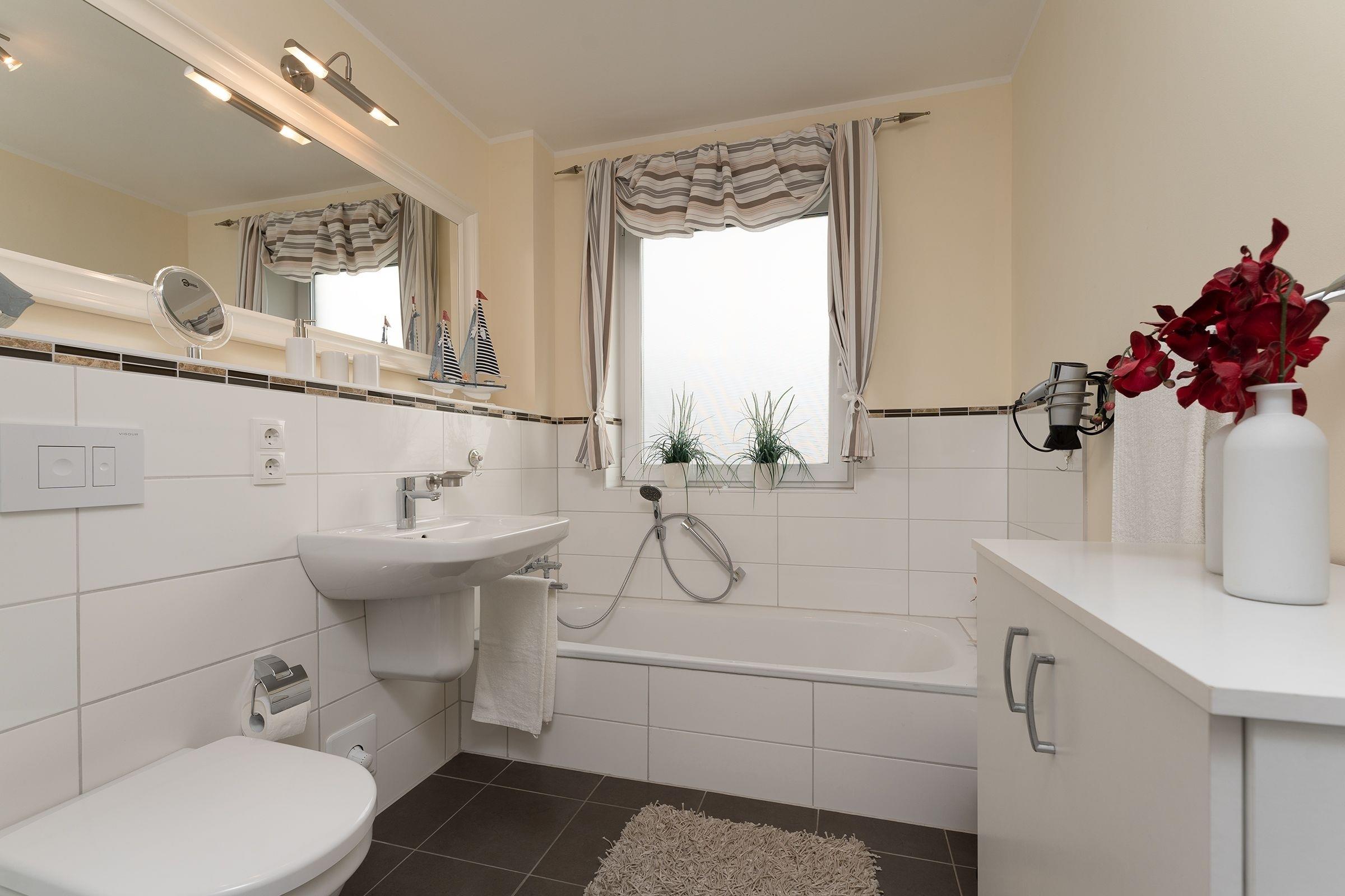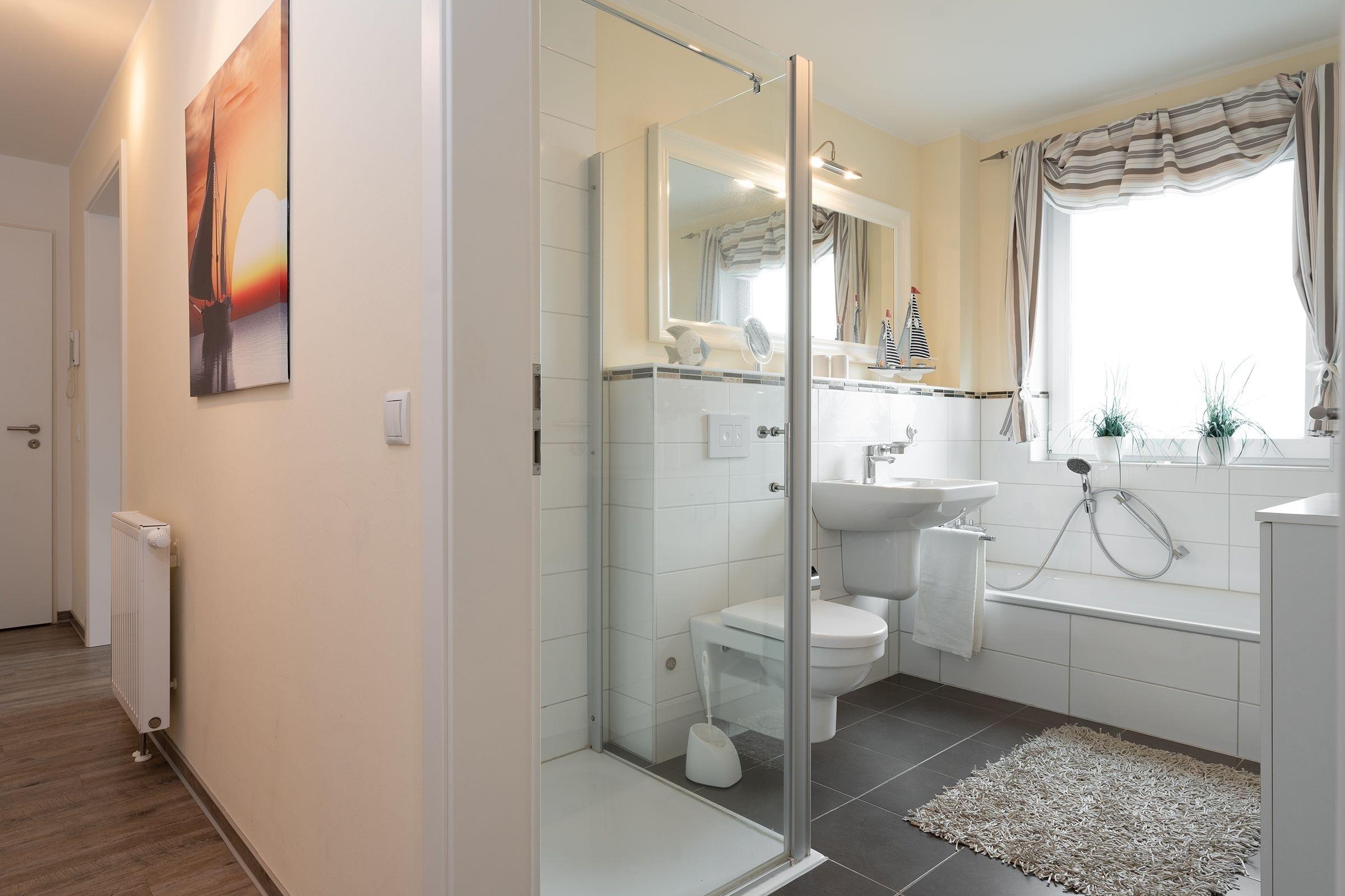 Der offene und großzügige Wohn-/Essbereich mit TV-Gerät und Stereo-Anlage sowie angrenzender Einbauküche mit Geschirrspüler bildet das gesellige Herzstück der Wohnung. Über einen kostenlosen WLAN-Anschluss können Sie Ihre Lieblingsmusik streamen und erste Urlaubsfotos mit Ihren Lieben teilen. Ein Schlafzimmer ist mit einem Doppelbett (2x 80x200 cm) und ein weiteres Schlafzimmer mit 2 Einzelbetten (je 90x200 cm) ausgestattet. Das Bad ist sehr geräumig und verfügt über Dusche und Badewanne. Die möblierte Terrasse ist nach Westen hin ausgerichtet.