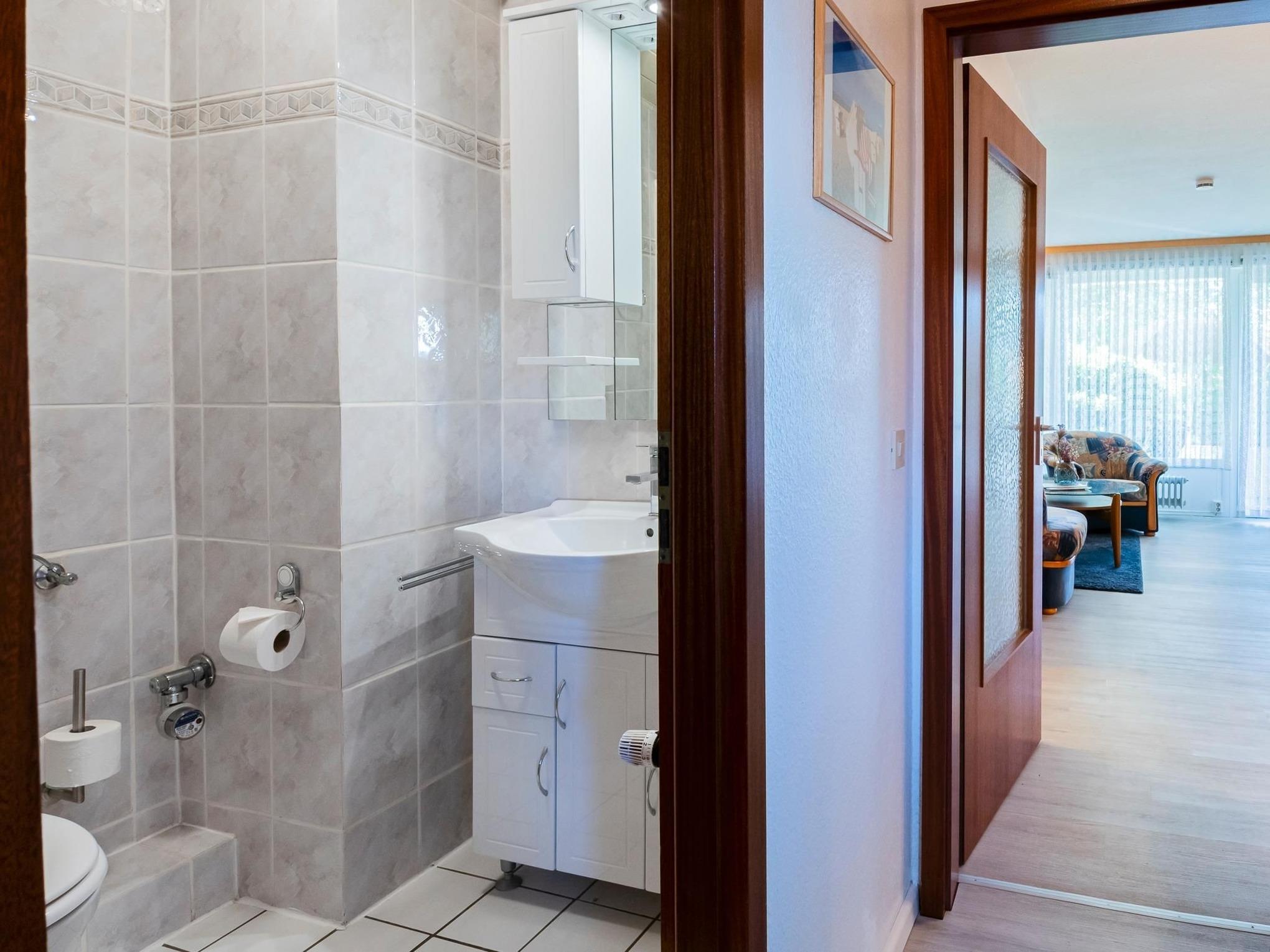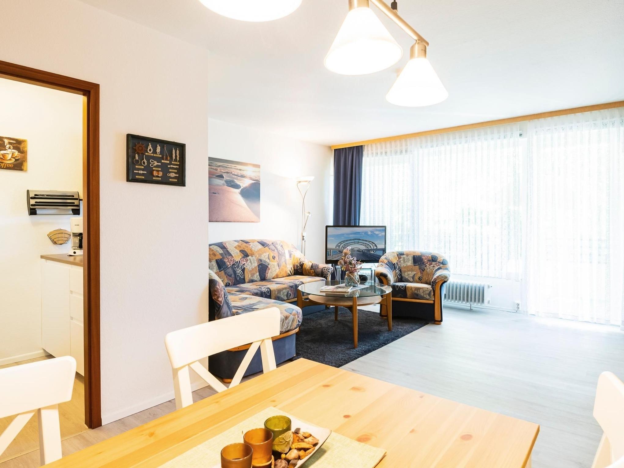 Sie werden empfangen von einem großzügigen Wohn- und Schlafbereich, der mit gemütlichem Sofa, Essecke und Flachbild-TV (Kabelanschluss) zum Verweilen einlädt. Von hier haben Sie Zugang zum sonnenverwöhnten Balkon, auf dem Sie die frische Meeresbrise genießen können. Im Handumdrehen verwandelt sich der Wohnbereich durch die Schrankwand mit 2 separaten, ausklappbaren Betten (2x 90x190 cm) in einen komfortablen Schlafplatz für zwei Personen. In der im Wohnzimmer integrierten, neuen Küche können Sie Ihrer Kreativität freien Lauf lassen und mit Geschirrspüler, Ceran-Kochfeld, Mikrowelle, Backofen, Kaffeemaschine, Toaster, Wasserkocher etc. köstliche Speisen zubereiten. Das separate Schlafzimmer ist mit zwei getrennt stehende Betten (je 90x200 cm) und einem weiteren Fernseher ausgestattet. Durch das helle Bad mit Dusche, WC und Waschtrockner (Münzautomat) wird diese Wohnung komplettiert.