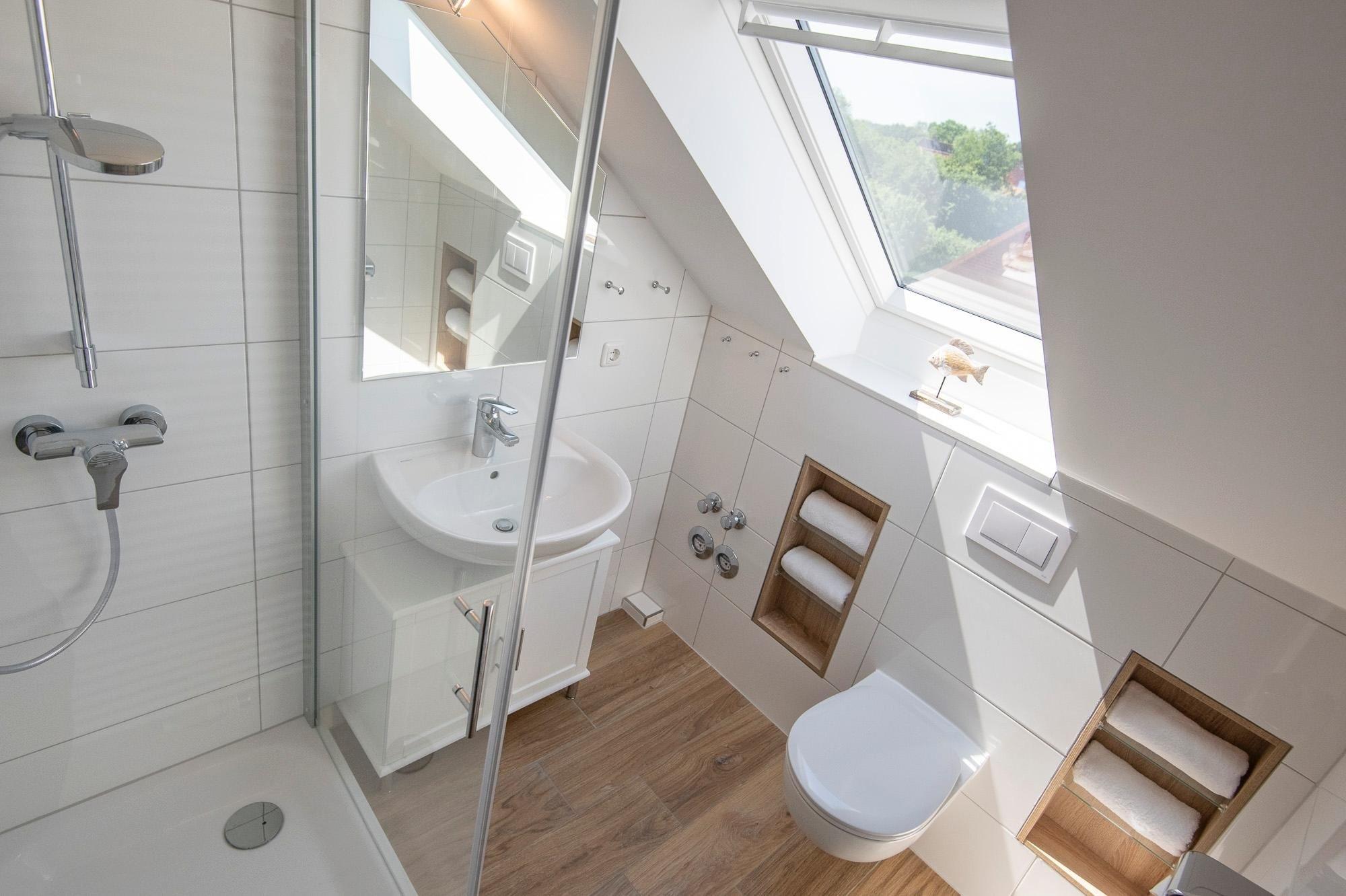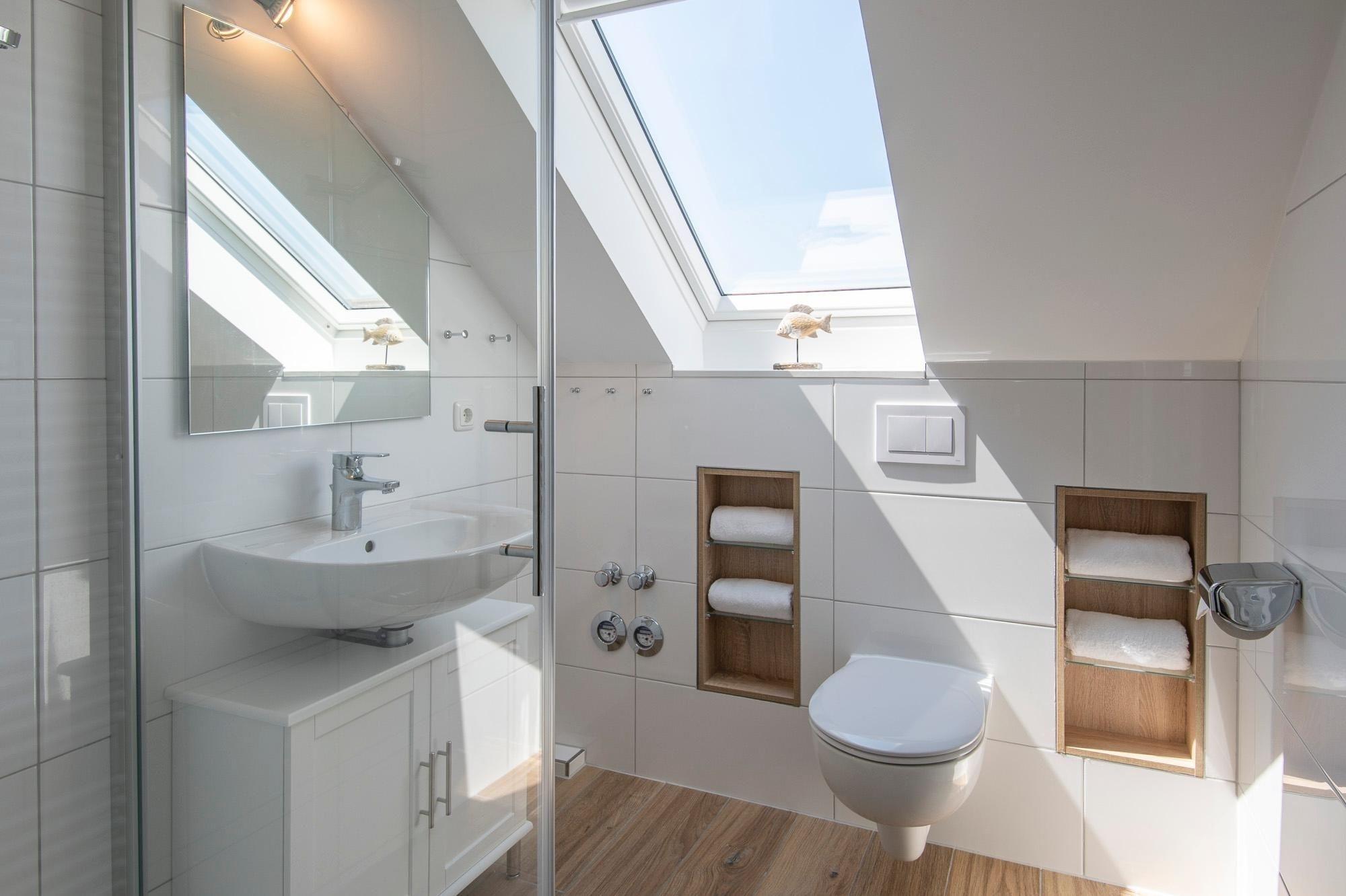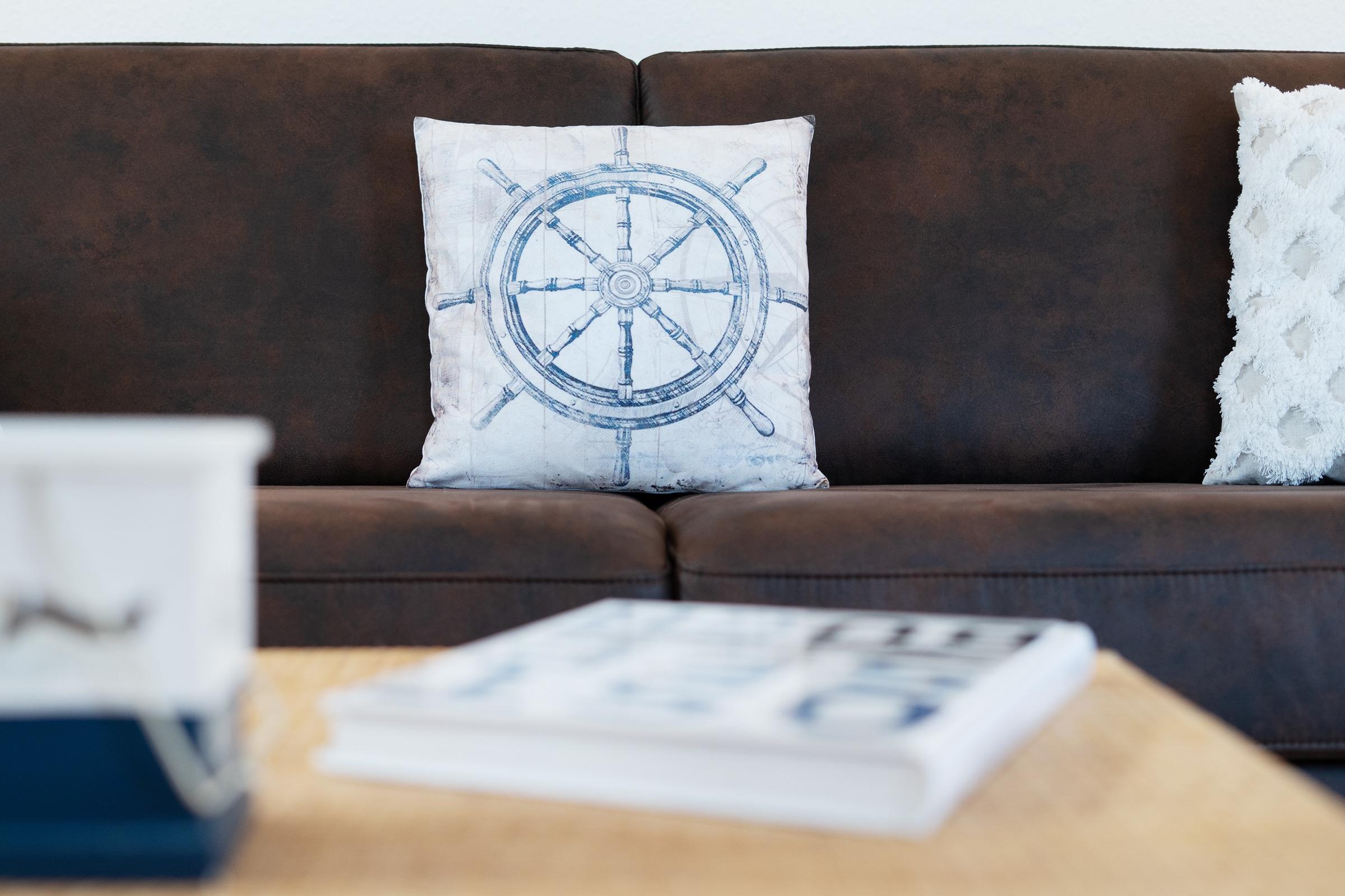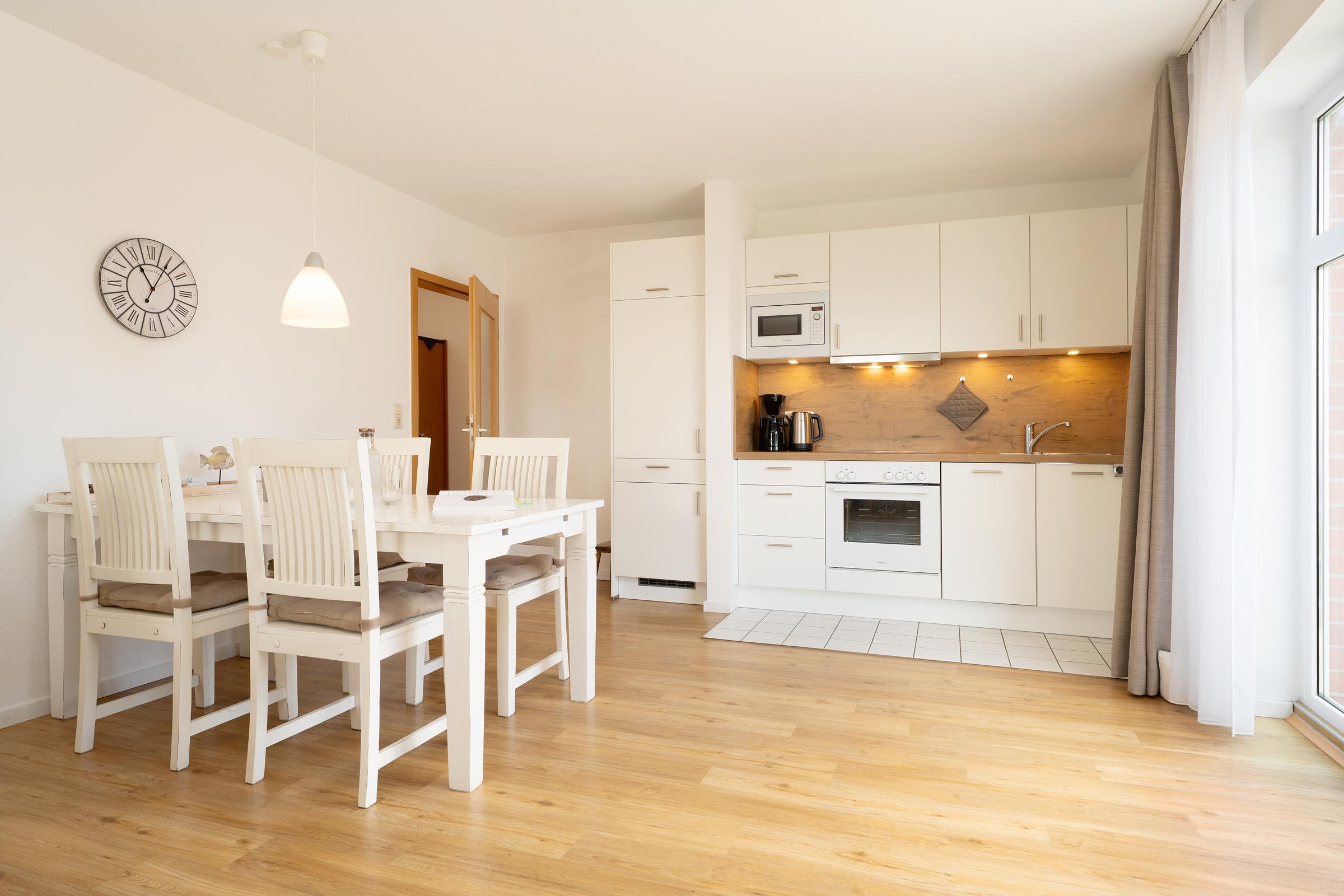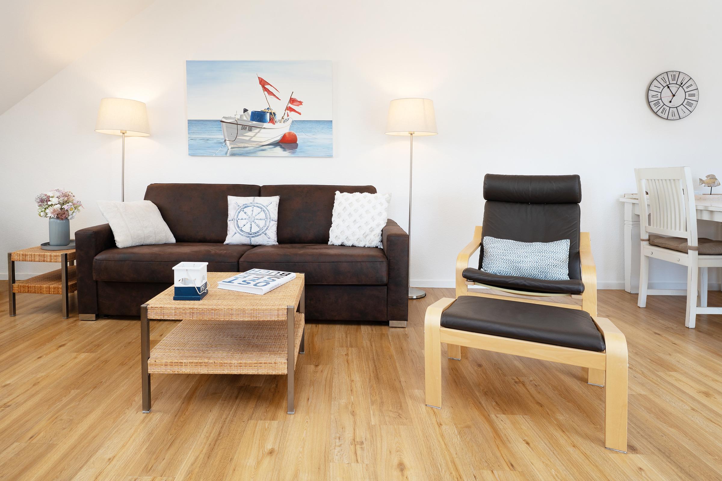 Kommen Sie an Bord. Die maritime Ferienwohnung Weitblick im gepflegten Ferien-Wohnpark Kaiserhof verspricht einen wundervollen Urlaub – mit einem tollen Ostseeblick. Der helle Wohnbereich empfängt Sie mit einer gemütlichen Polster-Garnitur. Hier können Sie wunderbar entspannen – oder auch Ihre Strandtage und Ausflüge entlang der Ostseeküste planen. Die Region hat viel zu bieten. Einen guten Überblick verschaffen Sie sich darüber auf dem möblierten Balkon. Ist das nicht ein zauberhafter Platz zum Entspannen? Genießen Sie hier die Sonne am Morgen – und den Meerblick rund um die Uhr. Die moderne Küche mit Geschirrspüler und heller Front macht richtig Lust, leckere Rezepte aus der Gegend auszuprobieren. In der großzügigen Sitz-Ecke finden 4 Personen Platz zum Schlemmen. Am Fenster – mit Ostseeblick – steht ein kleiner Tresen mit 2 Plätzen für Sie bereit. Hier können Sie Ihre Menüs UND die Aussicht genießen. Dazu ein Glas Wein ... das wird bestimmt Ihr neuer Lieblingsplatz. Nach einem ereignisreichen Urlaubstag kommen Sie wunderbar im Doppelbett (2x 90x200 cm) im Schlafzimmer mit zusätzlichem TV-Gerät zur Ruhe. Zum Ausweichen steht Ihnen dazu noch im Wohnzimmer die Doppelbettcouch (ca. 170x200 cm) zur Verfügung. Das moderne Duschbad mit Dachfenster garantiert einen wunderbaren Start in den Tag.