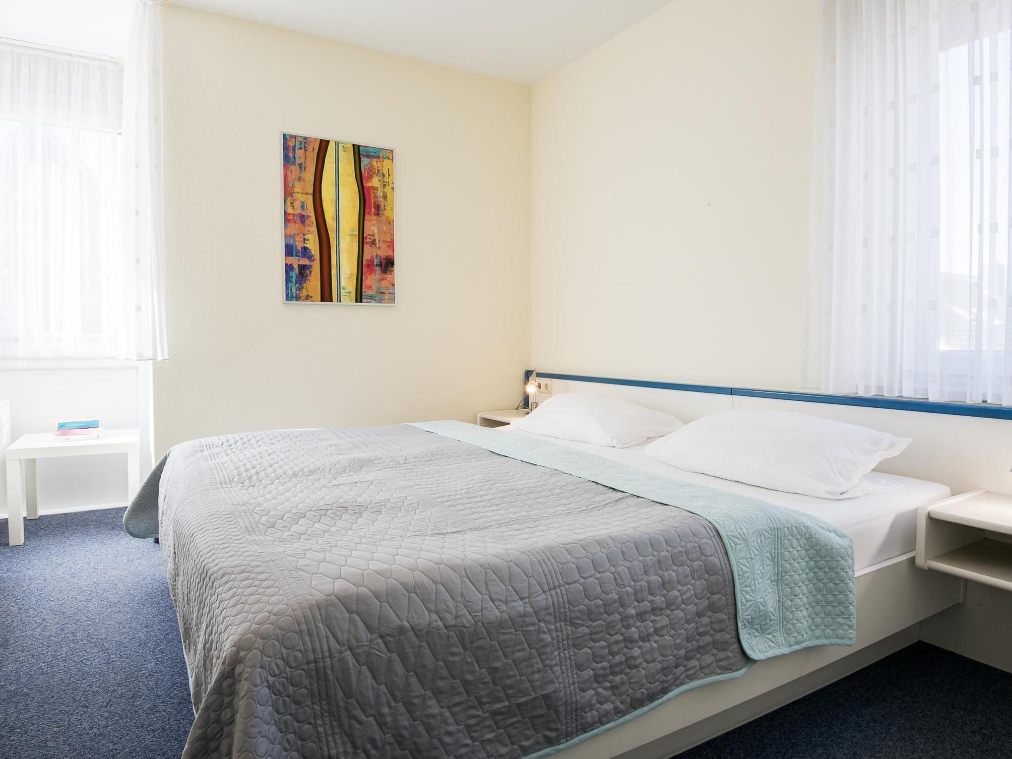 Treten Sie ein in das offen gestaltete Wohn-/Schlafzimmer mit hochwertiger Doppelbettcouch (ca. 180x200 cm), Kabel-TV, CD-Radio und lassen Sie den Alltag hinter sich. Hier finden Sie auch den direktem Zugang auf den sonnenverwöhnten Balkon, auf dem Sie Ihre Urlaubstage mit einem köstlichen Frühstück beginnen können. Die Küche ist mit angrenzender Essecke in den Wohnbereich integriert und bietet Annehmlichkeiten wie 4-Platten-Ceranfeld, Mikrowelle, Geschirrspüler, sowie Kühlschrank mit Gefrierfach. Das Schlafzimmer garantiert mit bequemem Doppelbett (ca. 180x200 cm) maximale Erholung nach ereignisreichen Urlaubstagen. Das tageslichthelle Badezimmer sorgt mit praktischen Alltagshelfern wie beleuchtetem Spiegelschrank, geräumiger Dusche und Handtuchheizung für gute Laune am Morgen.