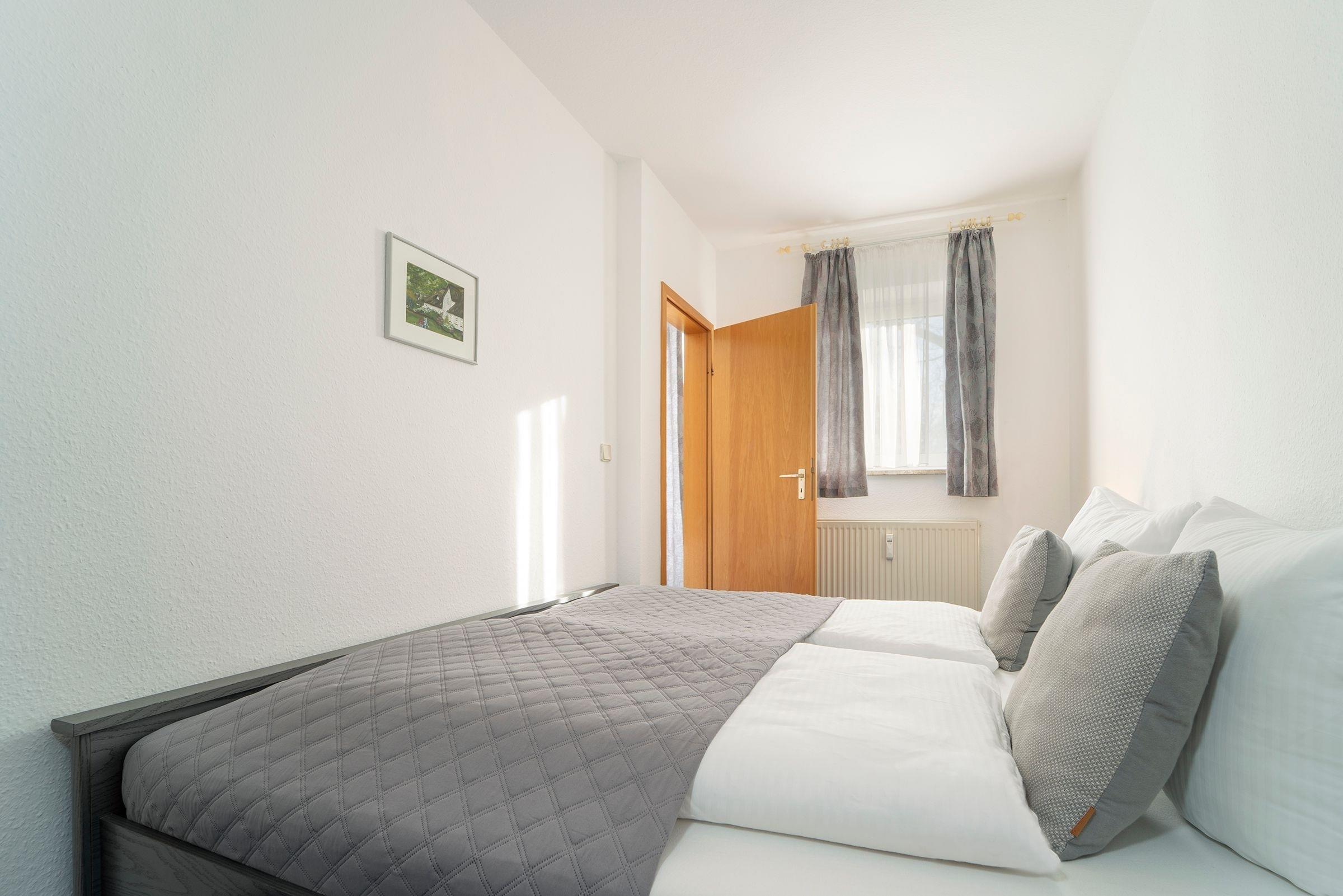 Schlafzimmer: 1 Doppelbett (ca. 180x200 cm), Kleiderschrank, Sichtschutz: Gardinen, kein Platz für Kinderreisebett vorhanden