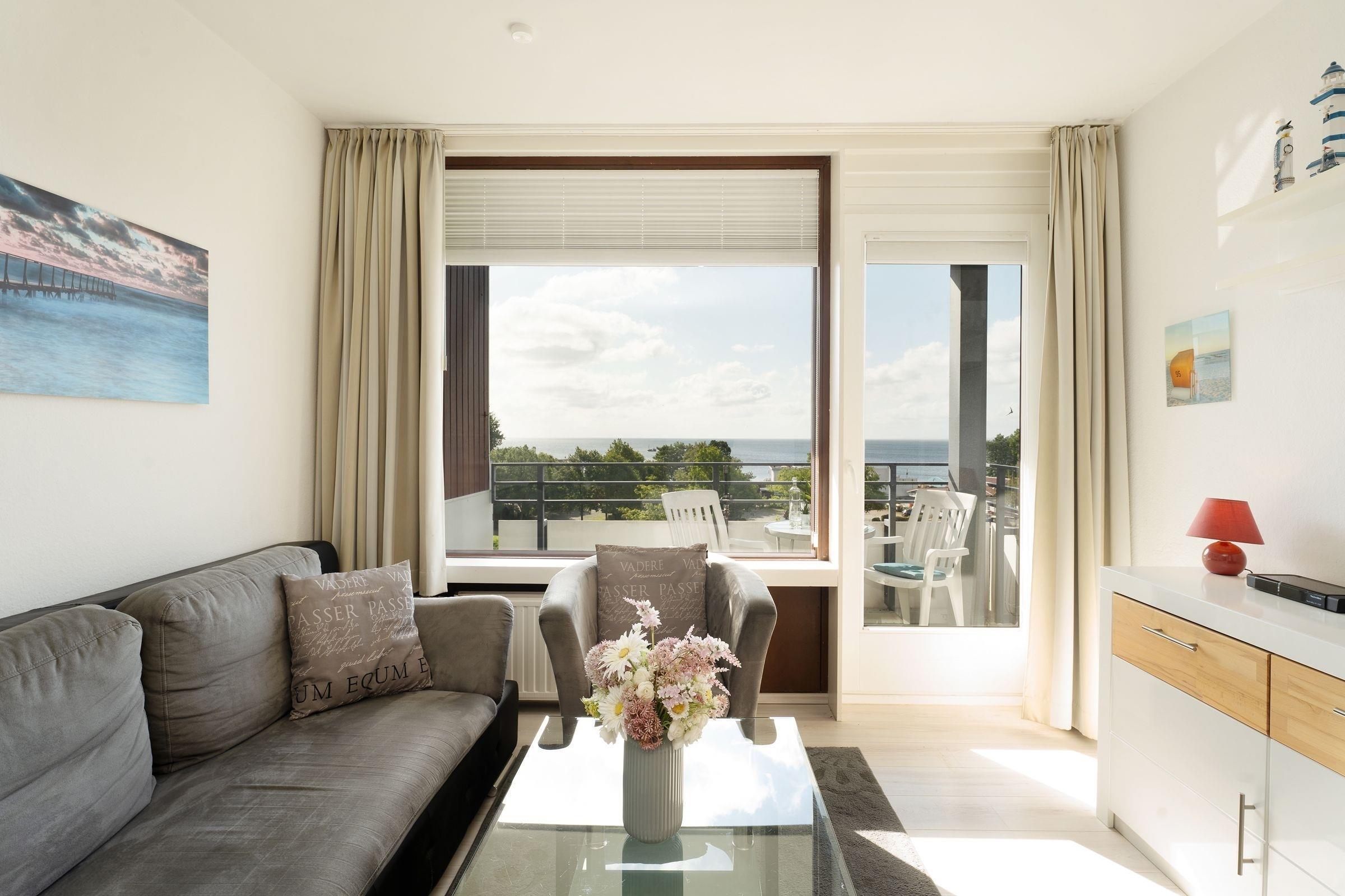 Mehr Meer geht kaum. Diese traumhafte Wohnung im Haus Meeresblick verwöhnt Sie mit Strandnähe und tollem Ostseeblick. Kommen Sie rein, Ihr Urlaub kann beginnen. Der gemütliche Wohn-/Schlafbereich präsentiert sich mit einer kuscheligen Couchgarnitur mit TV-Gerät vor der großen Fensterfront, einem gemütlichen Essplatz sowie mit 2 getrennt ausklappbaren Betten (je 90x200 cm). Die gute Ostseeluft mit tollem Blick können Sie wunderbar auf dem möblierten Balkon genießen. Die moderne, offene Küche verfügt über eine gute Grundausstattung. Und das innenliegende Duschbad lässt Sie erfrischt in den neuen Tag starten.