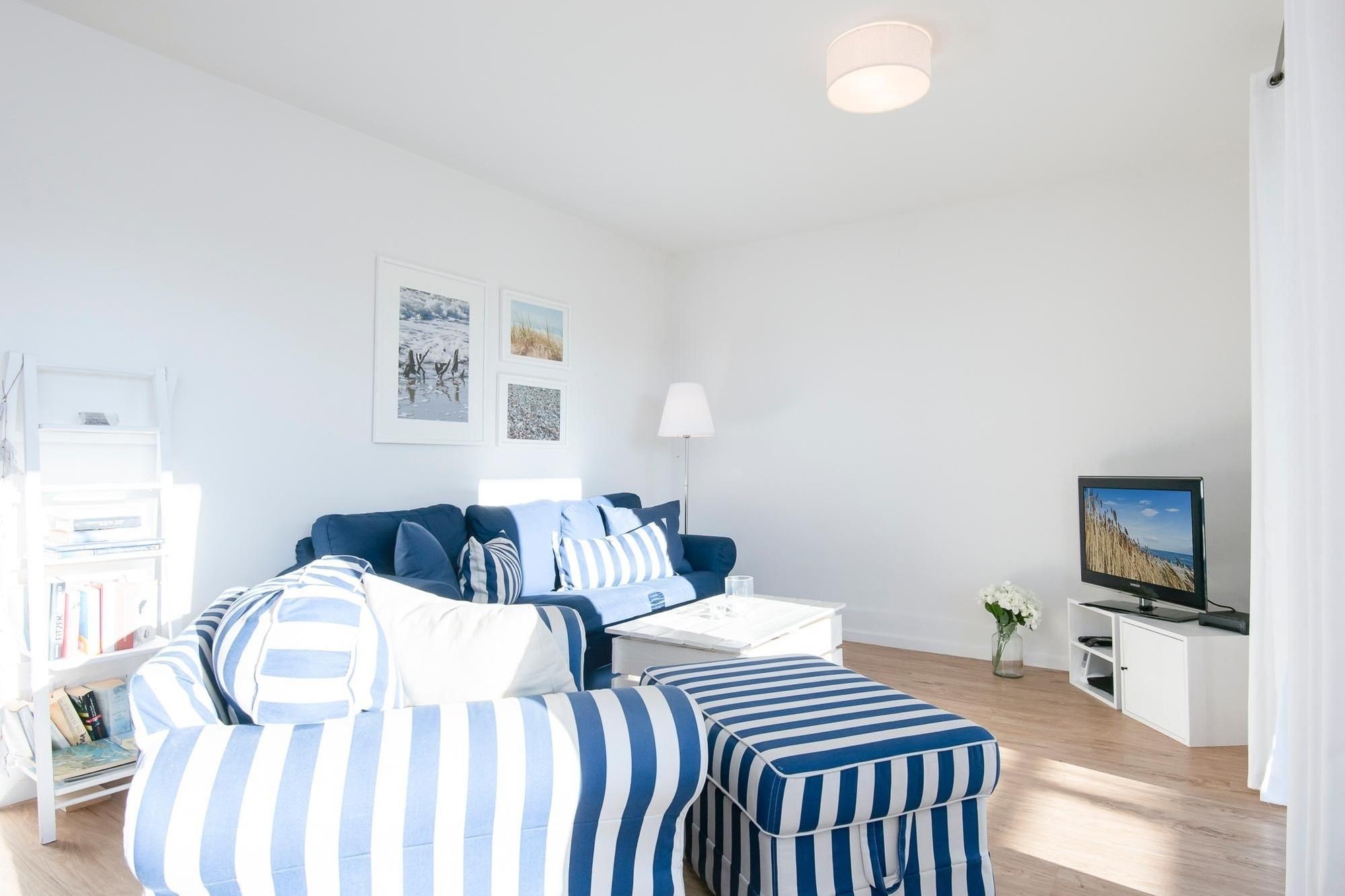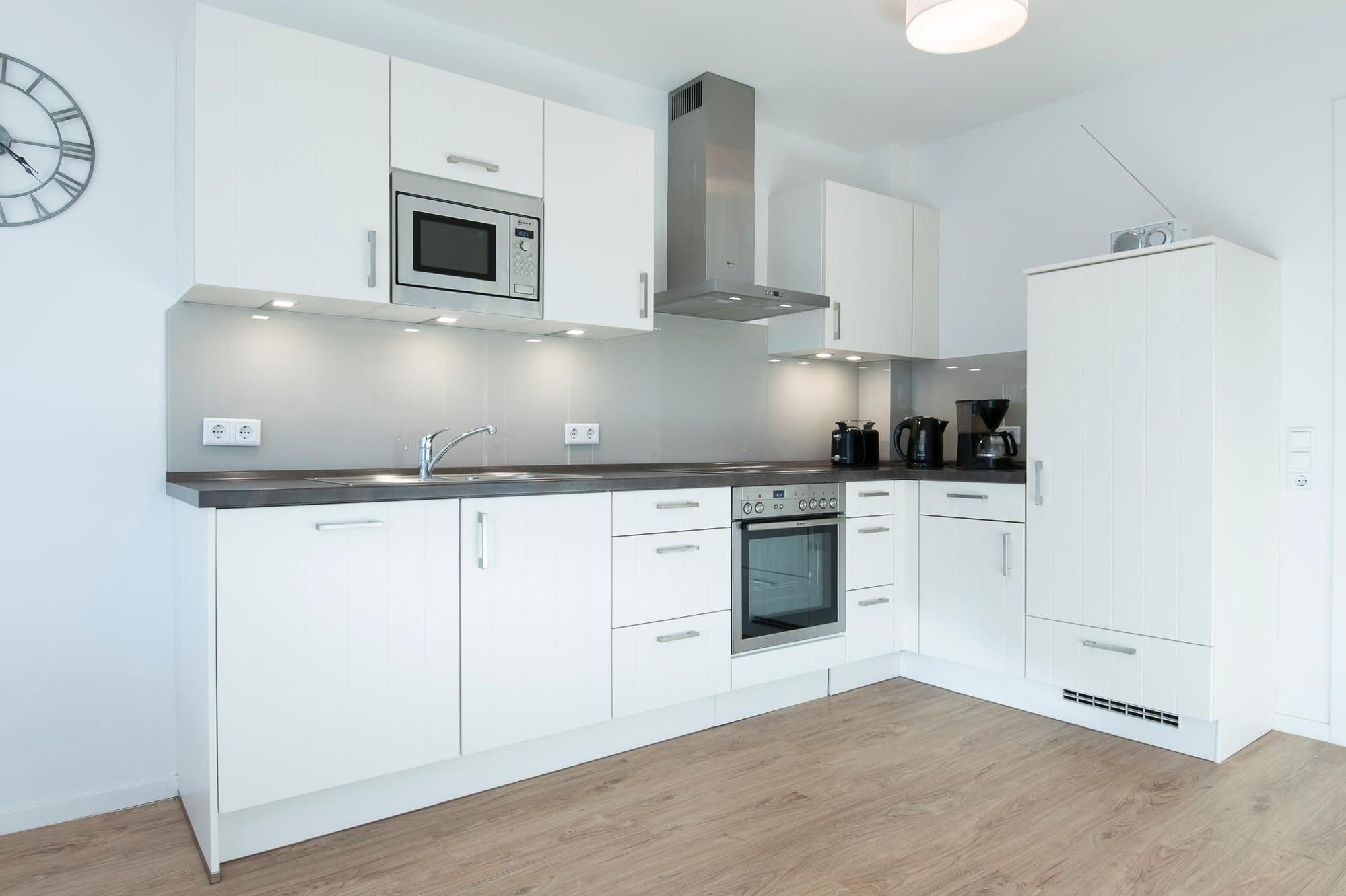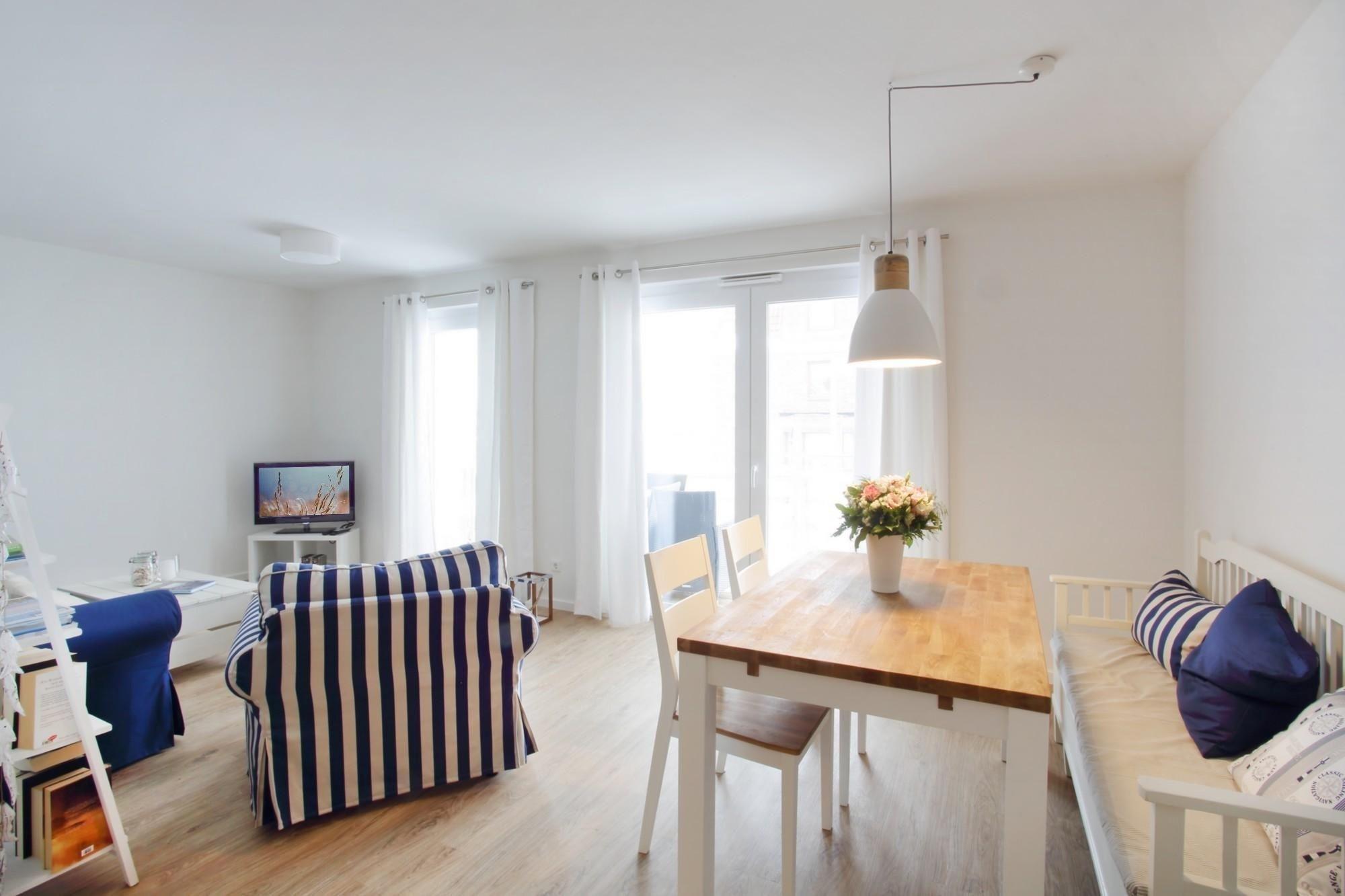 Im neu erbauten Ostseequartier liegt dieses schicke Feriendomizil. Treten Sie ein und lassen Sie den Alltag im kombinierten Wohn-/Essbereich mit TV, DVD- und Blu-ray-Player und Radio hinter sich. Außerdem besticht die Wohnung mit einem großen Süd-West-Balkon, auf dem das Grillen mit einem selbst mitgebrachten Elektrogrill gestattet ist. Die Küche ist zum Wohnbereich integriert und bietet mit Geschirrspüler, Backofen, Mikrowelle, Kaffeemaschine, Toaster etc. alle wichtigen Geräte, um Ihre Lieblingsgerichte auch im Urlaub zuzubereiten. Über den Flur erreichen Sie die beiden Schlafzimmer, ausgestattet mit Doppelbett (2x 90x200 cm) und zusätzlichem TV-Gerät. Ein weiteres Schlafzimmer ist mit 2 Einzelbetten (je 90x200 cm) ausgestattet. Das großzügige Bad mit WC überzeugt mit ebenerdiger Dusche. Highlight dieser Wohnung: In allen Räumen ist eine Fußbodenheizung vorhanden, sodass warme Füße garantiert sind. Für die kleinen Urlaubsgäste stehen ein Kinderreisebett, ein Kinderhochstuhl sowie ein Bollerwagen zur Verfügung.