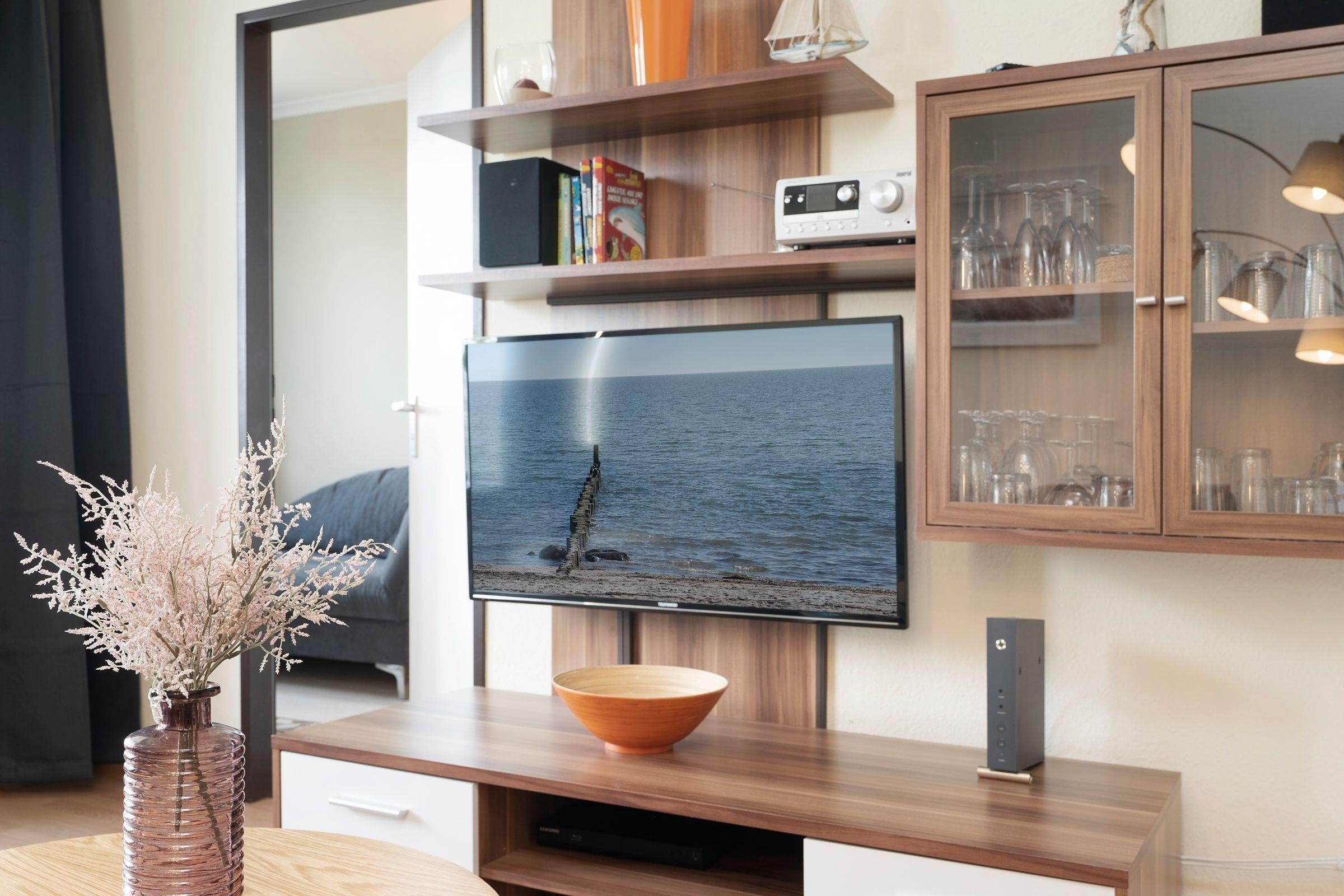 Diese strandnahe Ferienwohnung bietet Ihnen ein Wohn-/Schlafzimmer mit gemütlicher Couch und 2 getrennt stehenden Betten (je 90x200 cm) in Komforthöhe, die optisch durch einen Vorhang abgetrennt werden können. Ein Smart-TV sowie eine Micro-Hifi-Anlage mit Internet-Radio und CD-Spieler sorgen für ausreichend Unterhaltung. Die Küche ist mit einem Geschirrspüler gut ausgestattet. Das separate Schlafzimmer verfügt über ein Boxspringbett (90x200 cm) und eine ausklappbare Recamière als zusätzliche Schlafgelegenheit (ca. 80x200 cm, als Empfehlung für Kinder bis max. 14 Jahre geeignet) sowie einen weiteren Smart-TV. Im modernen Bad (Dusche ca. 70x80 cm) starten Sie erfrischt in den neuen Urlaubstag.