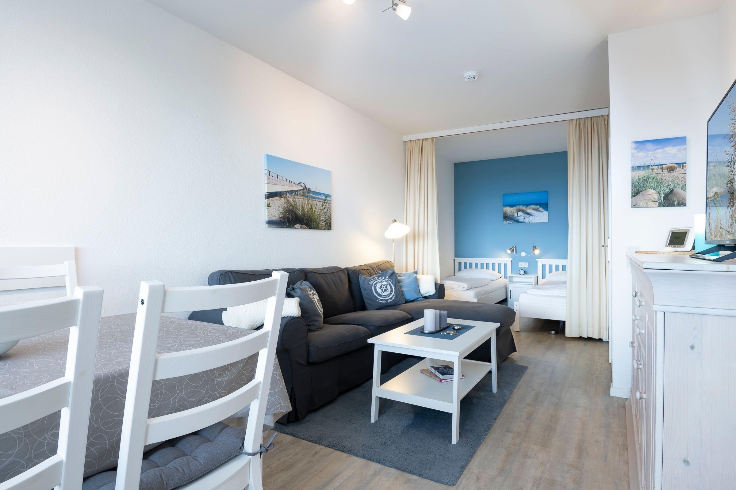 Der Wohn-Schlafraum verleitet mit Sofa und TV (internetfähig inkl. vorinstallierten Streaming-Apps, wie Netflix etc.) nicht nur zu gemütlichen Stunden, sondern lädt mit 2 Einzelbetten (2x 90x200 cm) auch zum Träumen ein. Ein Vorhang sorgt für eine optische Trennung vom Wohnbereich. In der separaten Küche finden Sie u. a. eine Geschirrspülmaschine und eine Kaffeemaschine. Genießen Sie die selbst zubereiteten Mahlzeiten am ausziehbaren Esstisch mit Blick auf die Ostsee. Im Schlafzimmer erwartet Sie ein Kojenbett (ca. 80x200 cm), dessen Liegefläche sich bequem auf 160x200 cm ausziehen lässt, sowie ein Kleiderschrank zum Verstauen Ihres Reisegepäcks. Das Duschbad ist hell gefliest.