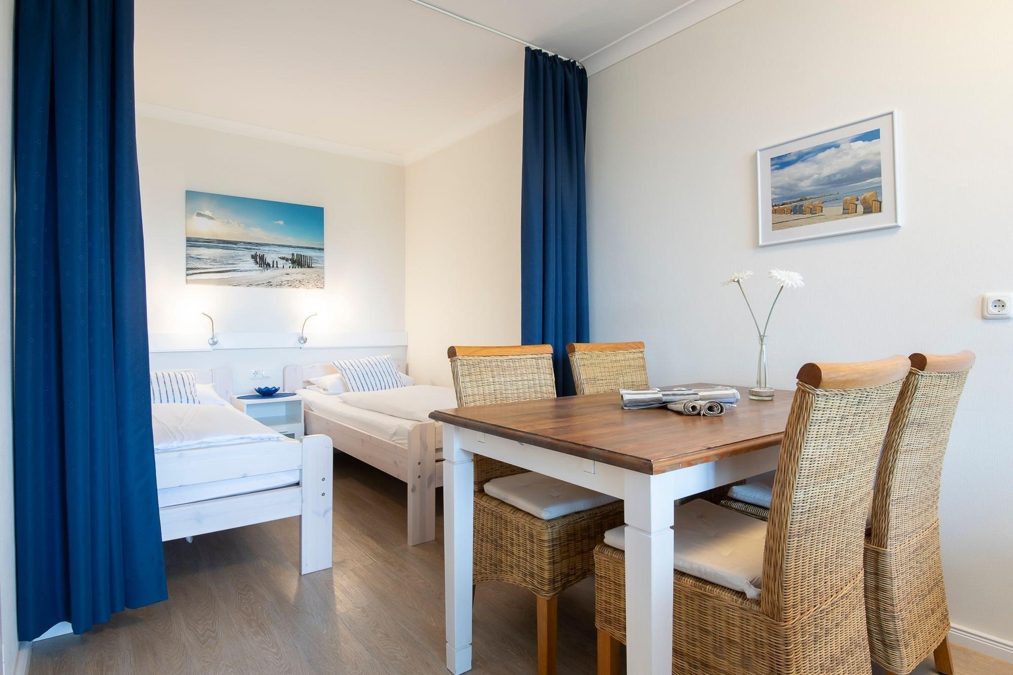 Im hellen Wohnbereich mit komfortabler Sofalandschaft, TV und behaglichem Essbereich trifft sich die ganze Familie zum Spielen, Relaxen, Essen, oder zum Filmeabend. Über den kostenlosen WLAN-Anschluss sind Sie auch im Urlaub erreichbar und die Kinder können ihre Lieblingsmusik oder -hörspiele streamen. Auch ein DAB plus Radio mit CD-Player und Bluetooth- Funktion sorgt für Unterhaltung. Von hier gelangen Sie auch auf den möblierten Balkon, auf dem Sie bei Sonnenschein ein ausgiebiges Frühstück an der gesunden Ostseeluft genießen können. Vom Wohnbereich, durch einen Vorhang abgetrennt, laden zwei separate Einzelbetten (je 90x200 cm) zum Träumen ein. In einem weiteren separaten Schlafzimmer befinden sich zwei platzsparende einklappbare Einzelbetten (je 90x200 cm), so ist tagsüber genügend Platz zum Spielen vorhanden. Ein Kleiderschrank bietet Stauraum für die mitgebrachte Urlaubsgarderobe. Die offene, kleine Küche verfügt über ein kleines Mikrowellen/Backofen-Kombigerät, einen Herd mit 2 Kochplatten, einen Kühlschrank und andere Annehmlichkeiten, so dass Sie sich während des Urlaubs auch selbst verpflegen können. Das Duschbad wurde komplett saniert und Dank der bodentiefen Dusche können Sie erfrischt in den Tag starten.