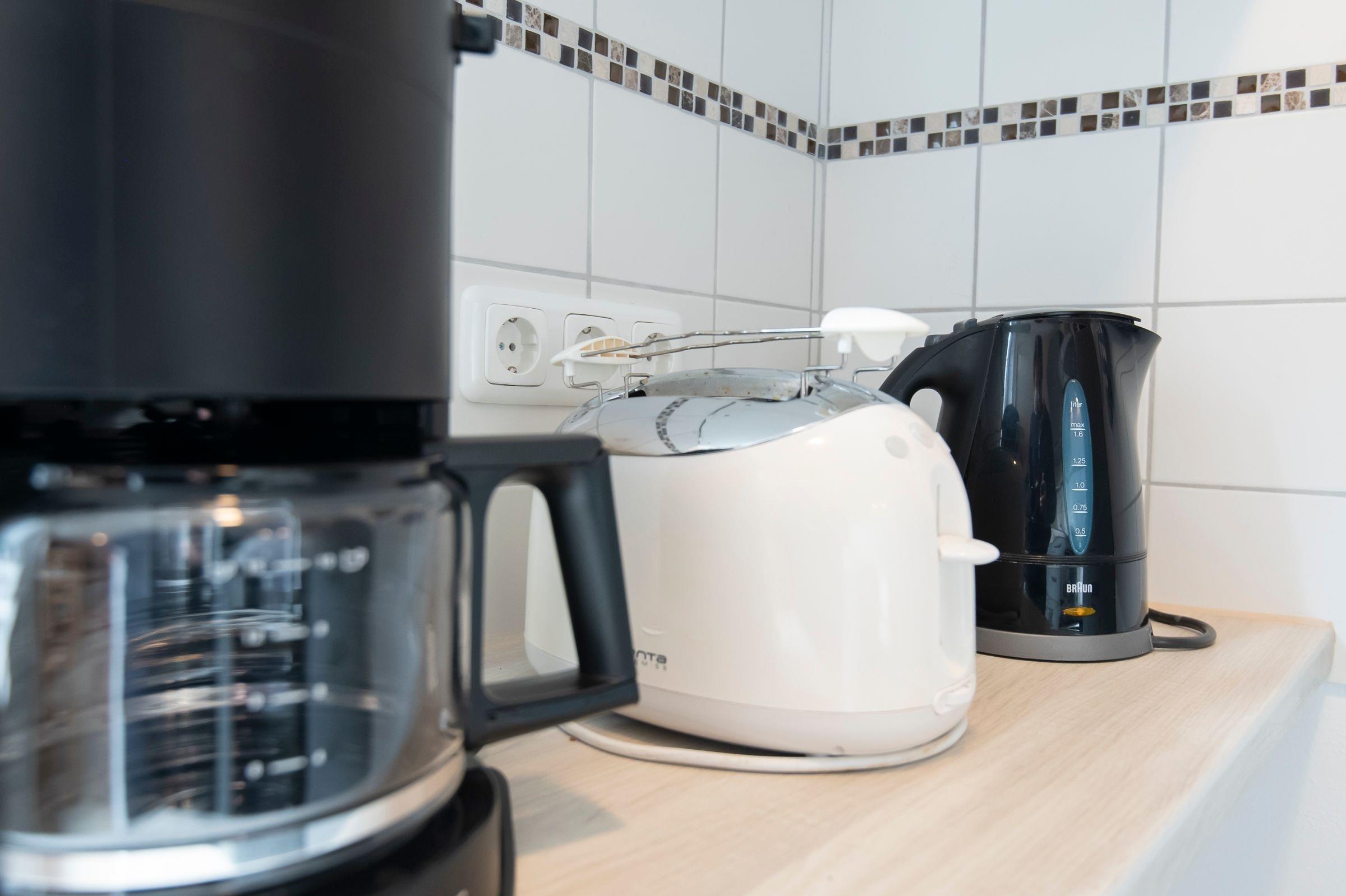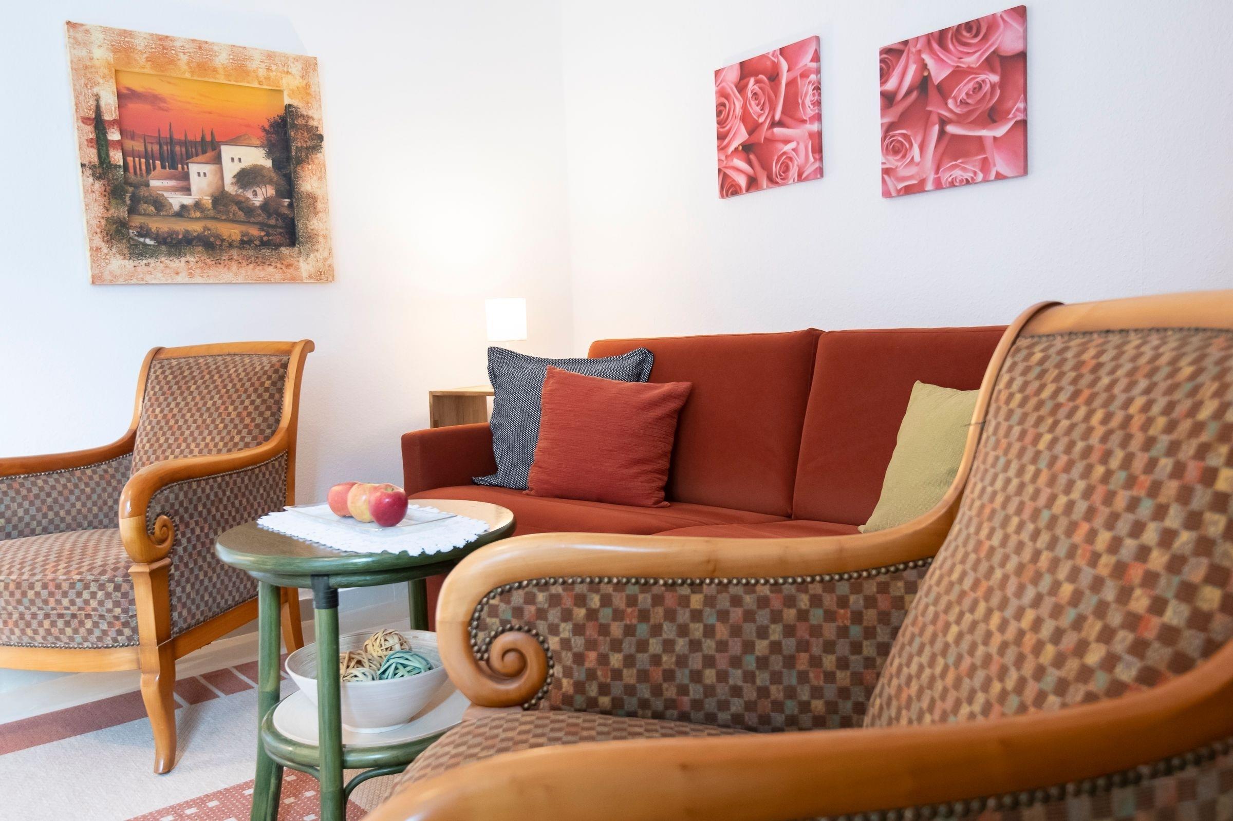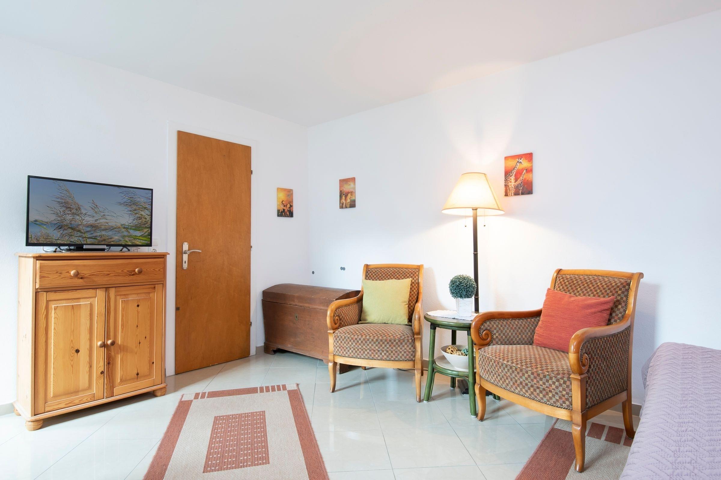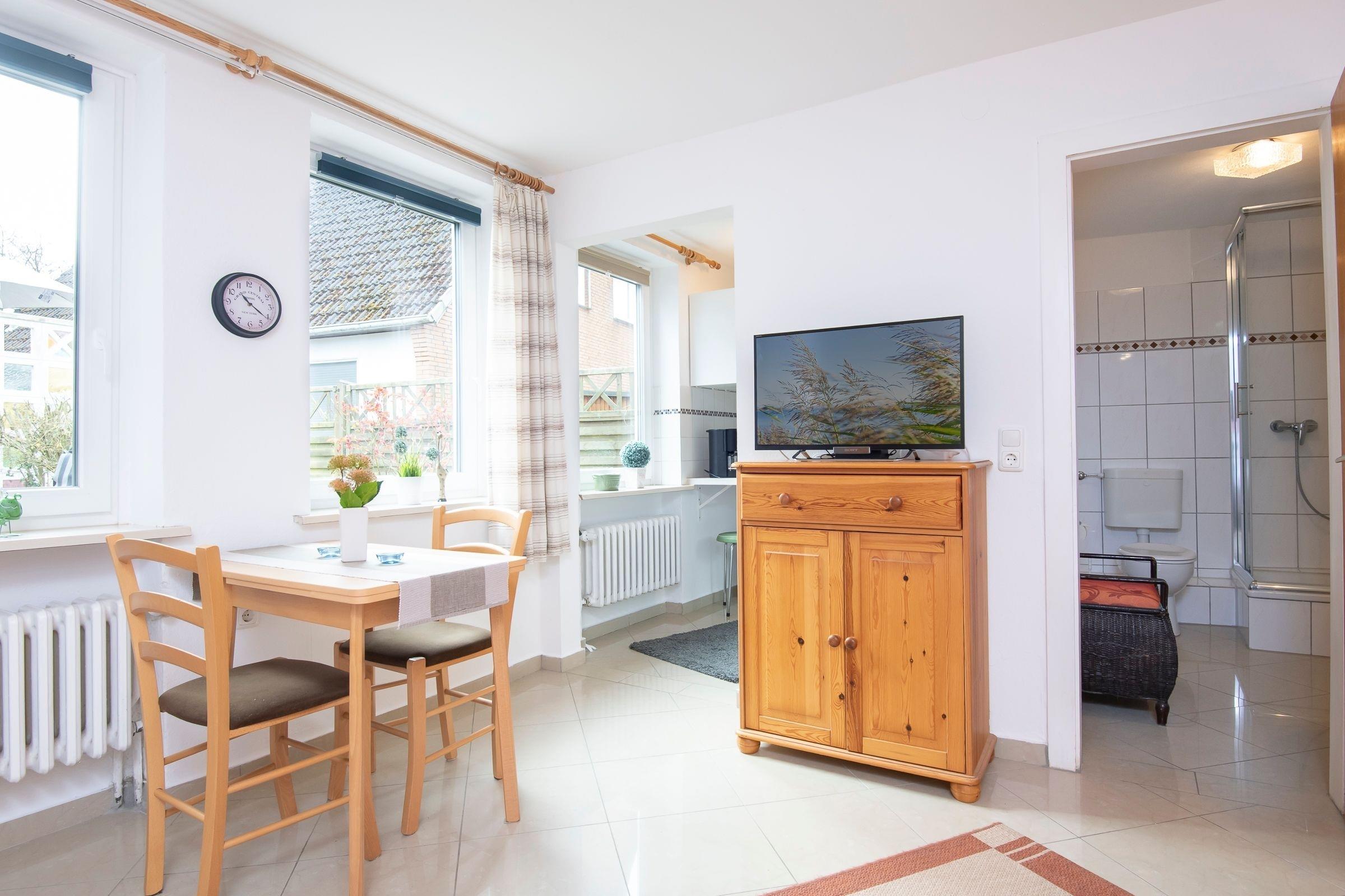 Über den Flur gelangen Sie in den hellen Wohn- und Essbereich. Hier können Sie es sich auf den 2 Sesseln oder dem Sofa vor dem Fernseher gemütlich machen. Das komfortable Sofa lässt sich für die Nacht ausziehen und bietet mit einer Fläche von 180x200 cm ausreichend Platz für 2 Personen. Ebenfalls vorhanden ist ein großer Kleiderschrank, in dem Sie Ihr Urlaubsgepäck verstauen können. Der Esstisch befindet sich direkt vor zwei großen Fenstern - Dort können Sie in Ruhe gemeinsam speisen. Die offene Küche ist mit allen Notwendigkeiten ausgestattet, sodass es Ihnen im Urlaub an nichts fehlt! Sowohl in der Küche als auch im Wohnbereich sind Rollos an den Fenstern als Sichtschutz vorhanden.