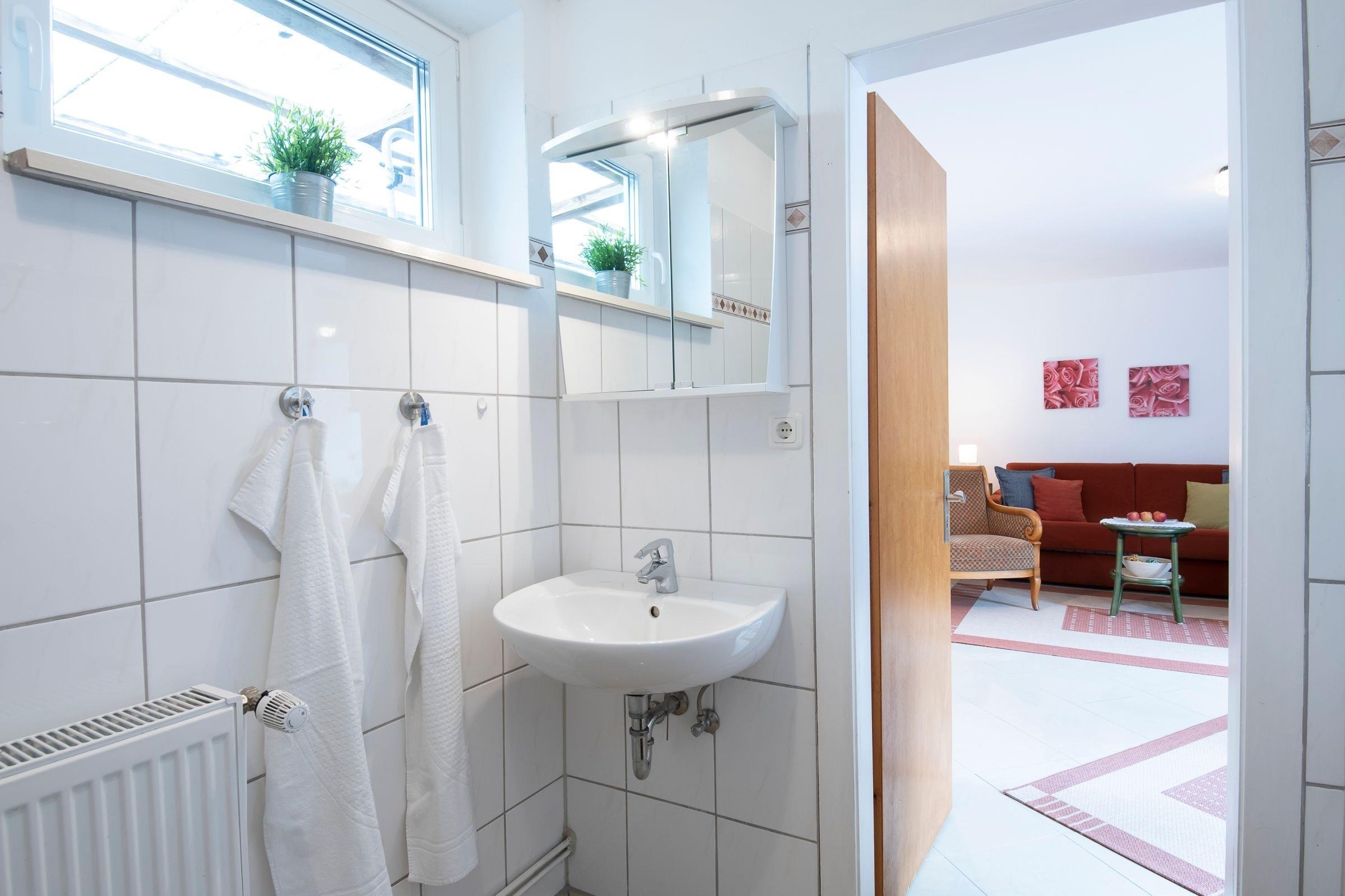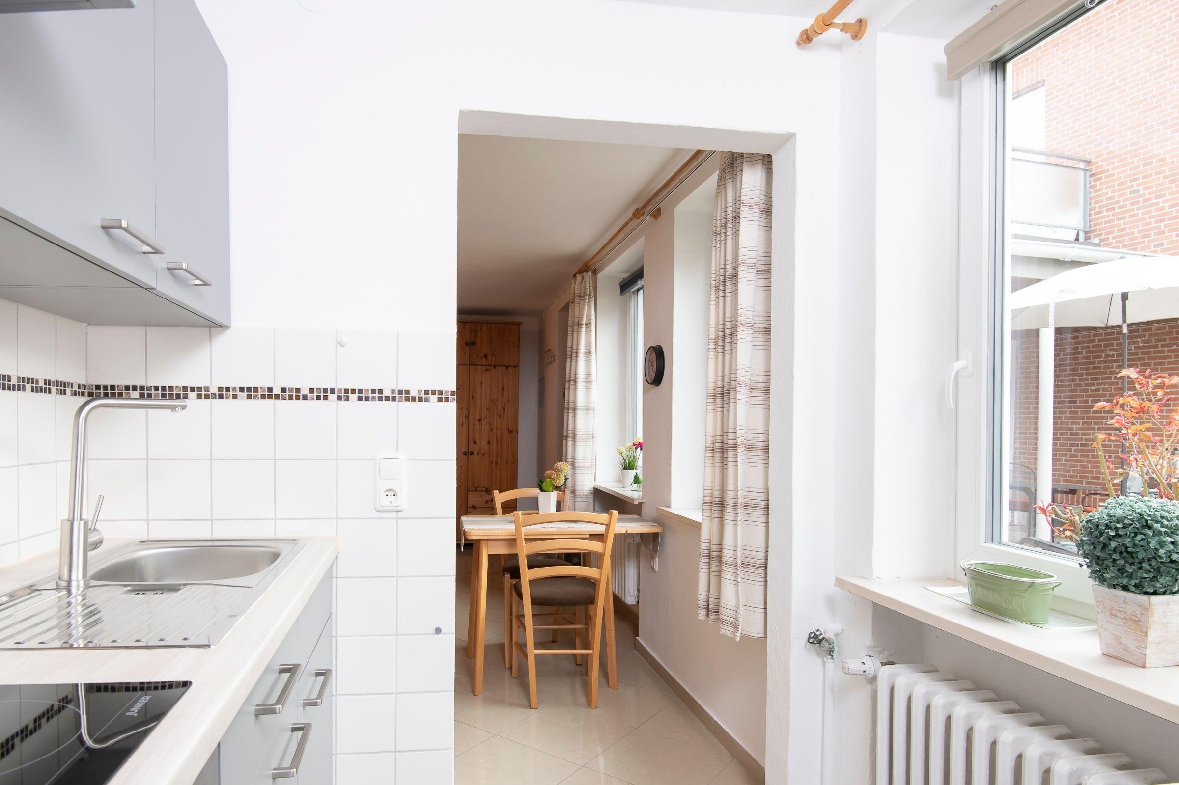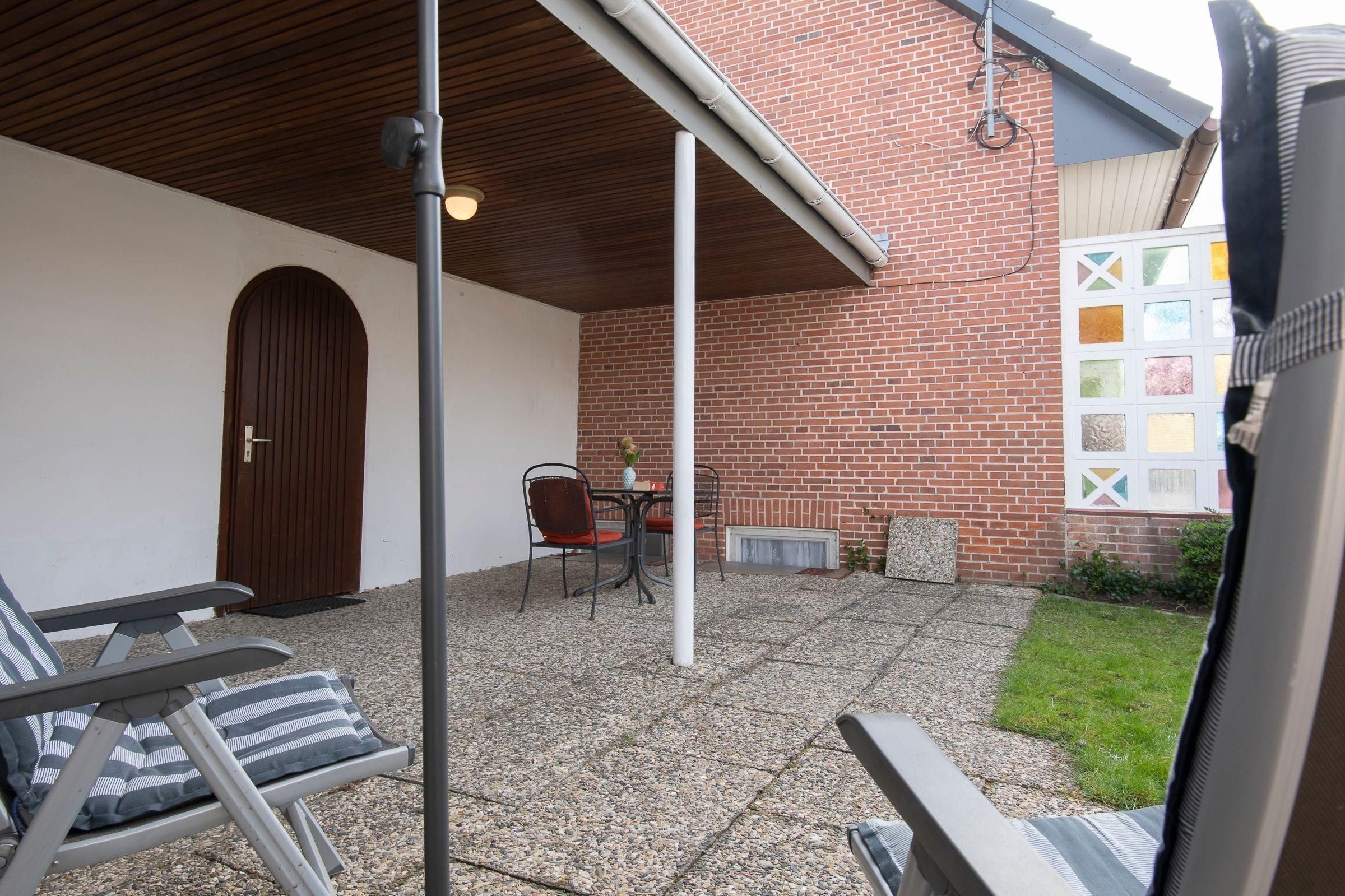 Die Ferienwohnung hat einen separaten Zugang zu einem abgeschlossenen, kleinen Innenhof mit überdachter Terrasse. Dort stehen Ihnen selbstverständlich Gartenmöbel und ein Sonnenschirm zur Verfügung.