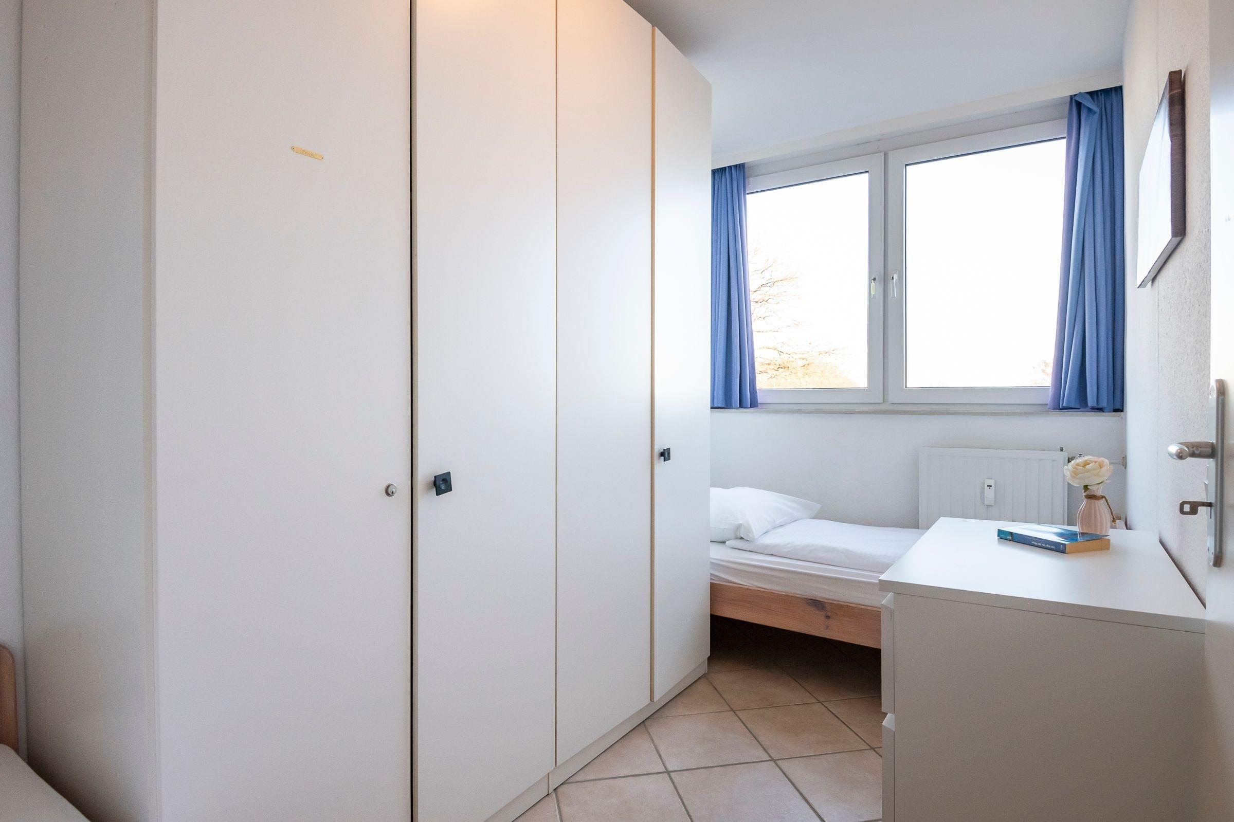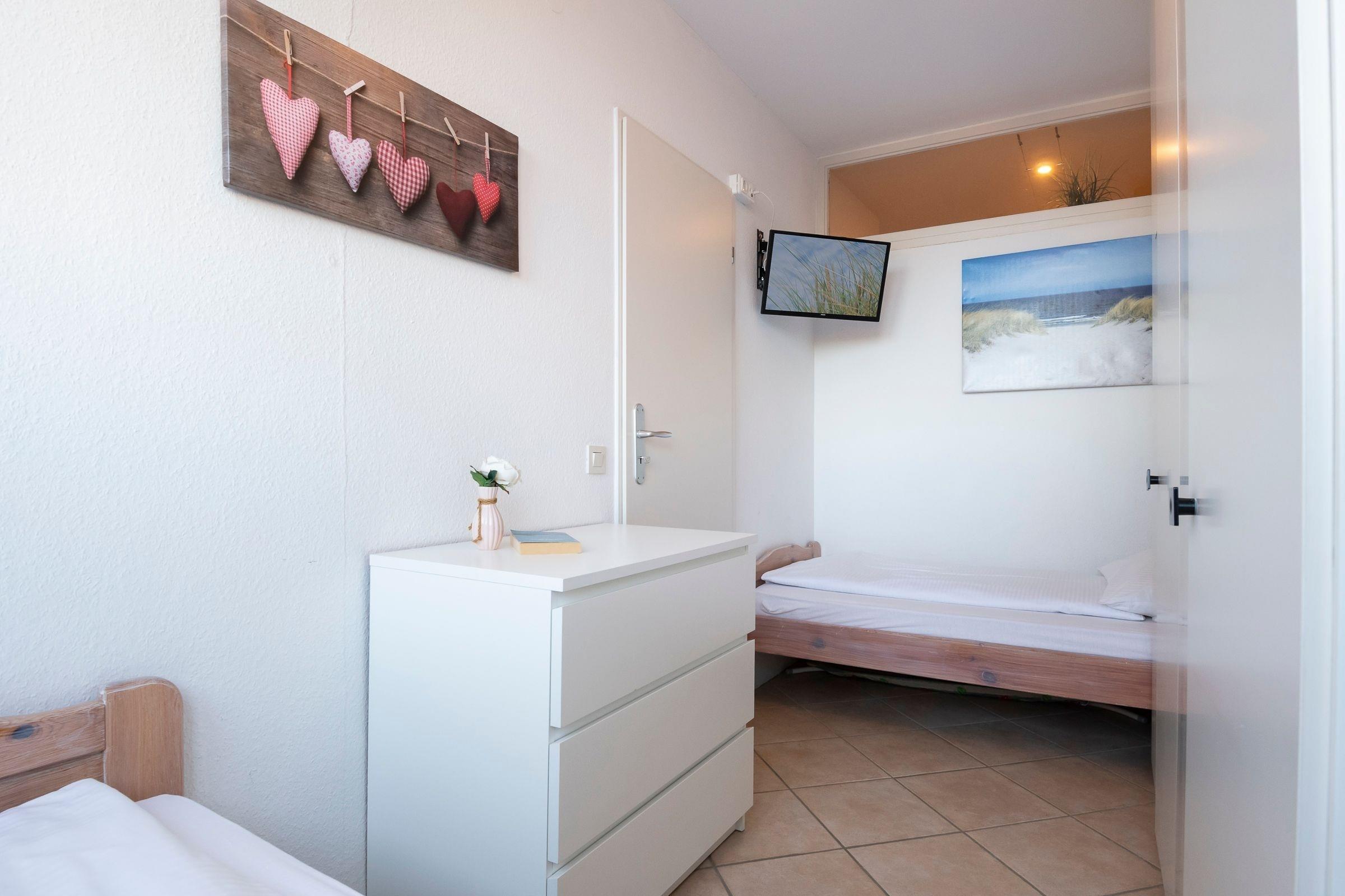 Schlafzimmer: 2 Einzelbetten (je 80x190 cm), TV, Verdunkelung (Vorhänge)