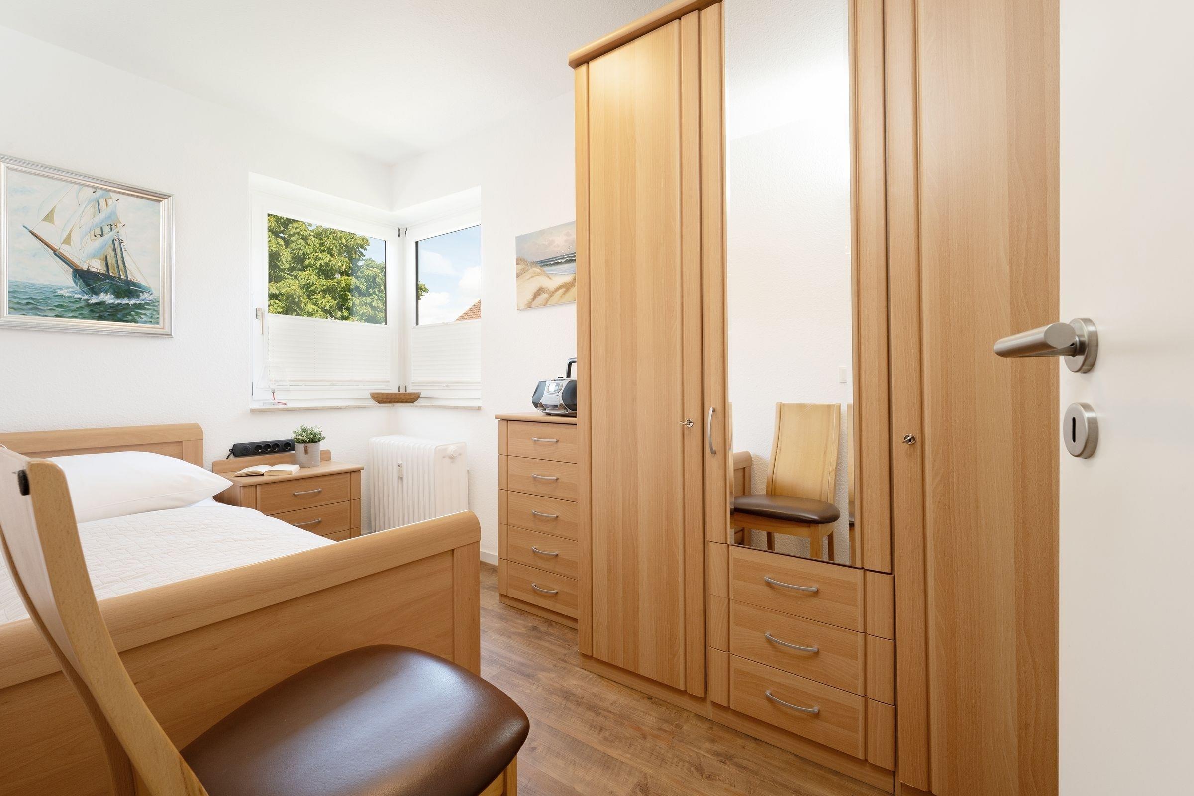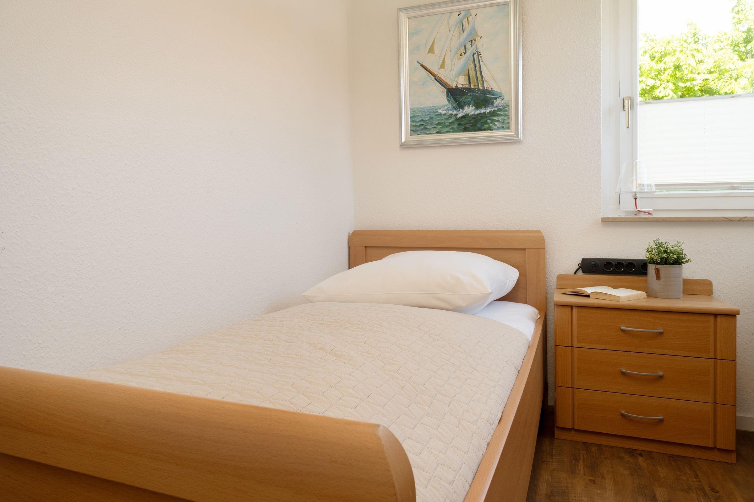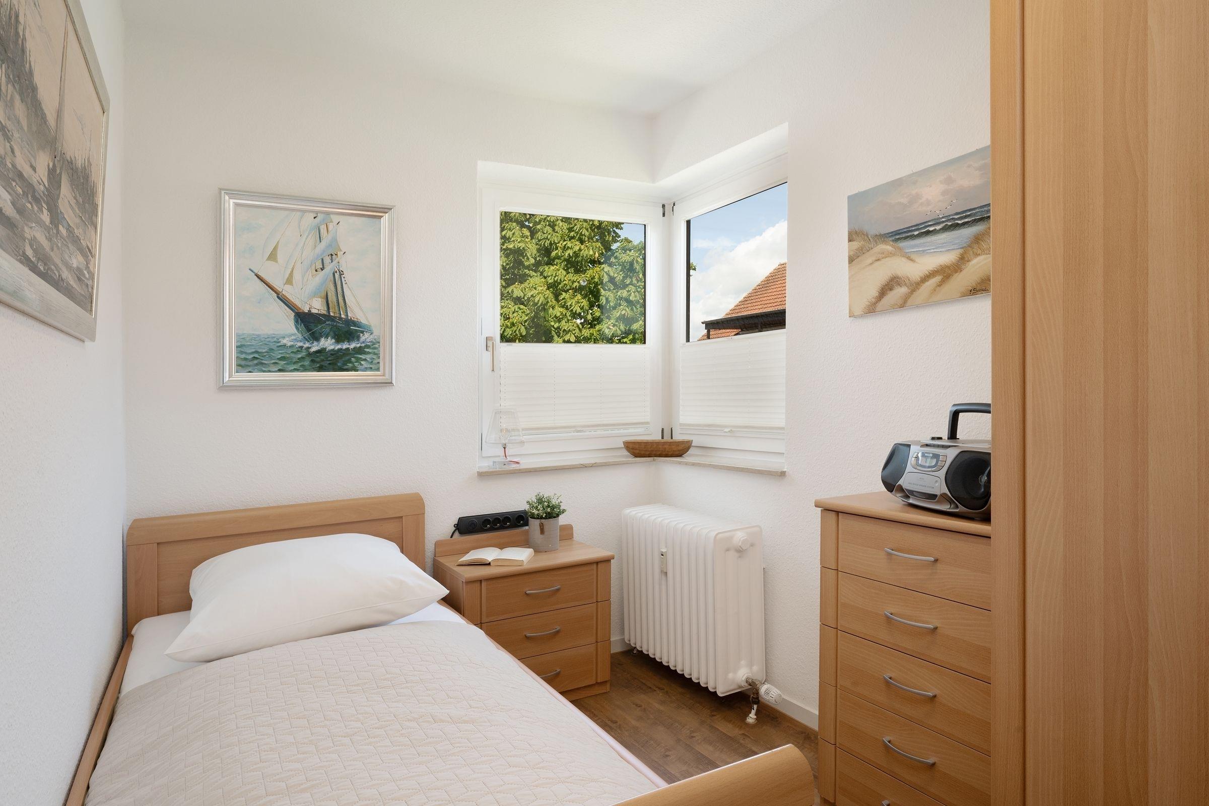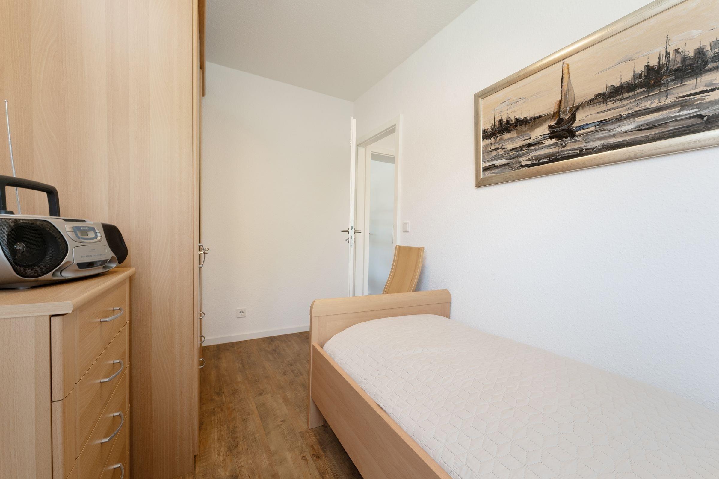 Schlafzimmer: 1 Einzelbett (80x200 cm), Kleiderschrank, Plissee, kein Platz für Babybett vorhanden