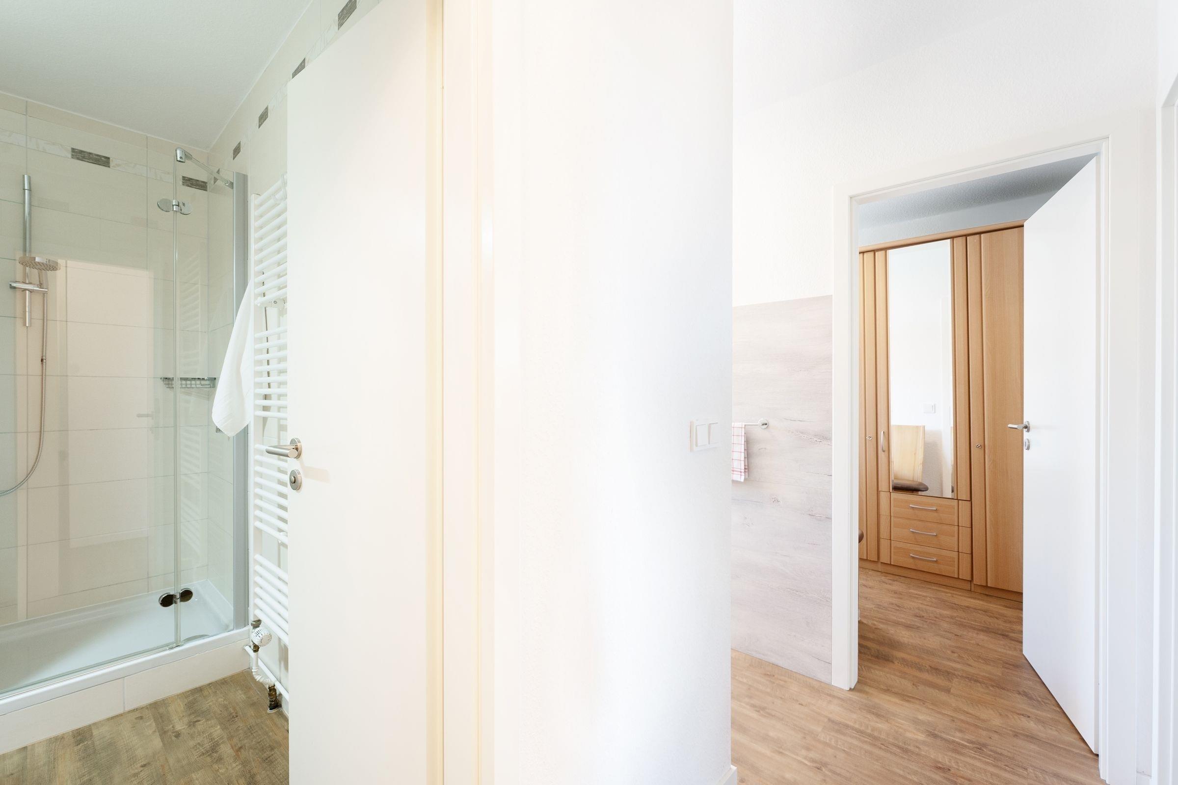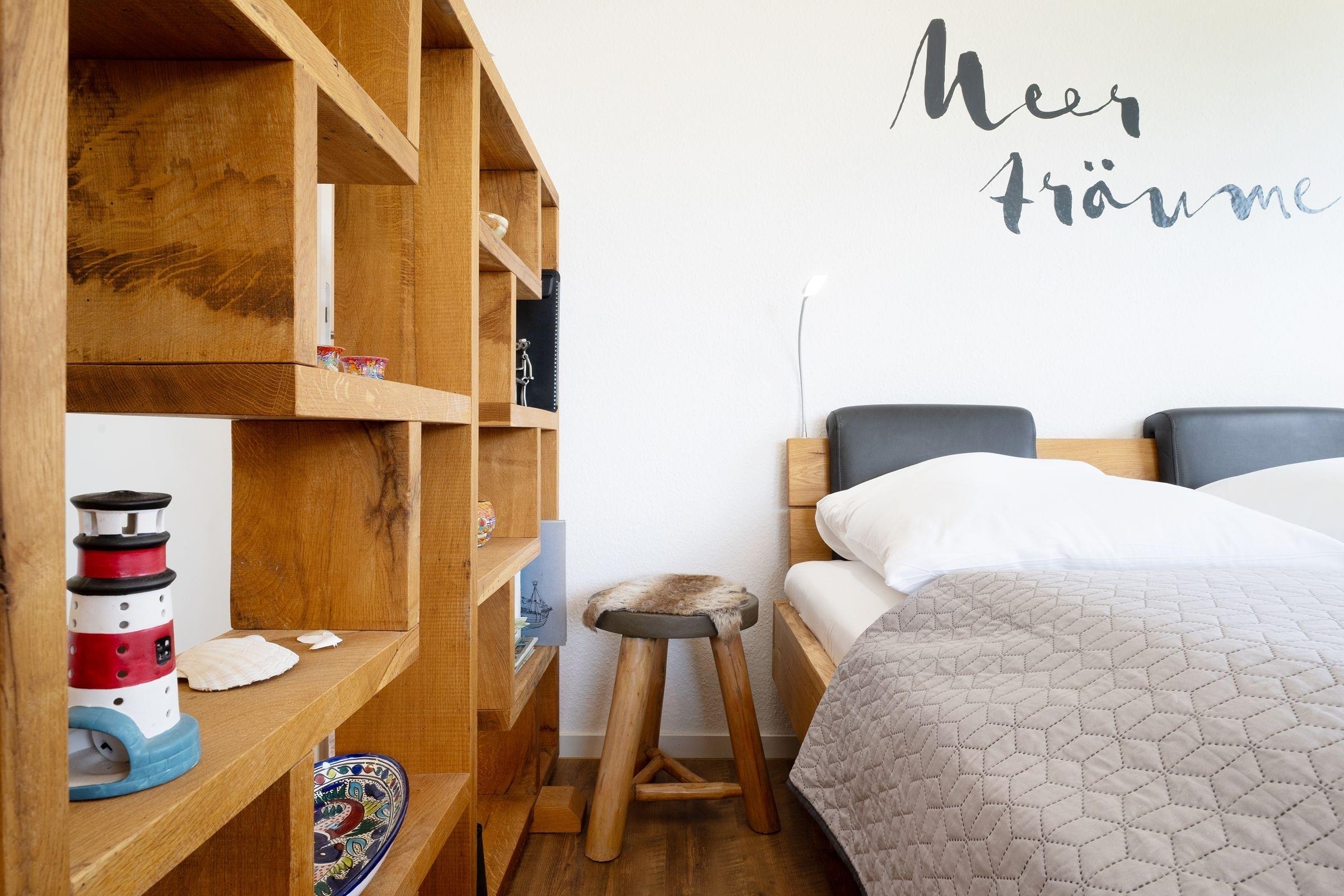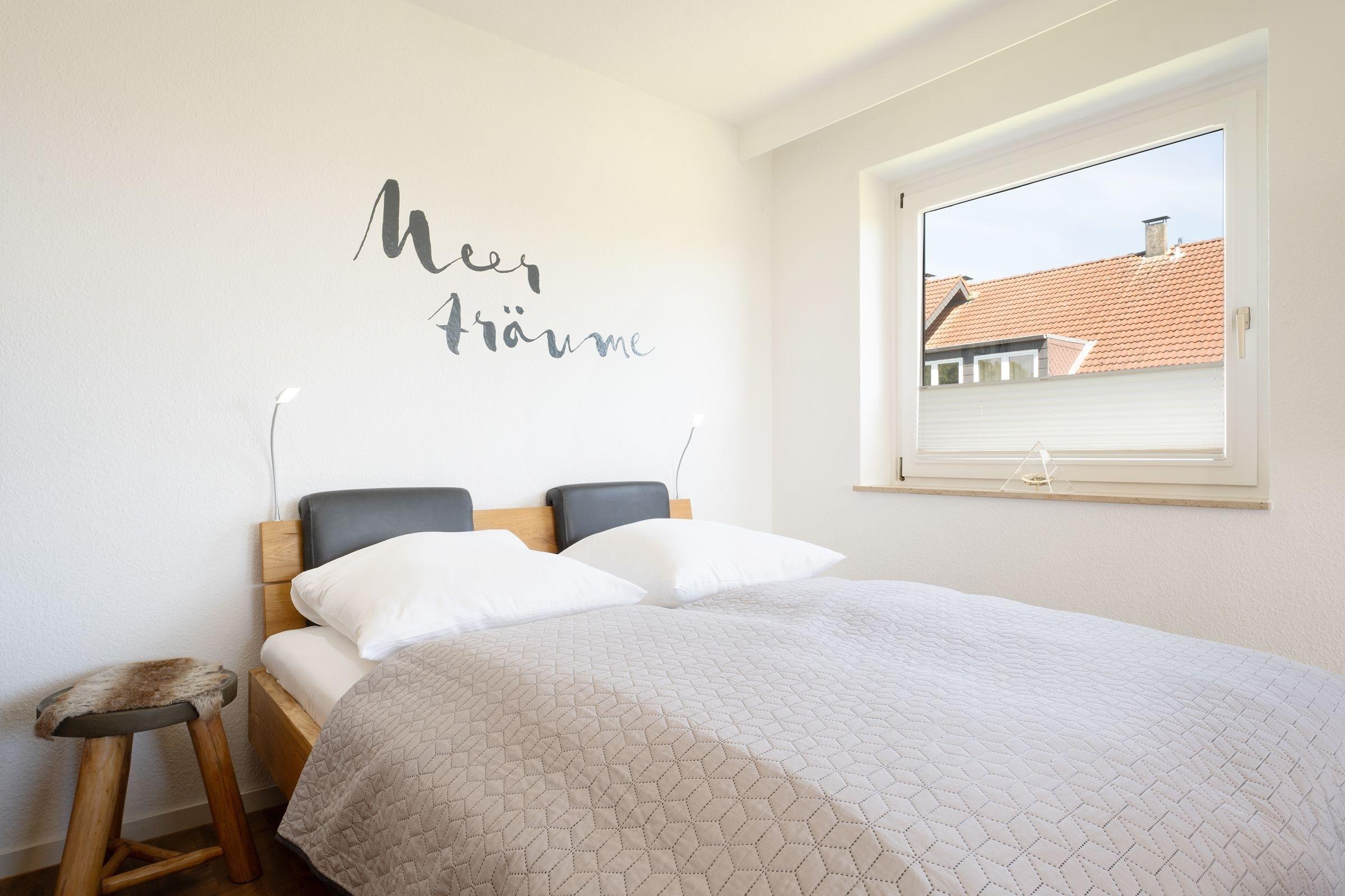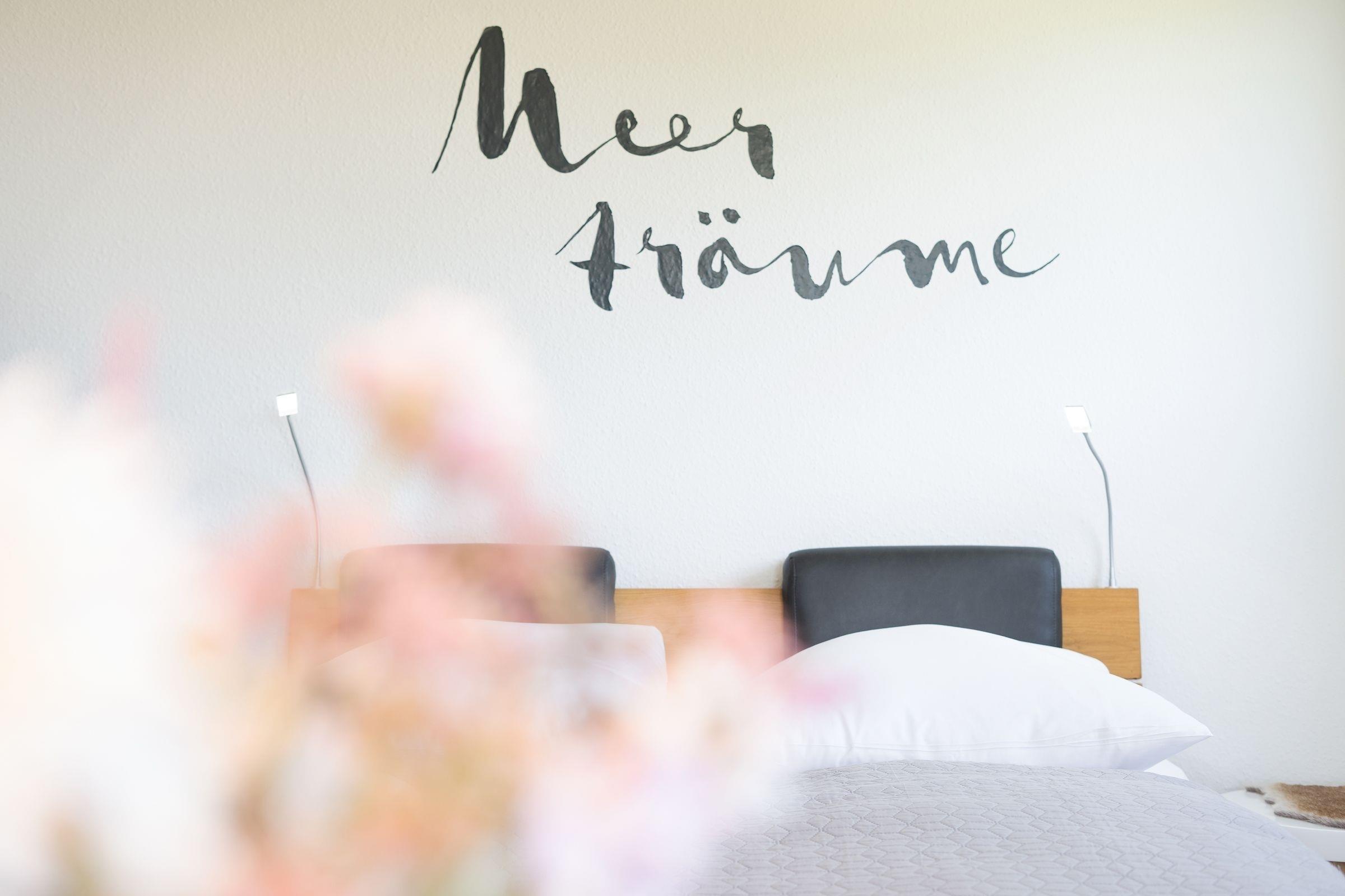 Morgens vom Balkon aus die gute Seeluft genießen? Oder gleich den Tag mit einem Spaziergang am Meer starten? Die Ferienwohnung Meerträume liegt nur rund 100 Meter vom Ostseestrand entfernt und besticht nicht nur durch ihre Lage, sondern auch durch ihre schöne maritime Einrichtung. Entspannen Sie auf dem kuscheligen, meeresblauen Sofa vor dem TV oder freuen Sie sich auf dem möblierten Balkon über den Meerblick. Leckere Mahlzeiten dazu können Sie in der separaten Küche zubereiten. Die Ausstattung bietet Extras wie Espressomaschine (Nespresso) und Geschirrspüler. Vom Meer träumen werden Sie sicherlich im bequemen Doppelbett (160x200 cm) im Wohnbereich, gemütlich durch einen Raumteiler abgetrennt. Zudem steht ein Einzelbett (80x200 cm) im Schlafzimmer. Das innenliegende Duschbad mit Handtuchwärmer ist hell gefliest.