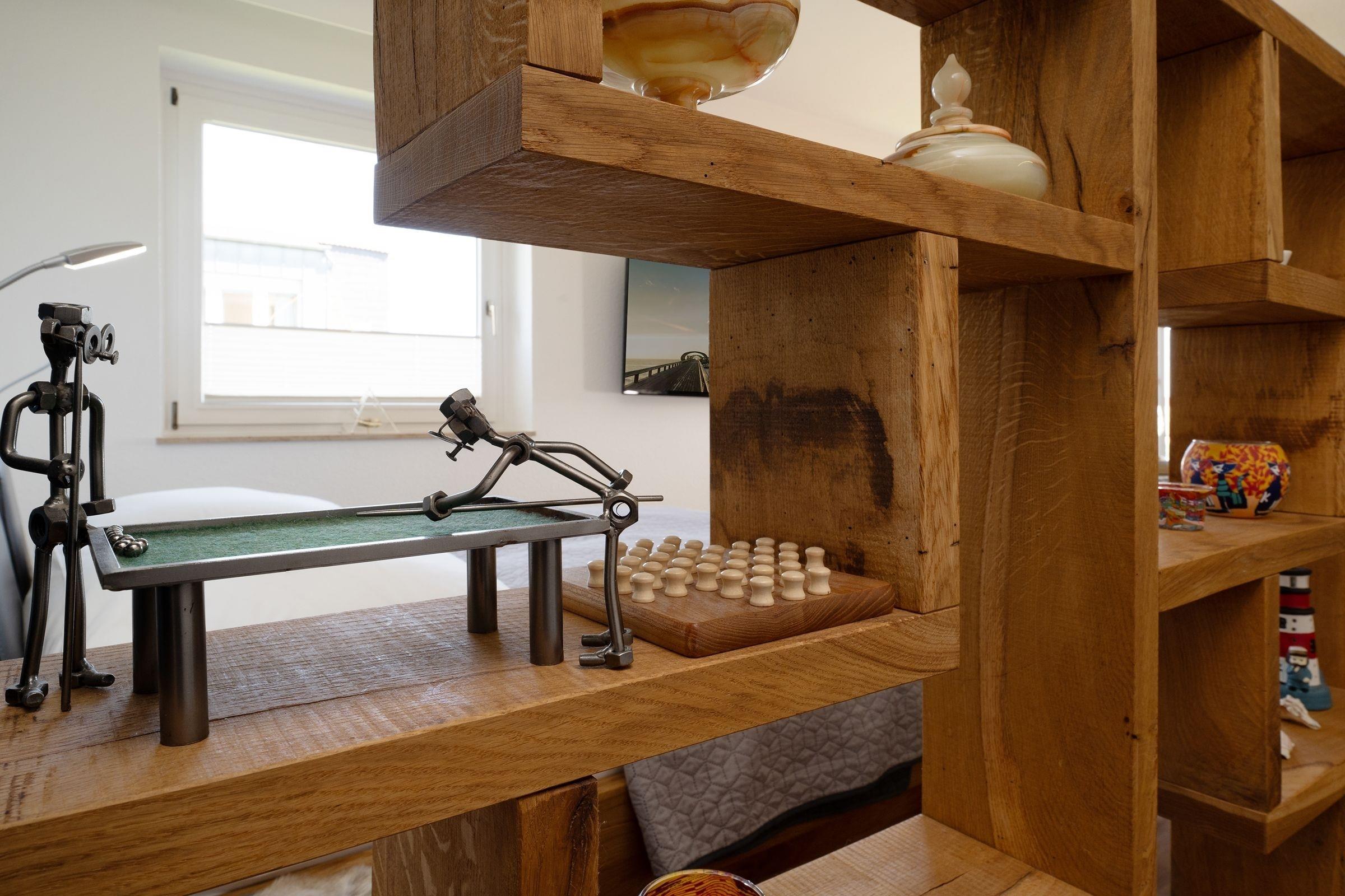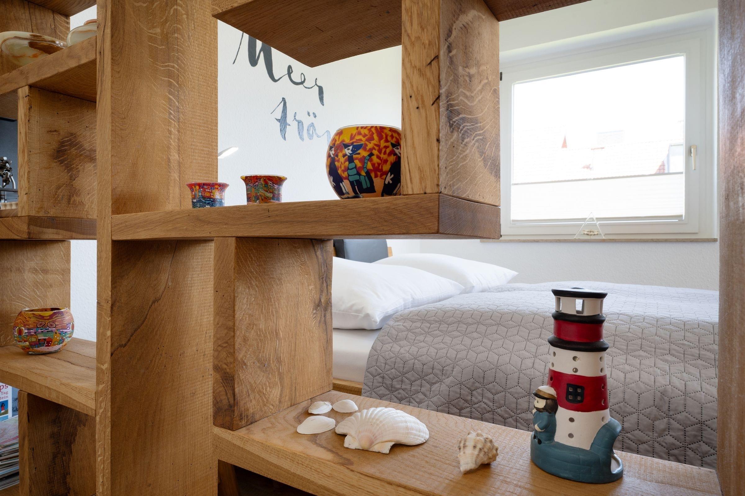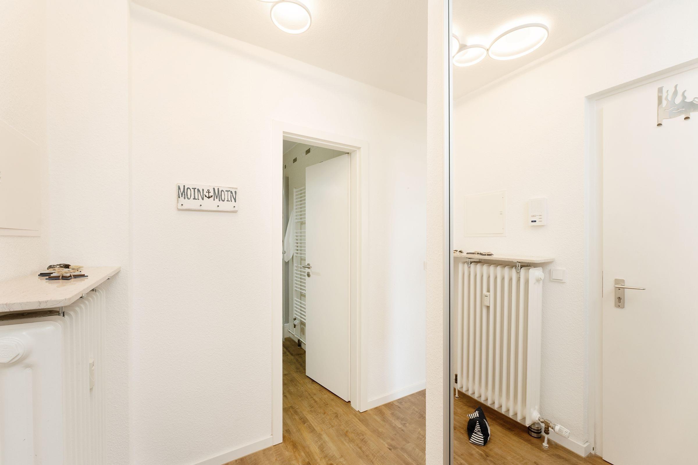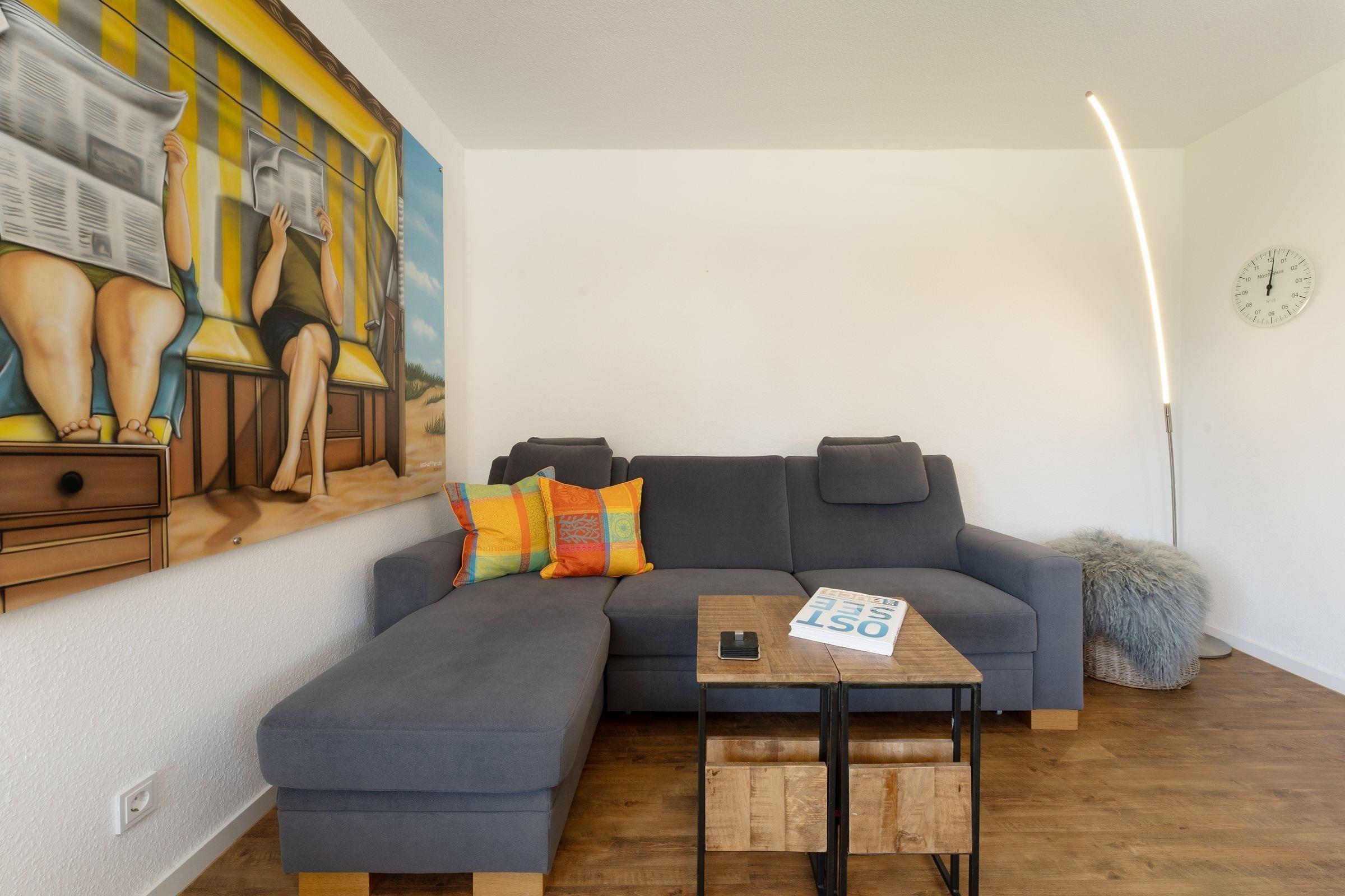 Morgens vom Balkon aus die gute Seeluft genießen? Oder gleich den Tag mit einem Spaziergang am Meer starten? Die Ferienwohnung Meerträume liegt nur rund 100 Meter vom Ostseestrand entfernt und besticht nicht nur durch ihre Lage, sondern auch durch ihre schöne maritime Einrichtung. Entspannen Sie auf dem kuscheligen, meeresblauen Sofa vor dem TV oder freuen Sie sich auf dem möblierten Balkon über den Meerblick. Leckere Mahlzeiten dazu können Sie in der separaten Küche zubereiten. Die Ausstattung bietet Extras wie Espressomaschine (Nespresso) und Geschirrspüler. Vom Meer träumen werden Sie sicherlich im bequemen Doppelbett (160x200 cm) im Wohnbereich, gemütlich durch einen Raumteiler abgetrennt. Zudem steht ein Einzelbett (80x200 cm) im Schlafzimmer. Das innenliegende Duschbad mit Handtuchwärmer ist hell gefliest.