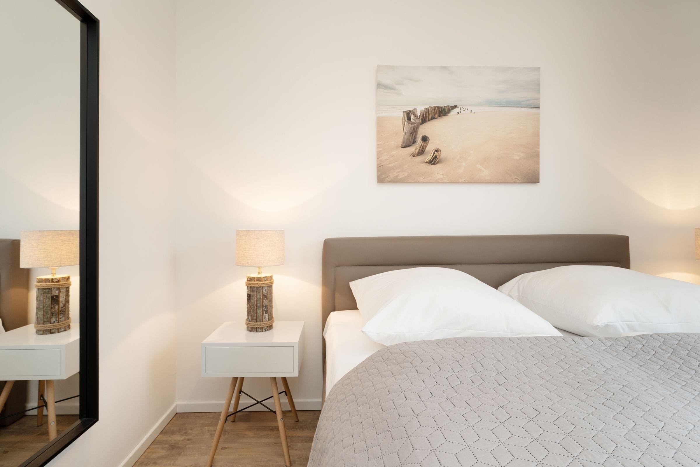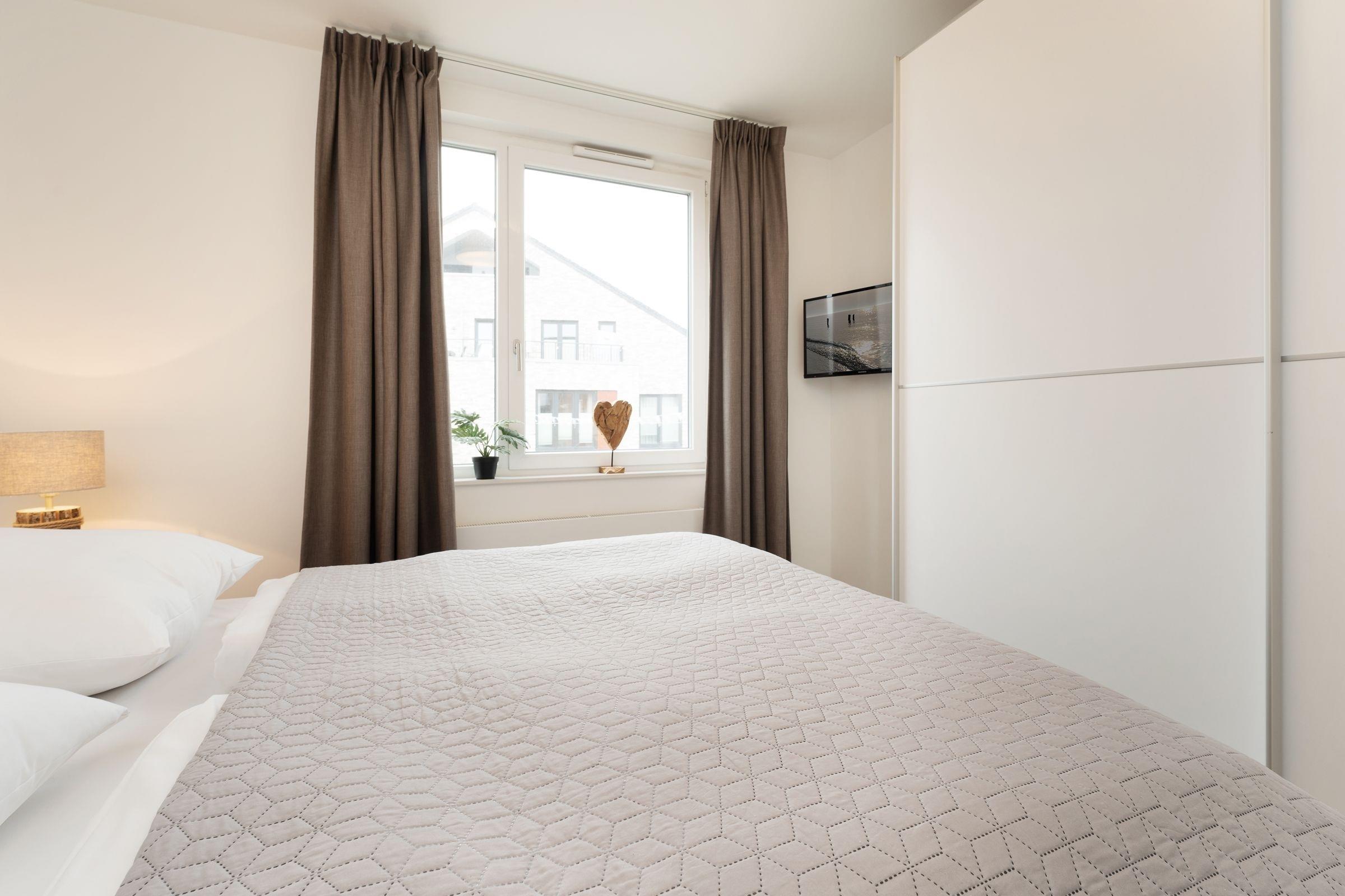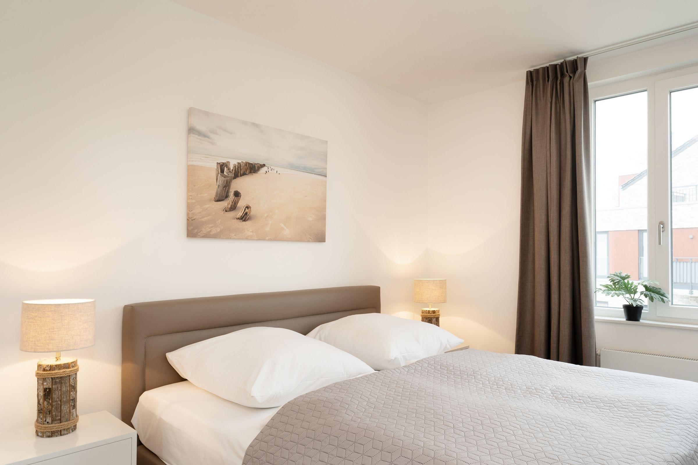Der Südbalkon ist ein Highlight, auf dem Sie die Sonne genießen und die frische Meeresbrise spüren können. Die beiden Schlafzimmer, eines mit Doppelbett und TV, das andere mit zwei Einzelbetten, bieten komfortablen Schlaf und viel Stauraum in je einem Kleiderschrank. Das moderne Badezimmer ist mit einer bodengleichen Dusche, Fußbodenheizung, Handtuchwärmer und Haartrockner ausgestattet.