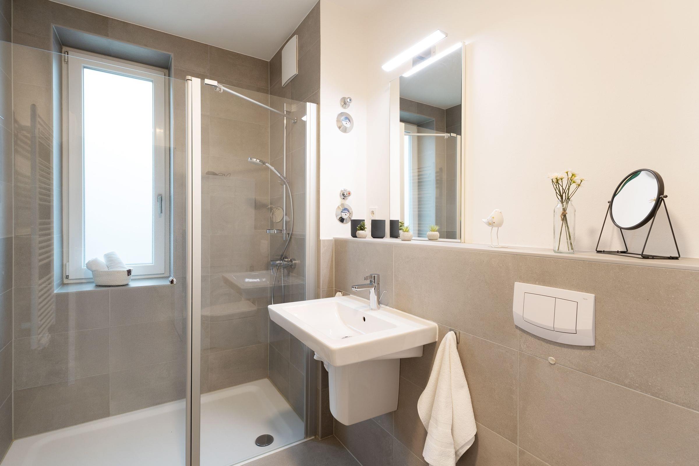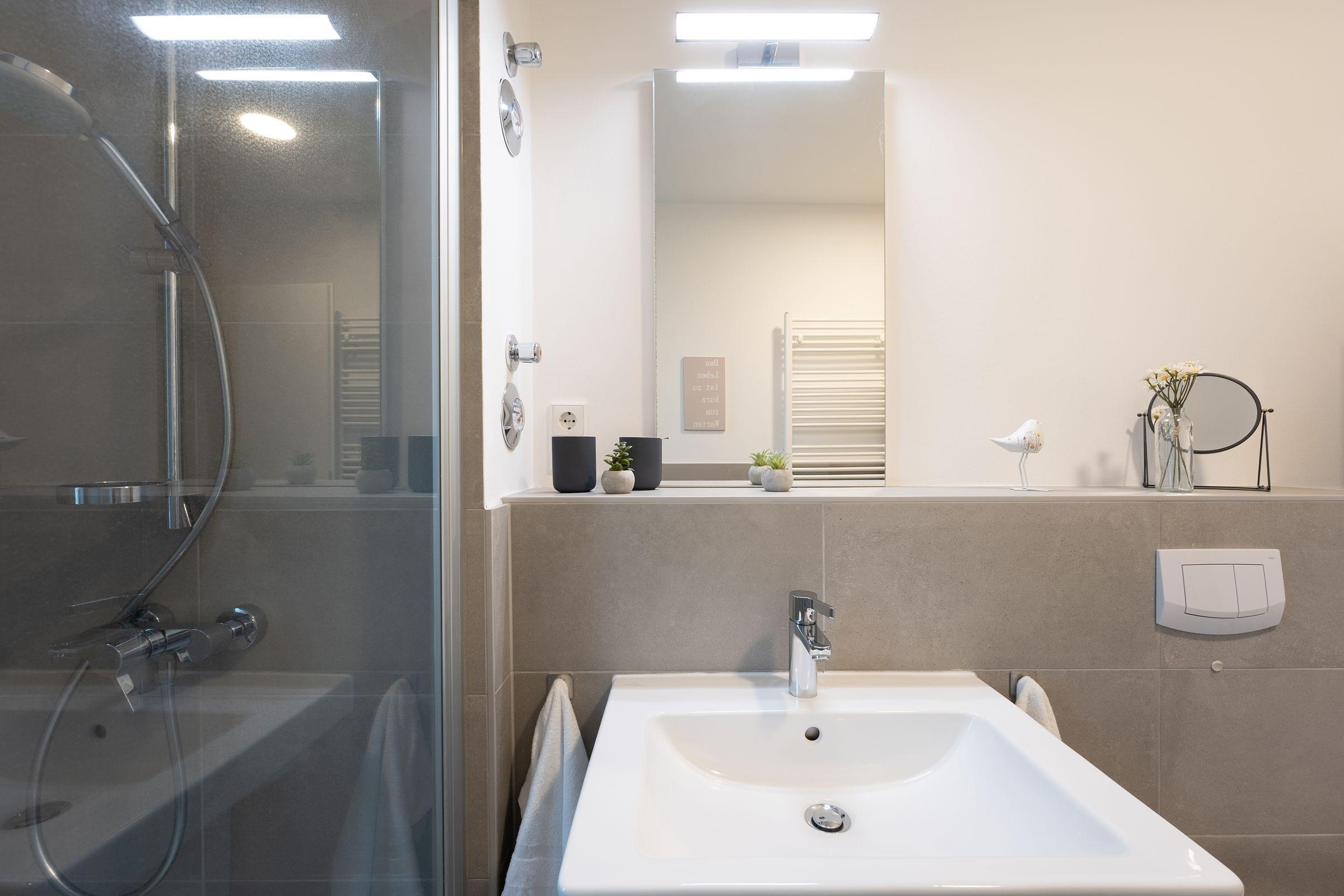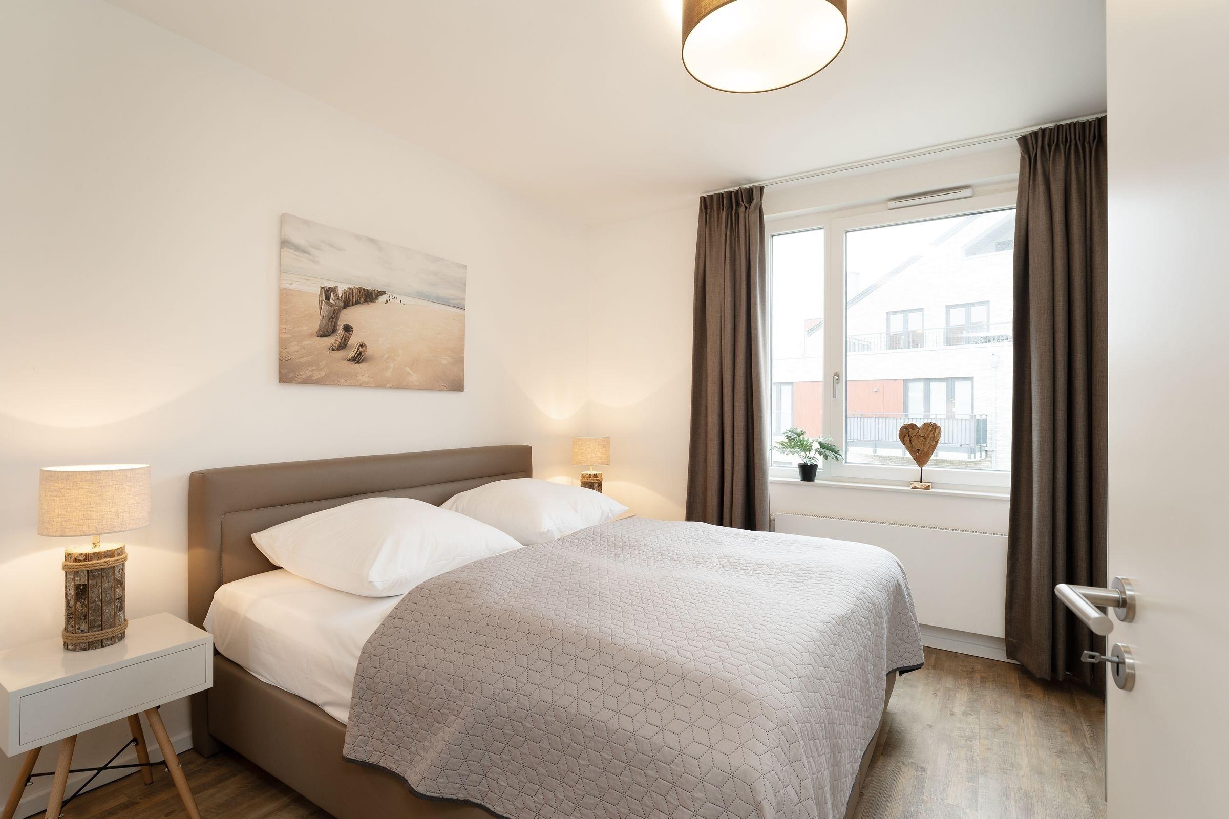 Der Südbalkon ist ein Highlight, auf dem Sie die Sonne genießen und die frische Meeresbrise spüren können. Die beiden Schlafzimmer, eines mit Doppelbett und TV, das andere mit zwei Einzelbetten, bieten komfortablen Schlaf und viel Stauraum in je einem Kleiderschrank. Das moderne Badezimmer ist mit einer bodengleichen Dusche, Fußbodenheizung, Handtuchwärmer und Haartrockner ausgestattet.
