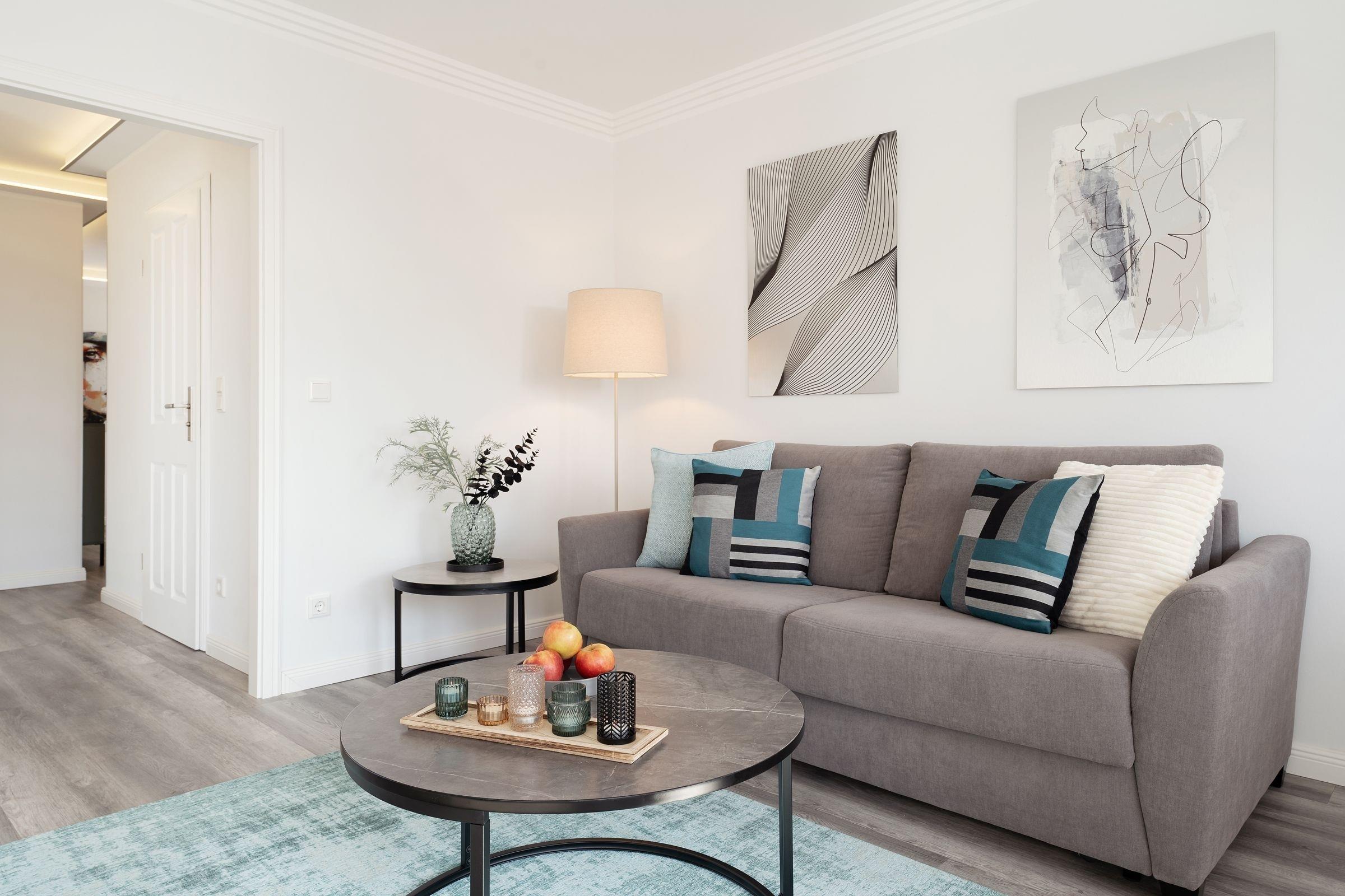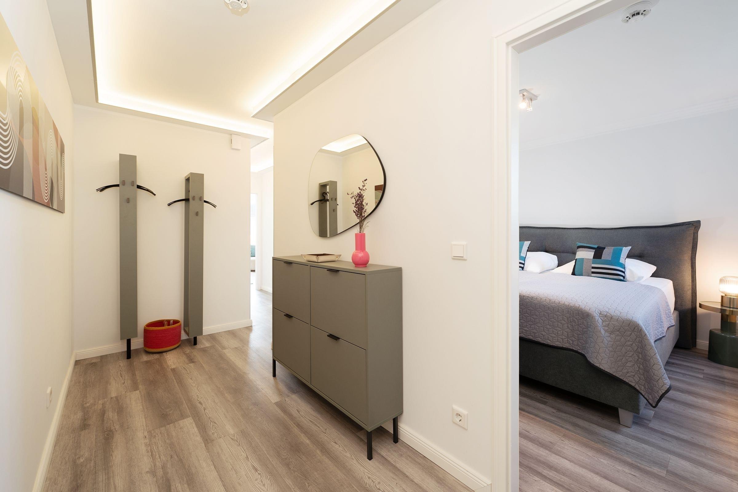 Hier trifft Moderne auf guten Geschmack. Die traumhafte Ferienwohnung Jellyfish bietet die perfekte Unterkunft für einen erholsamen Ostseeurlaub. Nur 240 m vom Strand entfernt, genießen Sie hier eine moderne und komfortable Ausstattung Das helle Wohnzimmer lädt mit einem bequemen Sofa, einem Sessel und einem TV zum Entspannen ein. Auch steht hier ein stylischer Essplatz für Sie bereit. Große Fenster lassen viel Licht in den Raum und sorgen für eine freundliche Atmosphäre. Vom Wohnbereich aus gelangen Sie auf den möblierten Balkon mit Südausrichtung für angenehme Stunden im Freien. Die halb-offene Küche ist gut ausgestattet mit einem Cerankochfeld, Backofen, Kühlschrank mit Gefrierfach, Kaffeemaschine, Toaster und Spülmaschine. Das separate Schlafzimmer ist mit einem komfortablen Doppelboxspringbett (2000x200 cm) und ausreichend Stauraum eingerichtet. Das Sofa im Wohnbereich bietet bei Bedarf einen Schlafplatz (140x200 cm) für zwei weitere Gäste. Das Badezimmer verfügt über eine Dusche, Waschbecken, WC und einen Haartrockner.