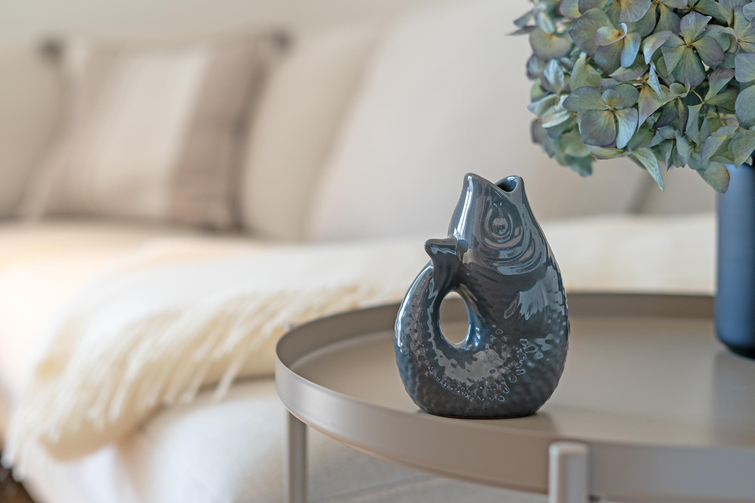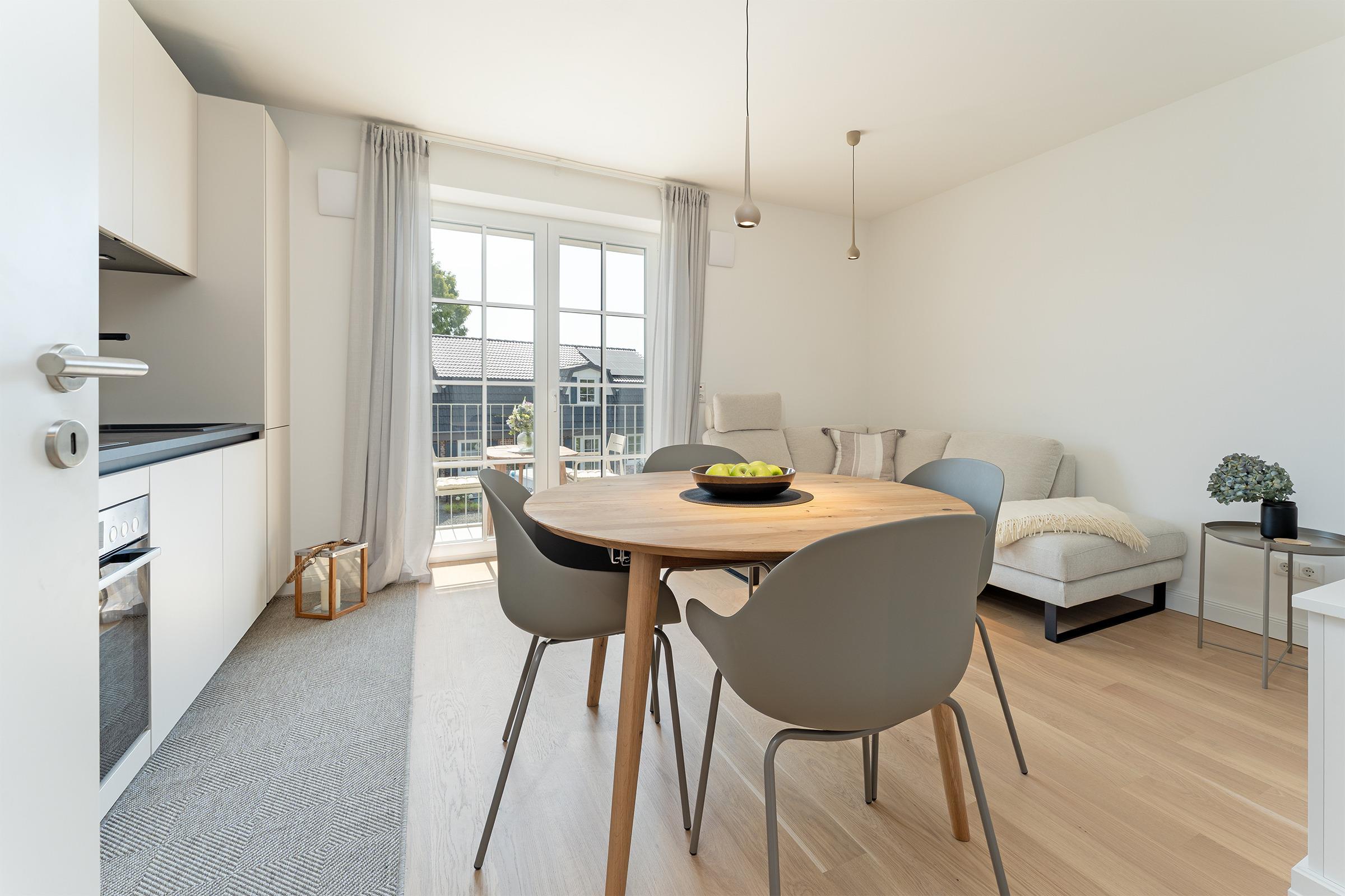 Der offen gestaltete Wohn- und Essbereich mit angrenzender Küche besticht durch eine geschmackvolle, zeitlos-moderne Einrichtung mit liebevollen maritimen Akzenten. Im Wohnbereich laden ein gemütliches Sofa und ein Flachbild-TV zu entspannten Stunden ein. Die hochwertige, offene Küche ist vollständig ausgestattet und lässt keine Wünsche offen.