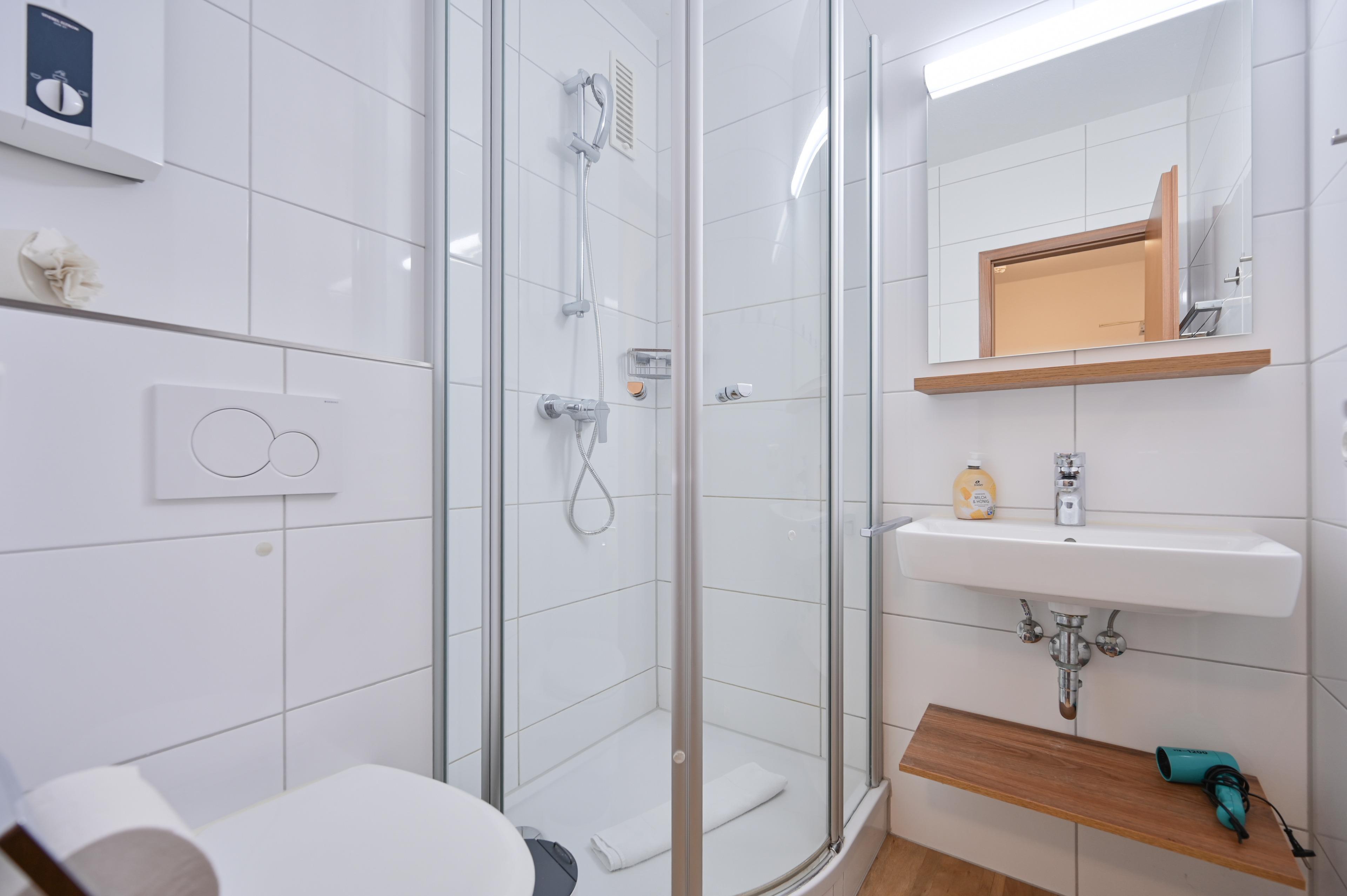 Das innenliegende Bad verfügt über Dusche und WC.