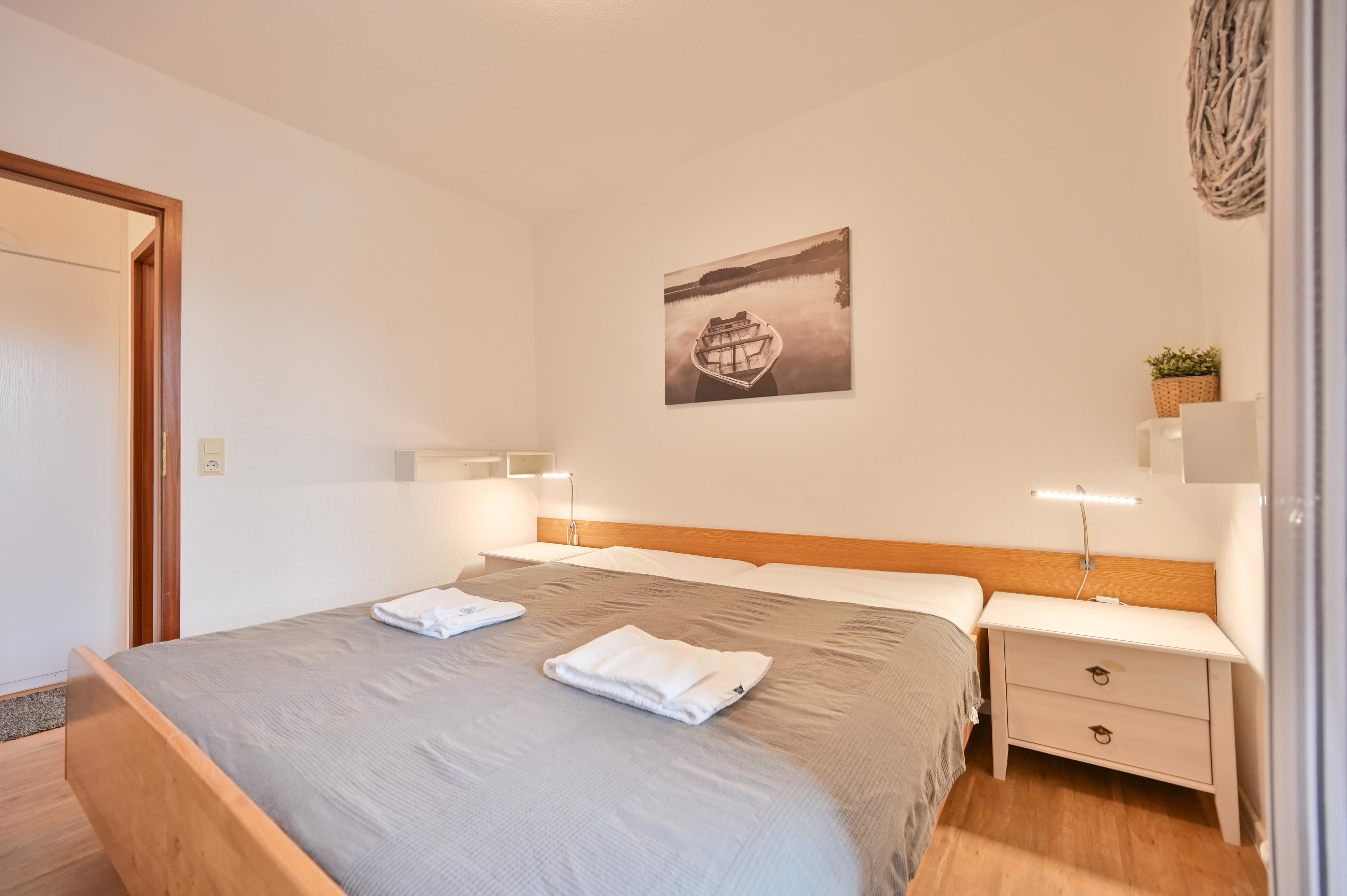 Das Schlafzimmer ist mit einem komfortablen Doppelbett ausgestattet, perfekt für erholsame Nächte. Von hier aus haben Sie Zugang zum kleinen Balkon.