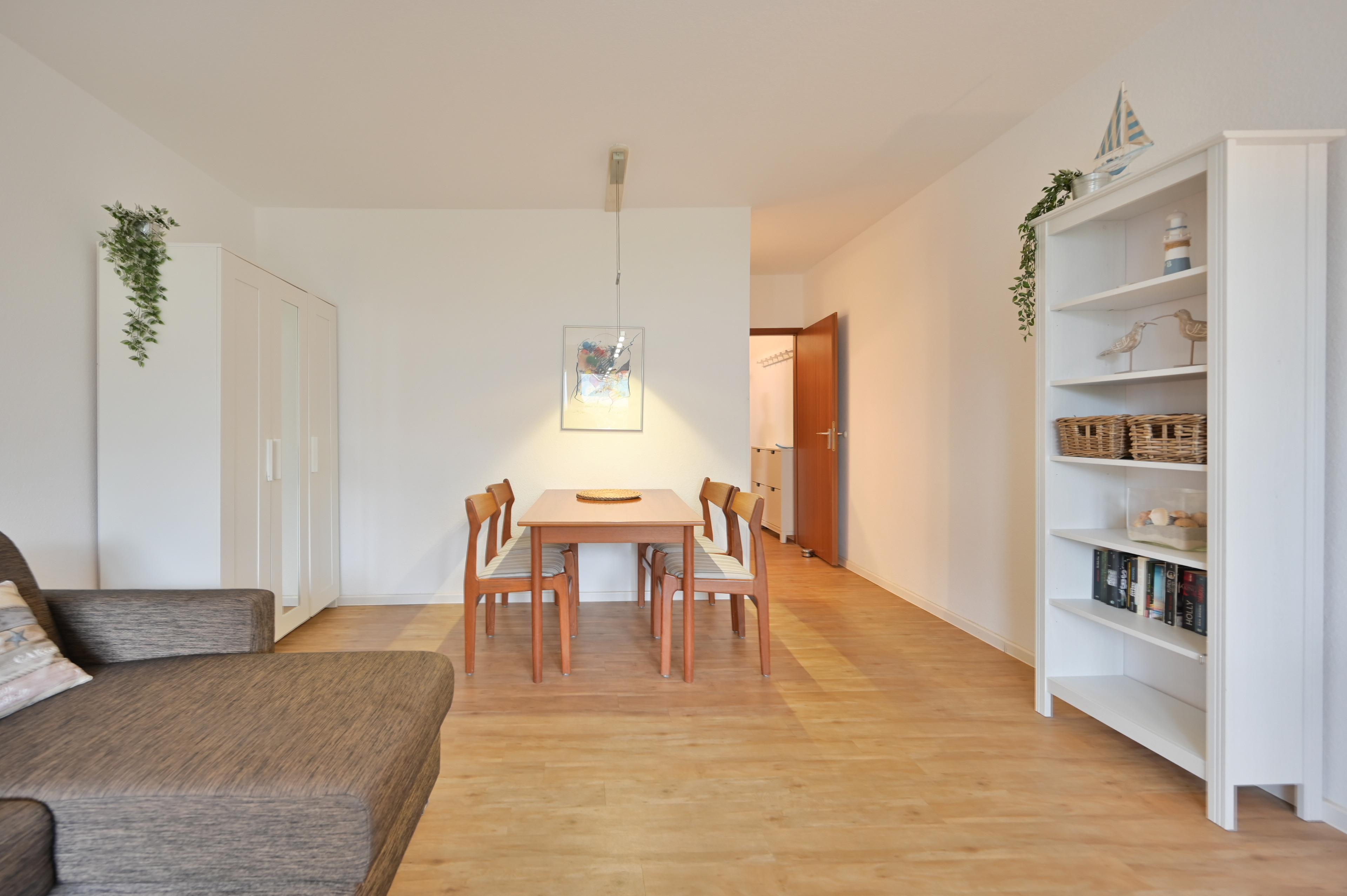 Im Wohnraum erwartet Sie ein gemütlicher Essbereich, ein Sofa mit Schlaffunktion sowie ein Flachbild-TV. Von hier aus gelangen Sie direkt auf die sonnige Terrasse, die zum Entspannen einlädt.
