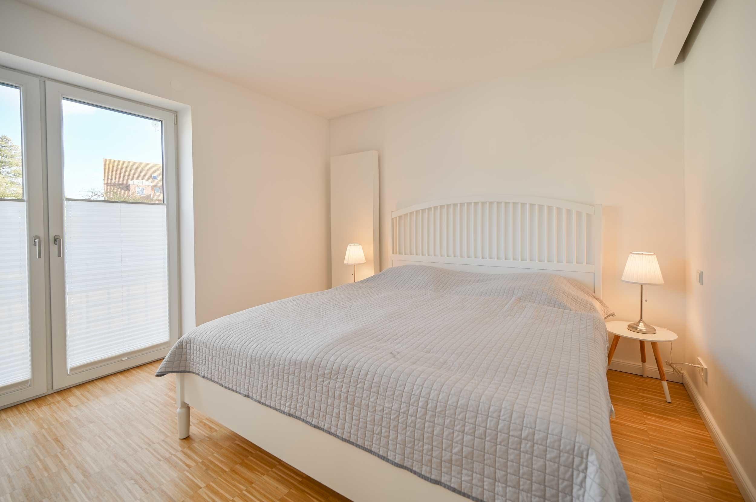 Ein Schlafzimmer ist mit Doppelbett, Nachttischen, Leseleuchten und Kleiderschrank eingerichtet, ein weiteres Schlafzimmer mit Doppelbett, Nachttischen, Leseleuchten und Kommode.