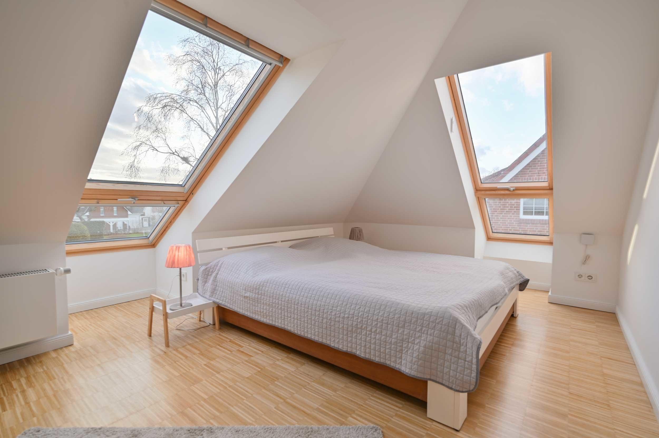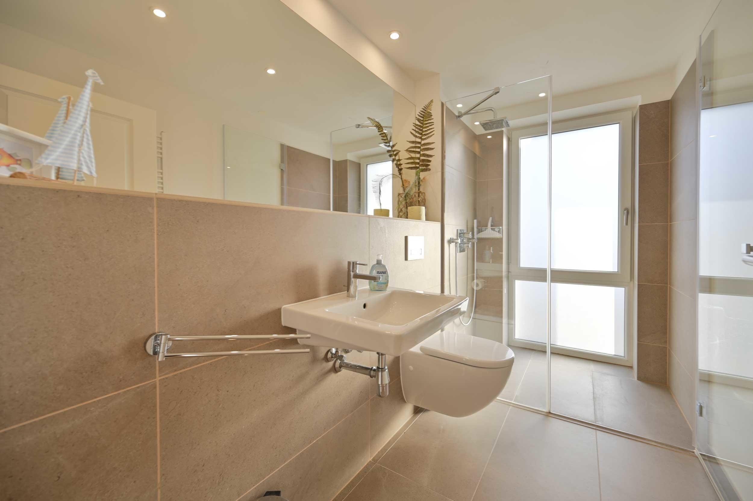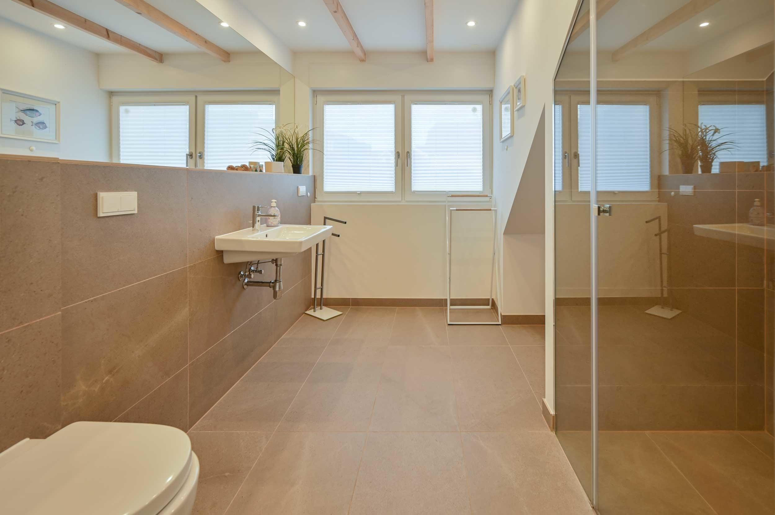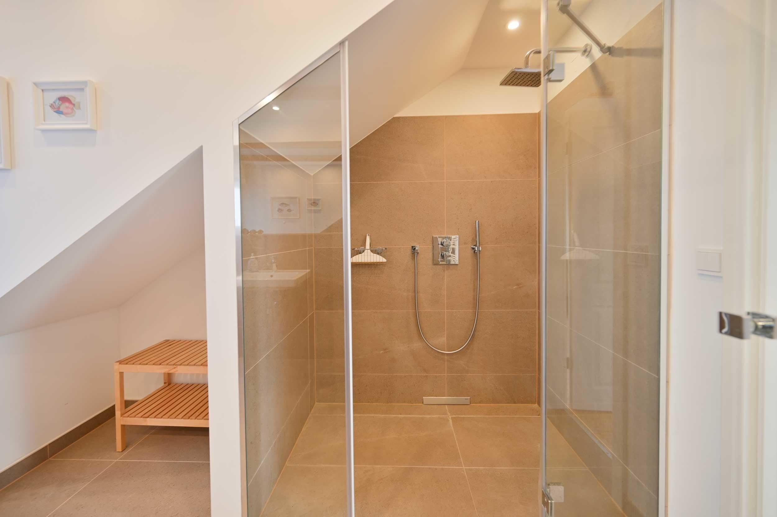 Im Obergeschoss des Hauses finden ein weiteres Duschbad mit WC, sowie einen zusätzlichen Wohnbereich mit Couch und Flachbild-TV. Von hier aus können Sie sogar bis zur Seebrücke von Kellenhusen blicken. Einige der Dachgeschossfenster sind mit dem Velux-Cabrio-System ausgestattet.