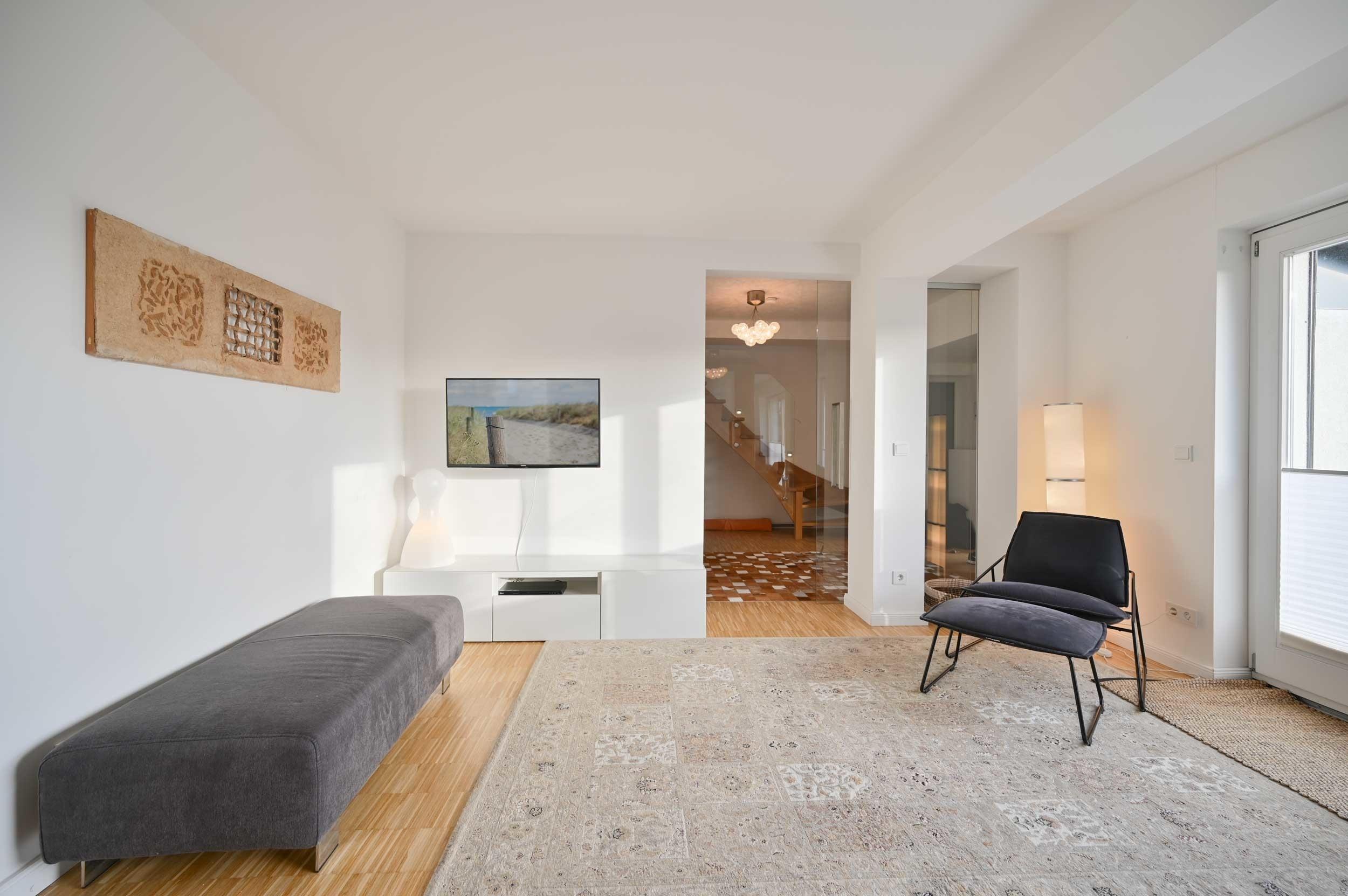 Das helle, modern eingerichtete Wohnzimmer verfügt über einen großen Essbereich mit 8 Stühlen, eine gemütliche Wohnlandschaft am großen Terrassenelement, ein Flachbild-TV, sowie eine offene, in das Raumkonzept integrierte Küche.