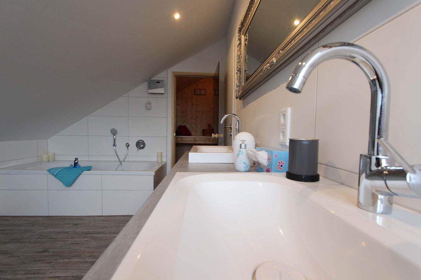 Im Urlaub herrlich ausschlafen: Das Schlafzimmer ist mit einem 1,80 m breiten Bett möbliert, im Kinderzimmer finden Sie zwei einzelne 0,90 m breite Betten plus ein Ausziehbett. Auch das Bad ist komfortabel ausgestattet. Neben Dusche und Badewanne dürfen Sie gern auch in der eingebauten Sauna entspannen.