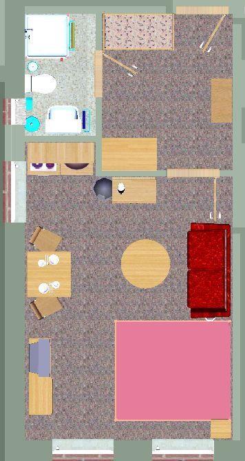 Sie ist kompakt und besteht aus einem kombinierten Wohn-/Schlafzimmer mit Doppelbett, Pantry-Küche, einem Flur und einem Duschbad. Dennoch ist sie vollwertig ausgestattet. In der Küche befindet sich eine Mikrowelle, ein Kühlschrank mit Gefrierfach, Herd mit Ceranfeld, Toaster, Wasserkocher und Kaffeemaschine.