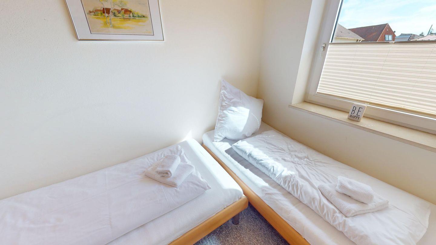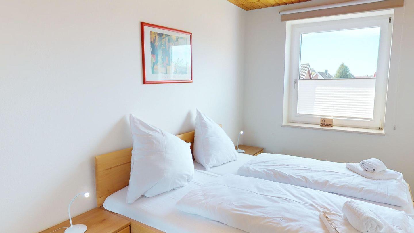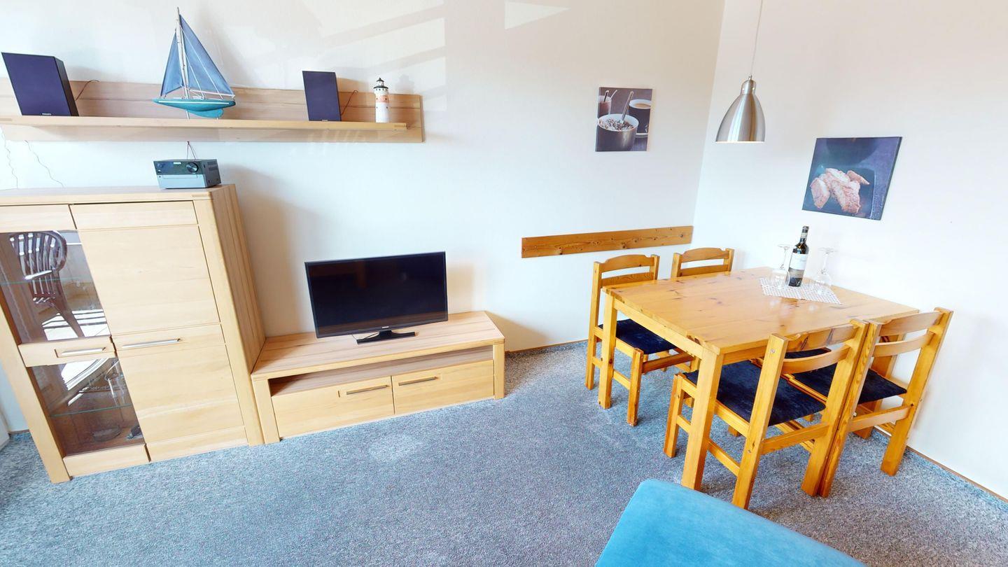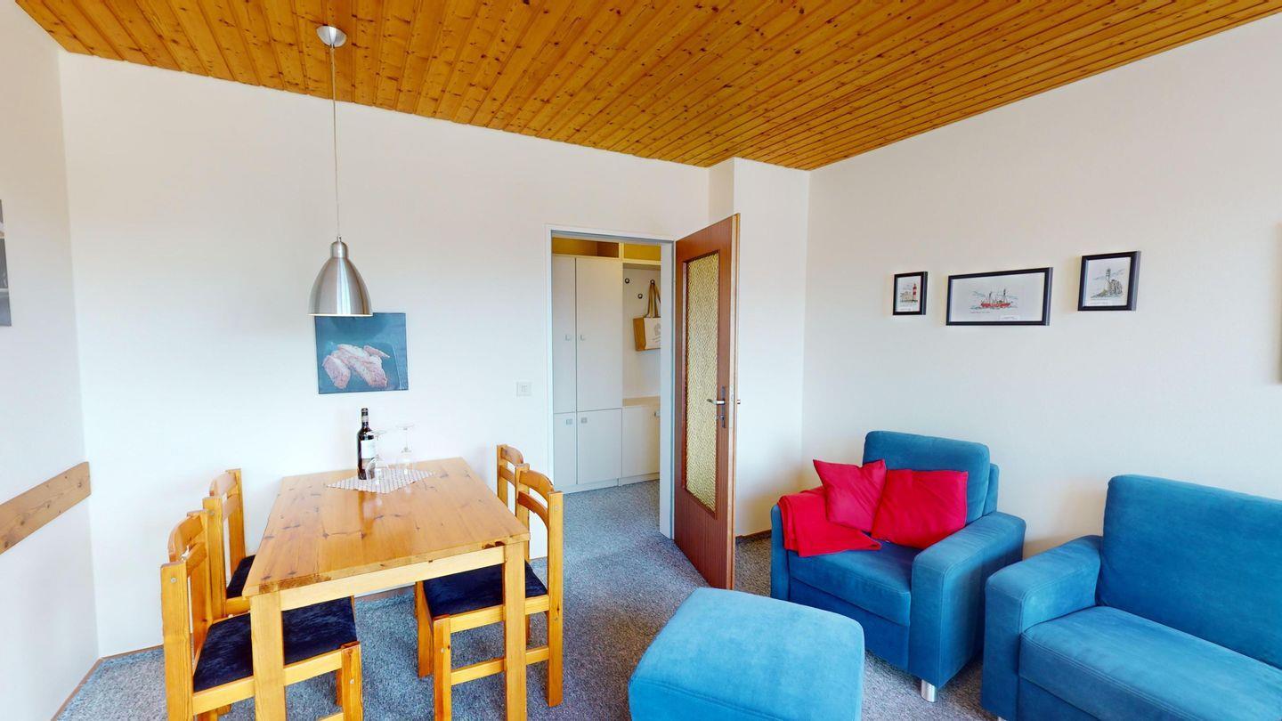 Die Wohnung ist über wenige Stufen zu erreichen und besteht aus einem Wohn-/Esszimmer, 2 Schlafzimmern (eins mit Doppelbett, eins mit zwei Einzelbetten), einer Küche und einem Duschbad. In der Wohnung gibt es eine Fußbodenheizung.