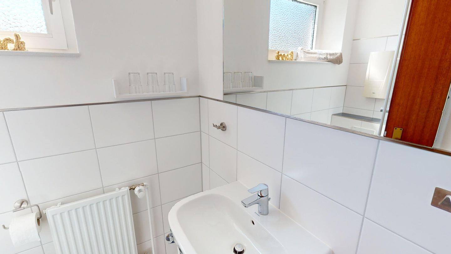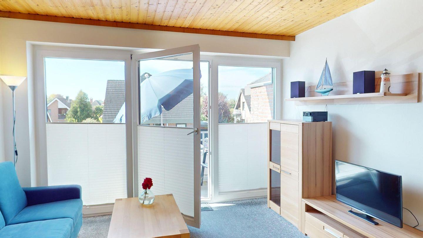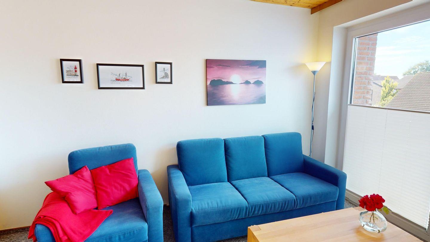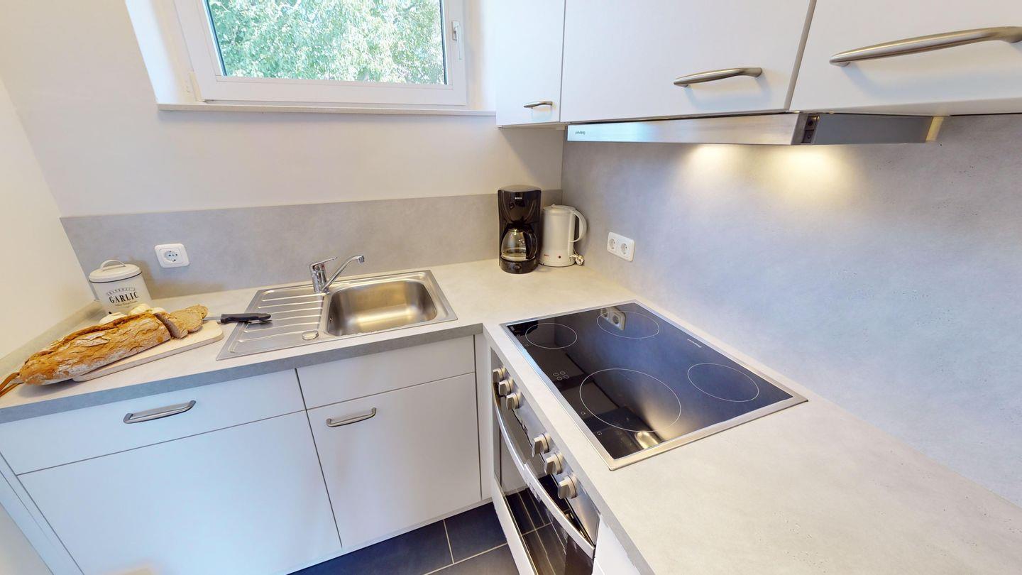 Die Wohnung ist über wenige Stufen zu erreichen und besteht aus einem Wohn-/Esszimmer, 2 Schlafzimmern (eins mit Doppelbett, eins mit zwei Einzelbetten), einer Küche und einem Duschbad. In der Wohnung gibt es eine Fußbodenheizung.