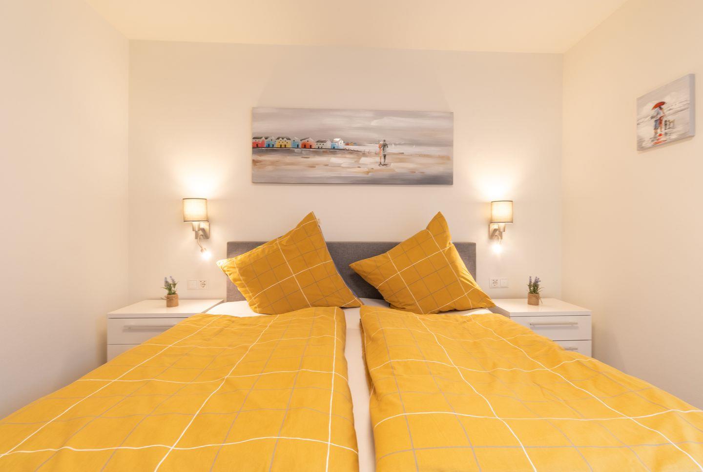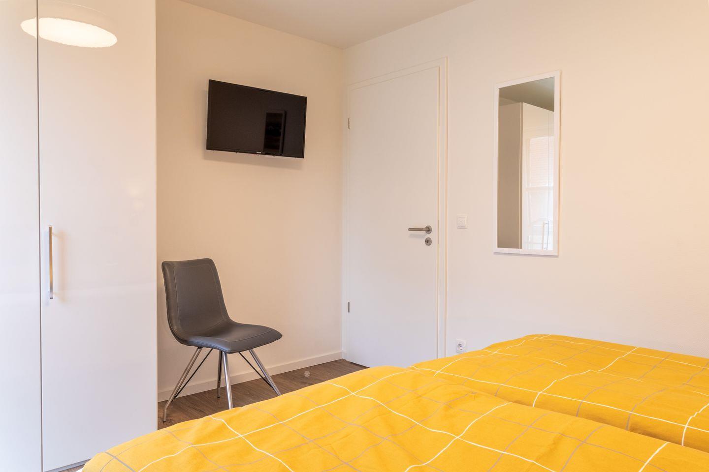 Zwei Schlafzimmer mit hochwertigen Boxspringbetten und Verdunkelungsplissees garantieren erholsame Nächte. Beide Zimmer sind mit TV ausgestattet – ideal für entspannte Abende oder ruhige Rückzugsorte nach einem erlebnisreichen Tag.