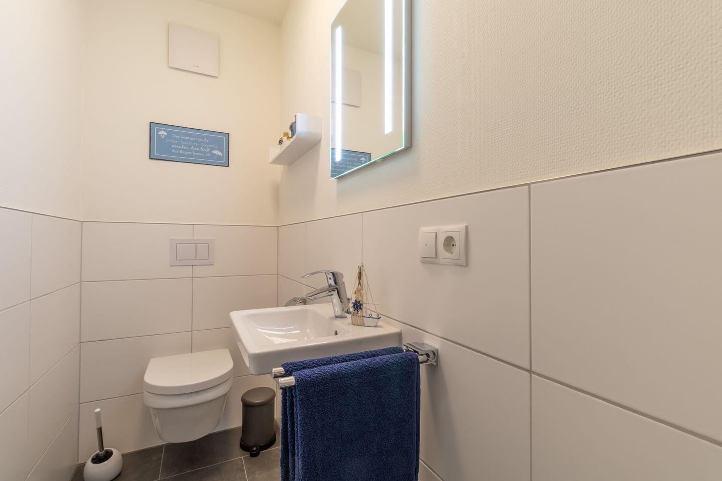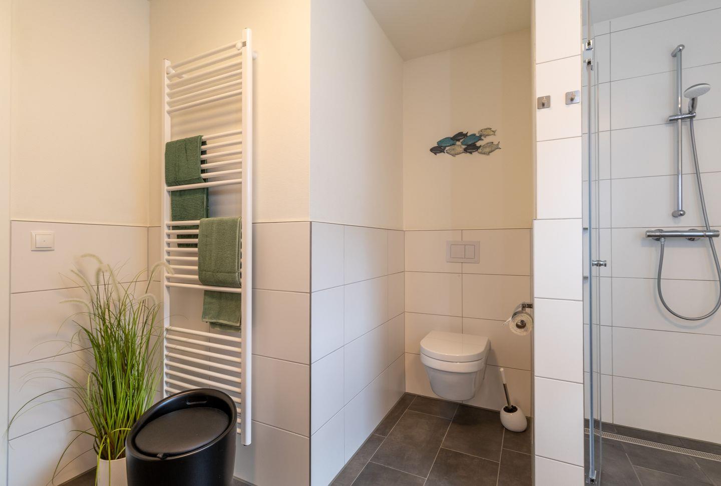 Im modernen Badezimmer wartet deine private Sauna auf dich. Die bodengleiche Dusche, eine Handtuchheizung und geschmackvolle Ausstattung schaffen deine ganz persönliche Wellnessoase. Zusätzlich steht dir ein separates Gäste-WC zur Verfügung.
