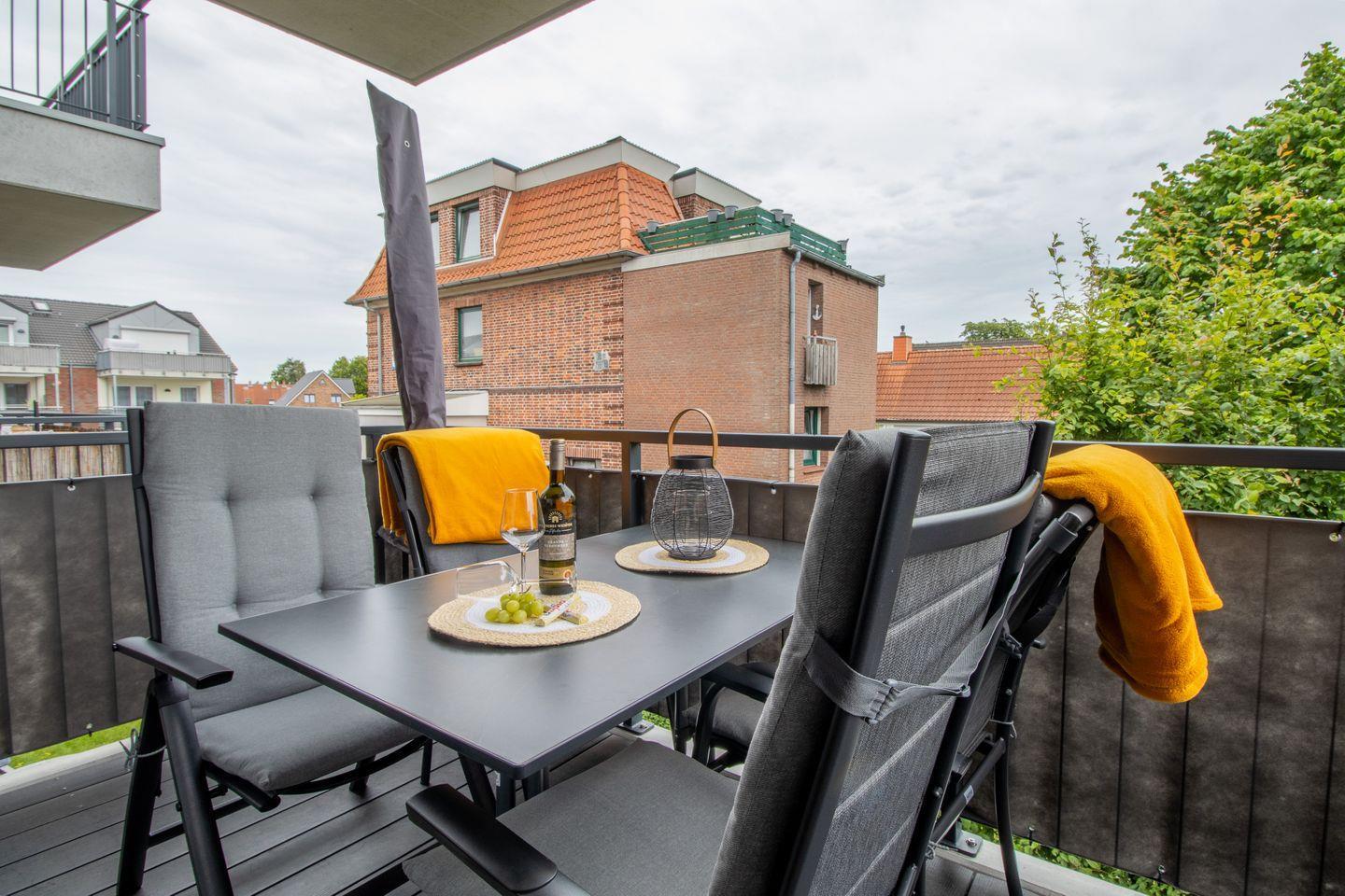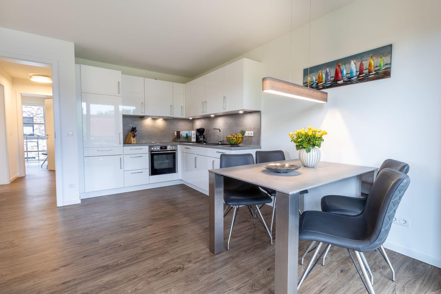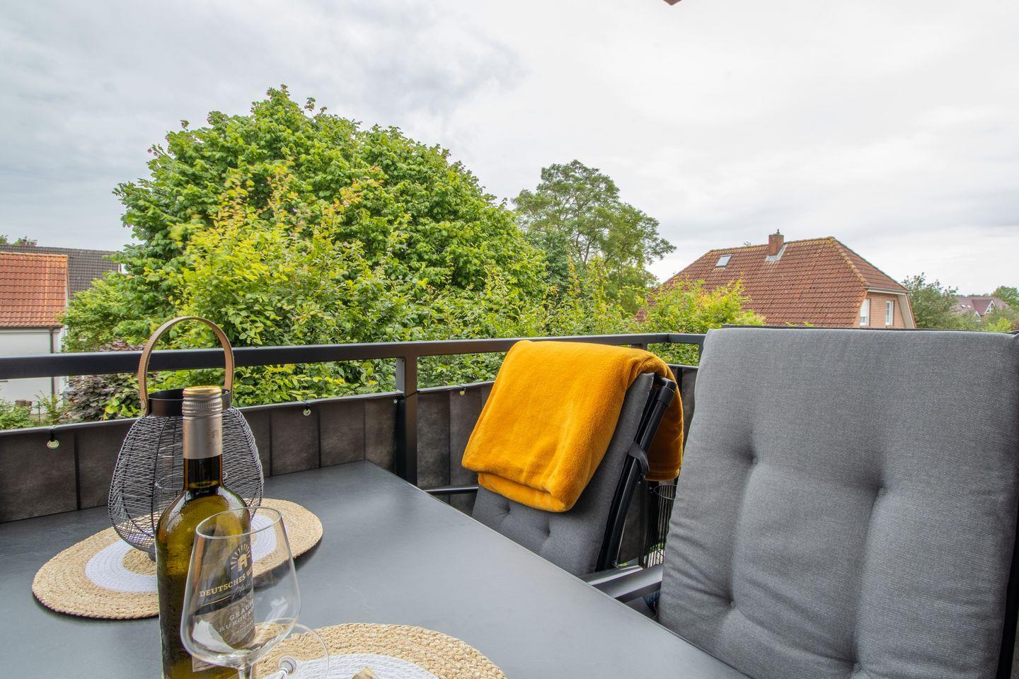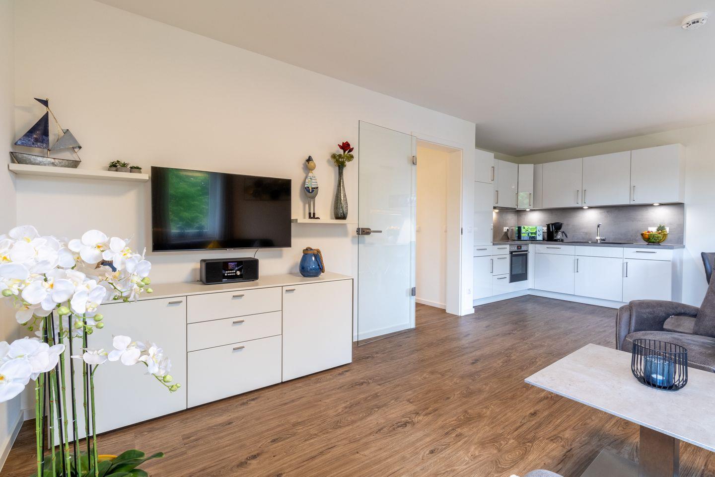 Der helle Wohnbereich überzeugt mit harmonischem Farbkonzept und einer gemütlichen Wohnlandschaft, die auch als zusätzliche Schlafmöglichkeit genutzt werden kann. Die offene Küche ist voll ausgestattet und lädt zu gemeinsamen Kochabenden ein. Vom überdachten Balkon blickst du ins Grüne – ein perfekter Platz für eine Tasse Kaffee am Morgen oder entspannte Abende.