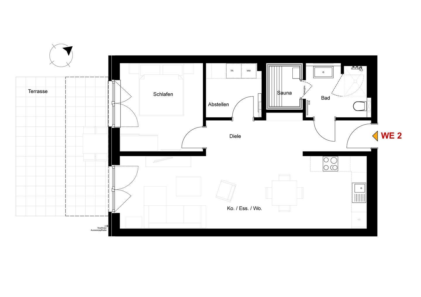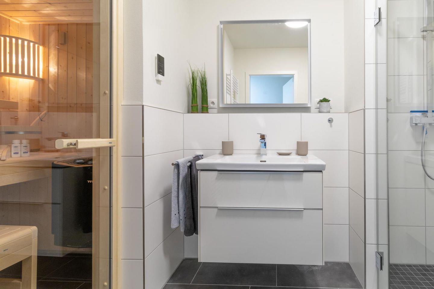 Das moderne Bad verfügt über eine bodentiefe Dusche und eine private Sauna. Hier startest du entspannt in den Tag oder lässt ihn ruhig ausklingen.