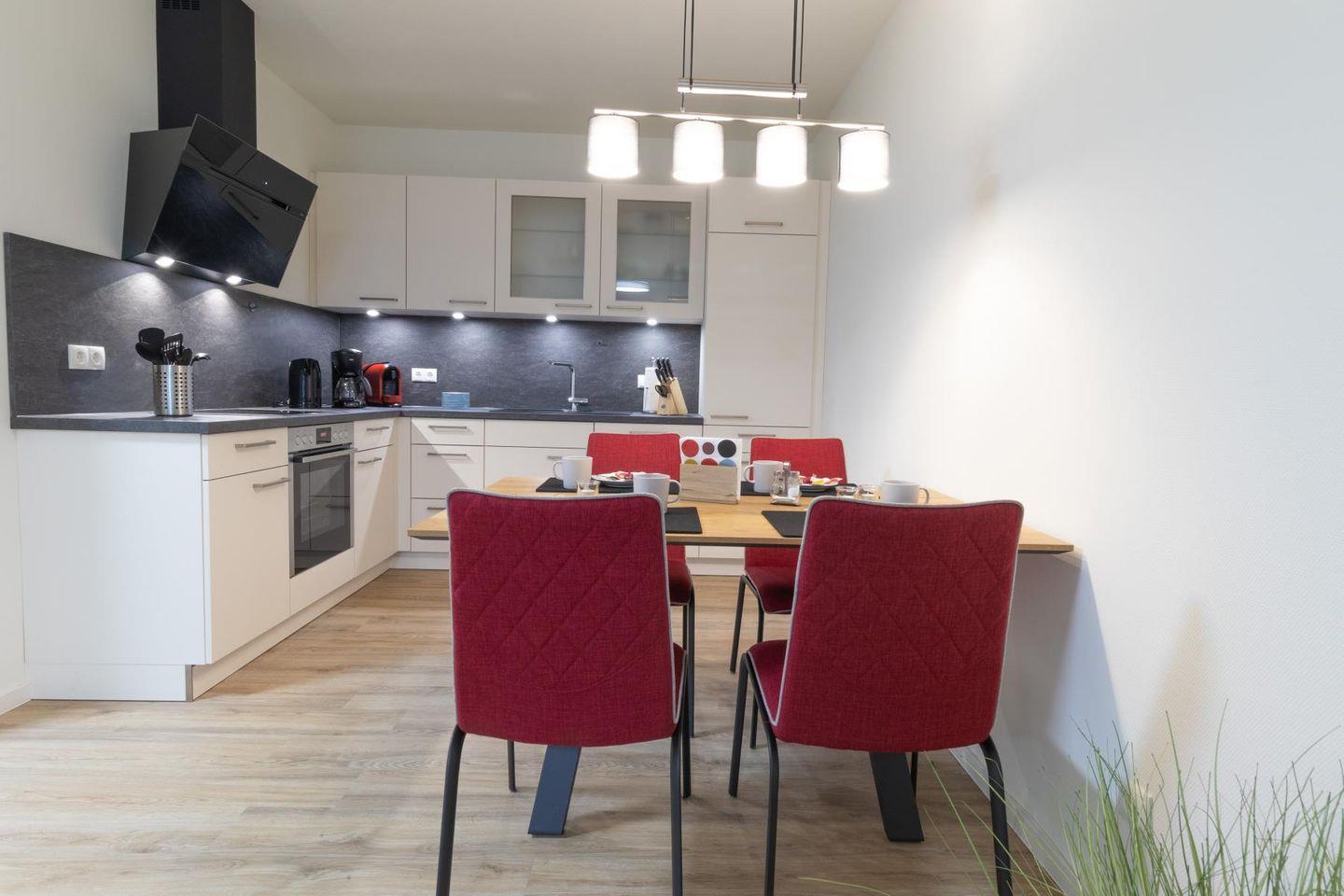 Du nutzt einen Aufzug vom Tiefgaragenstellplatz bis zur Wohnung. In der Tiefgarage (max. Durchfahrtshöhe 2,15 m) steht dir ein abschließbarer Fahrradraum zur Verfügung. Der Check-in erfolgt kontaktlos über einen Schlüsseltresor. Ein Strandkorb auf der Terrasse gehört zur Ausstattung.