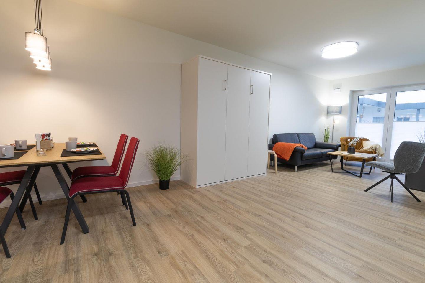 Der Wohnbereich ist offen gestaltet und lichtdurchflutet. Große Fenster führen direkt auf die Terrasse. Das hochwertige Schrankbett bietet zwei weitere Schlafplätze und lässt sich tagsüber platzsparend verstauen. Die offene Küche ist voll ausgestattet und ideal für gemeinsame Mahlzeiten am angrenzenden Esstisch.