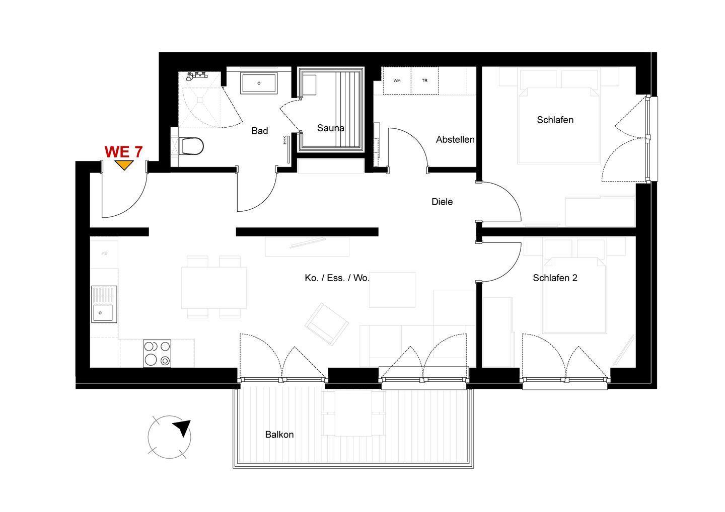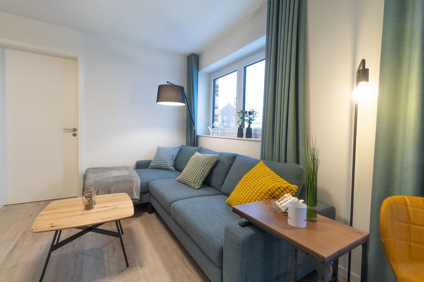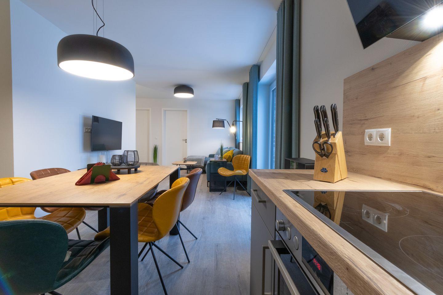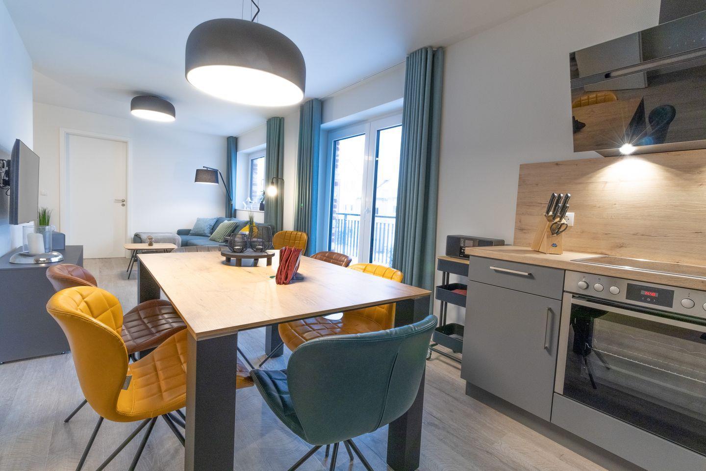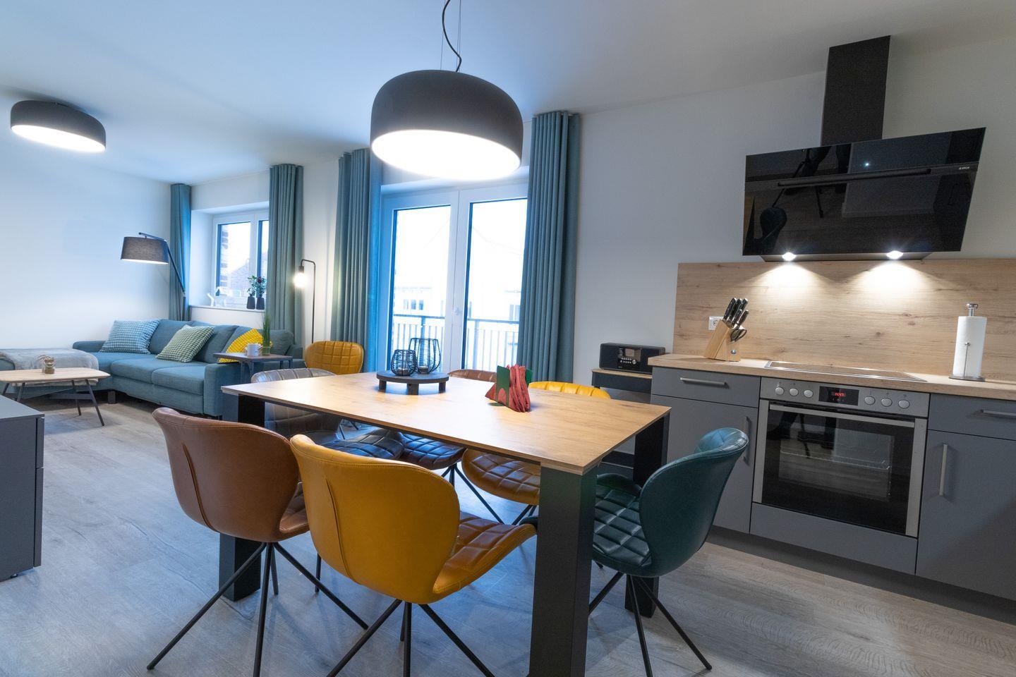 Der lichtdurchflutete Wohnbereich mit gemütlicher Couch (inkl. Schlaffunktion) lädt zum Entspannen ein. Große Fenster und der Zugang zum sonnigen Balkon sorgen für echtes Urlaubsfeeling. In der offenen, voll ausgestatteten Küche bereitest du mühelos gemeinsame Mahlzeiten zu – ideal für lange Frühstücke oder ein entspanntes Abendessen.