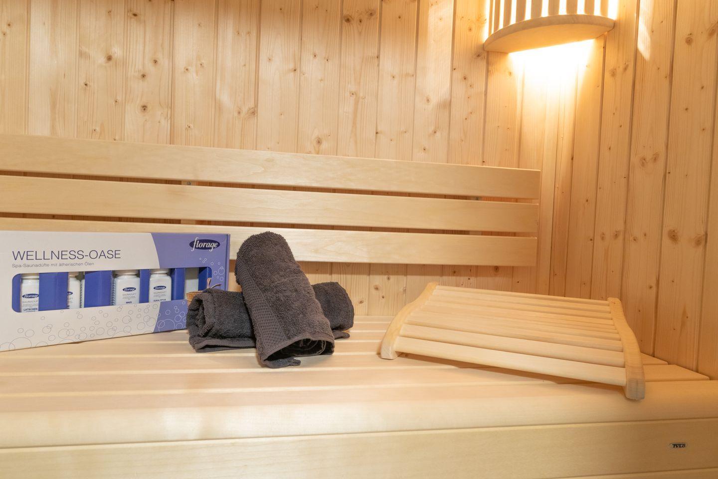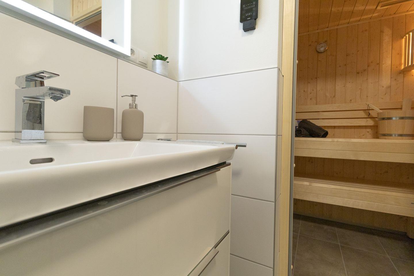 Das Badezimmer wird zur privaten Wellnessoase: Eine bodengleiche Dusche und deine eigene Sauna laden zu entspannten Momenten nach einem Strandtag oder Ausflug ein.